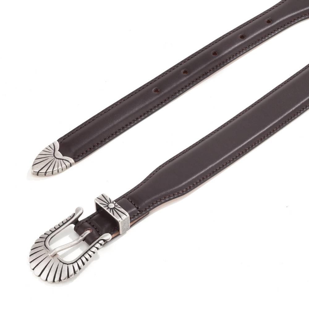 Классический ремень в стиле вестерн флорентийского бренда Santa Trinita. Изготовлен из натуральной телячьей кожи тёмно-коричневого цвета на небольшом семейном предприятии в Тоскане — регионе, знаменитом своими вековыми кожевенными традициями. Внутренняя часть аксессуара выполнена из тонкой кожи растительного дубления, что обеспечивает исключительную прочность и комфорт при носке.