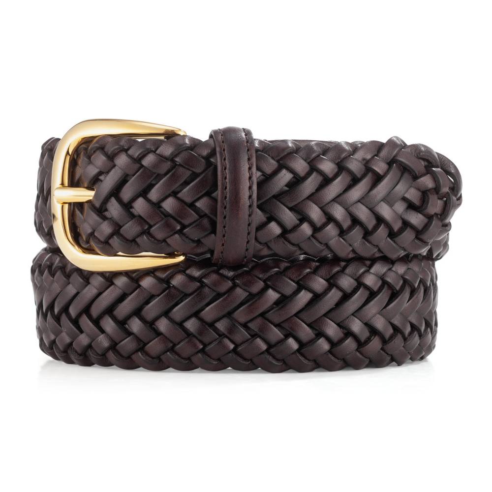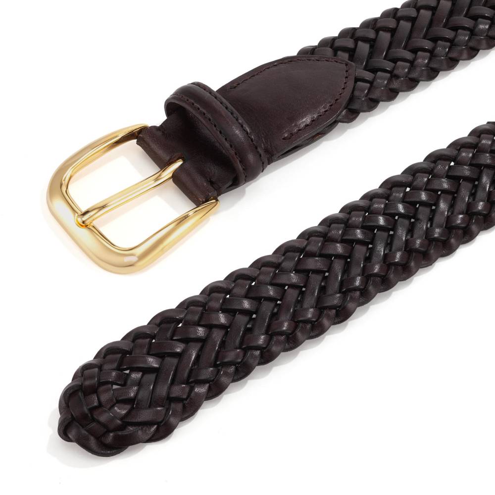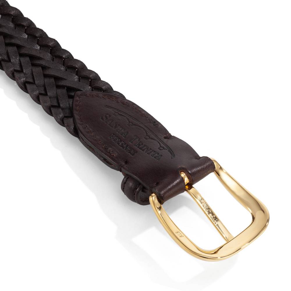 Плетёный ремень флорентийского бренда Santa Trinita. Изготовлен вручную из телячьей кожи тёмно-коричневого цвета на небольшом семейном предприятии в Тоскане — регионе, знаменитом своими вековыми кожевенными традициями. Плетение и сложная ручная работа обеспечивает эластичность и идеальную посадку по фигуре.