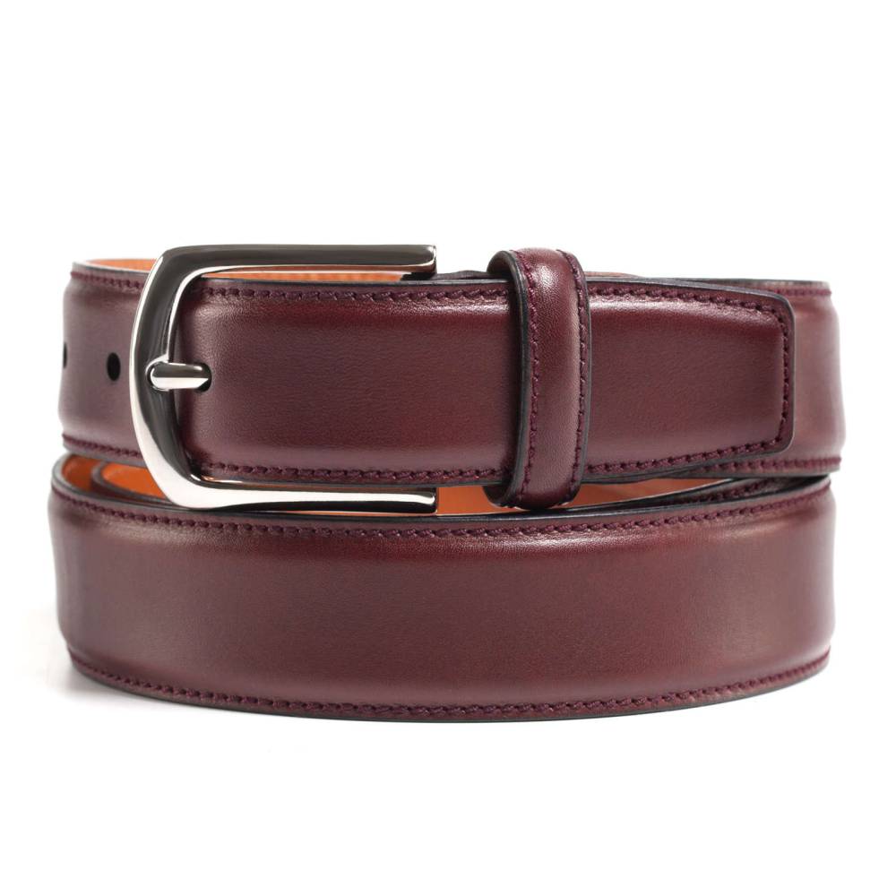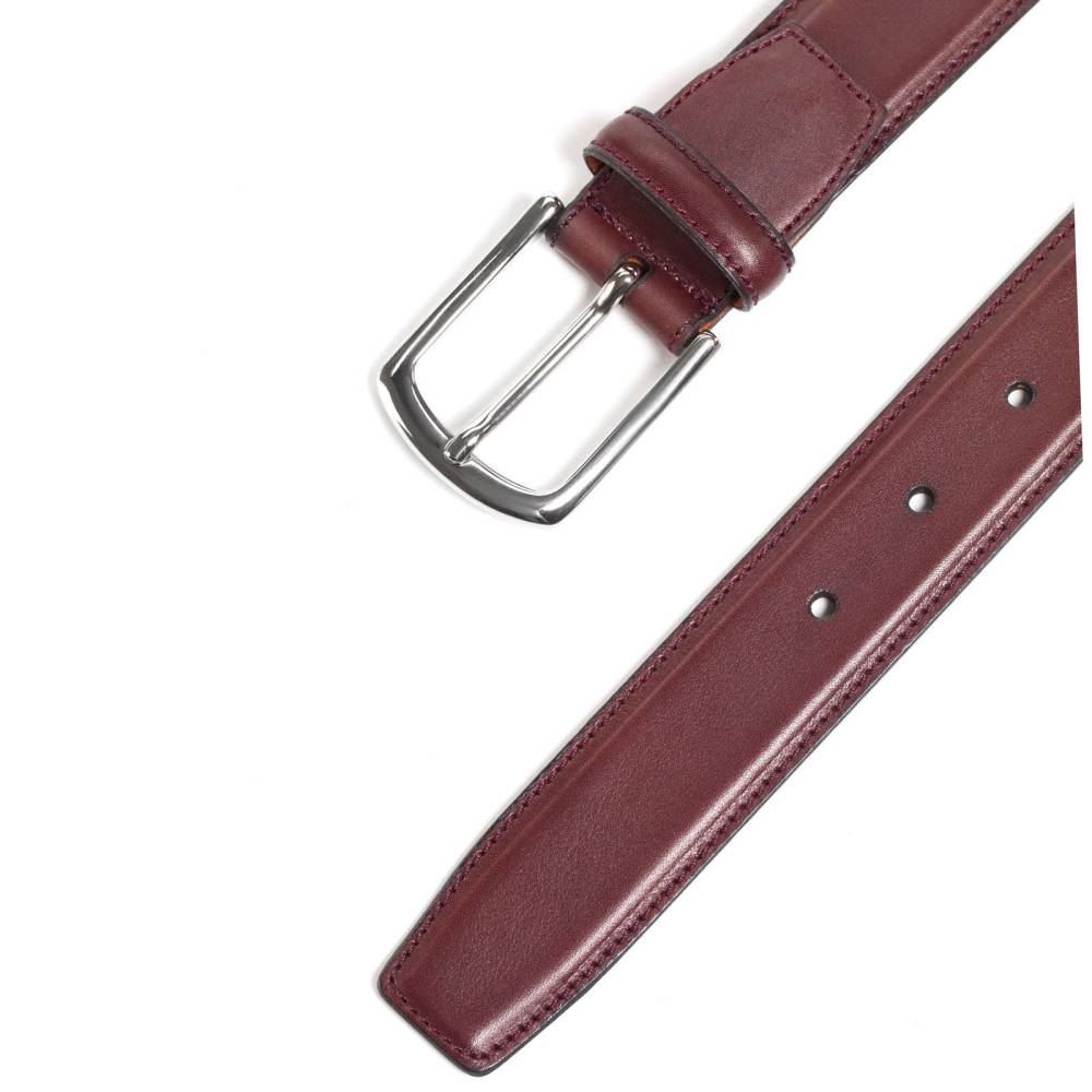 Мужской классический ремень испанской компании Yanko из натуральной кожи бордового цвета. Модель имеет серебристую пряжку из полированного металла с закруглёнными краями. К ремню прилагается фирменный текстильный кофр тёмно-синего цвета.