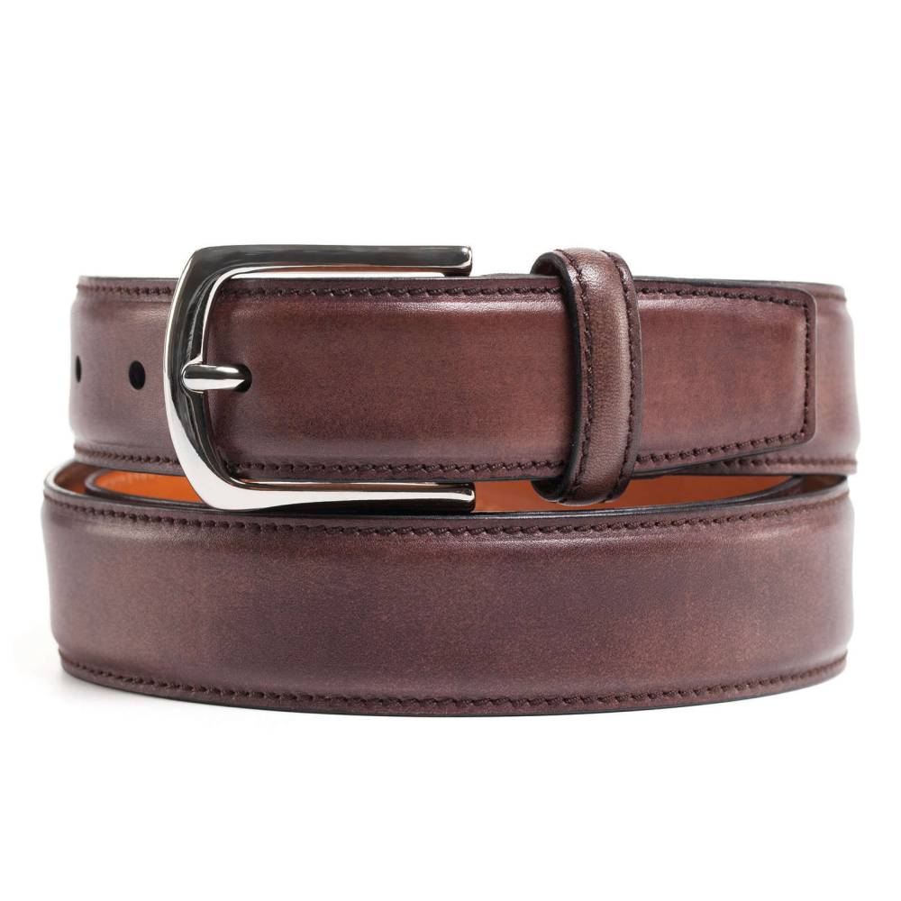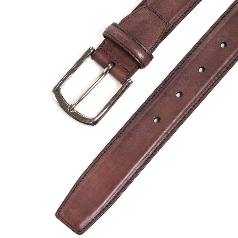 Мужской классический ремень испанской компании Yanko из натуральной кожи, неравномерно окрашенной в коричневый цвета. Модель имеет серебристую пряжку из полированного металла с закруглёнными краями. К ремню прилагается фирменный текстильный кофр тёмно-синего цвета.