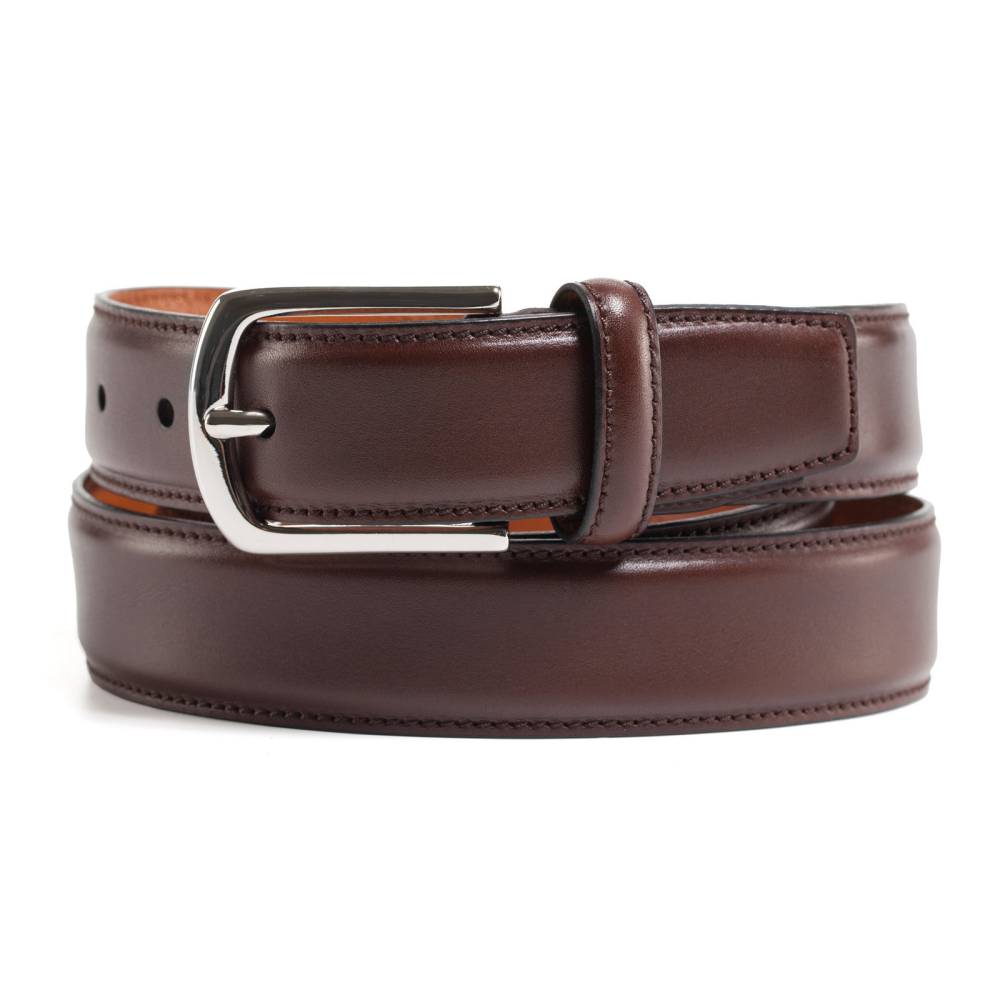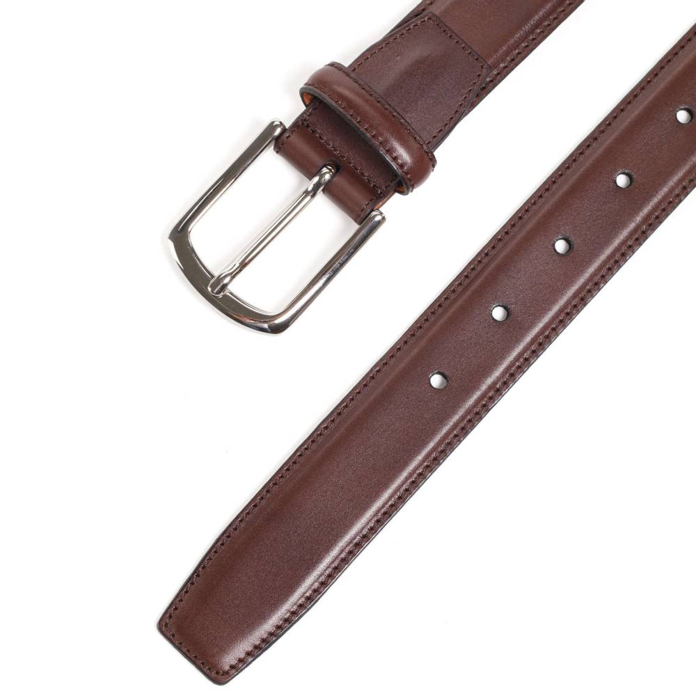 Мужской классический ремень испанской компании Yanko из натуральной кожи тёмно-коричневого цвета. Модель имеет серебристую пряжку из полированного металла с закруглёнными краями. К ремню прилагается фирменный текстильный кофр тёмно-синего цвета.