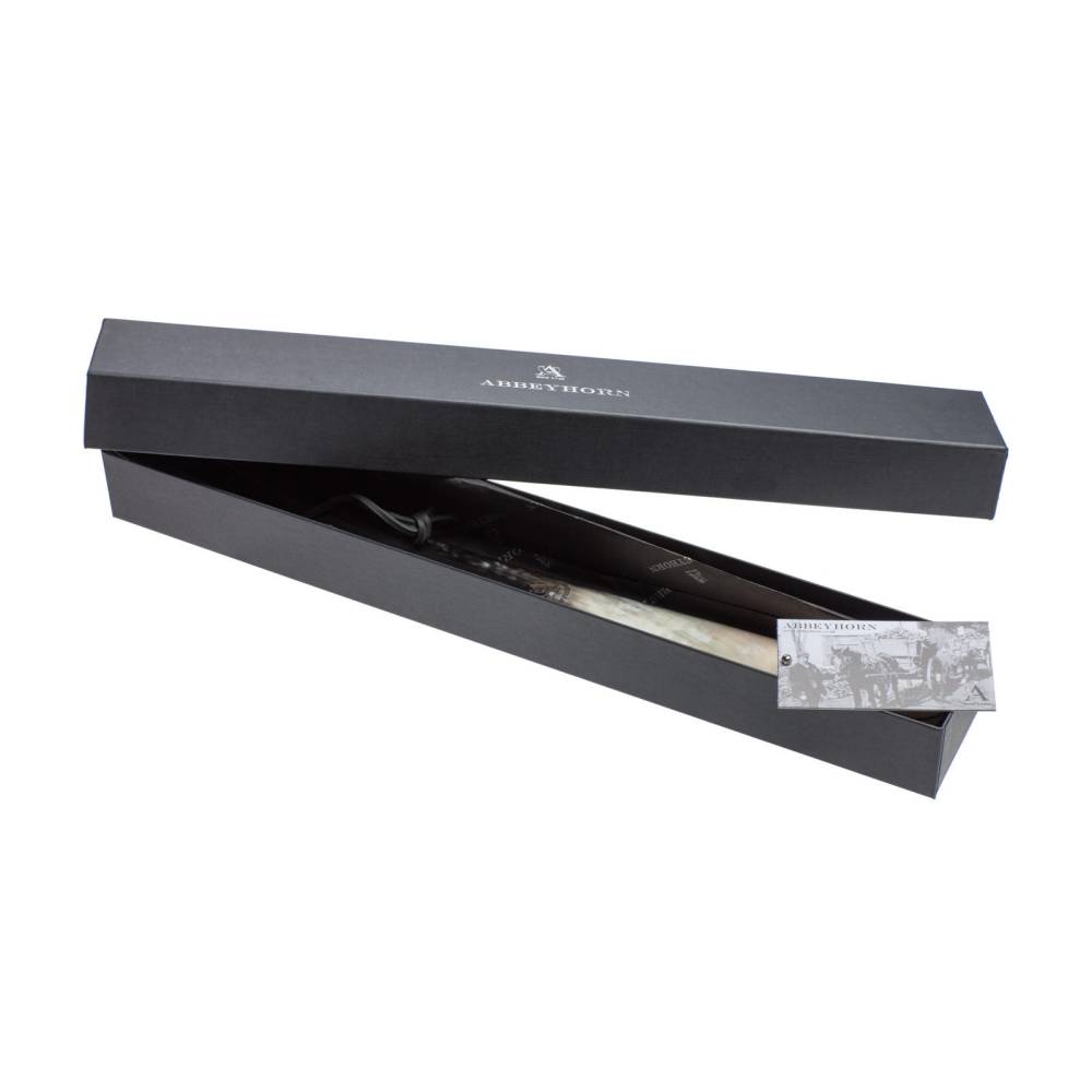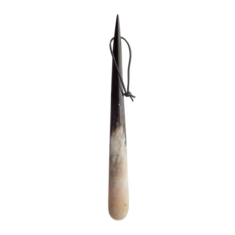 Роскошный коллекционный обувной рожок Abbeyhorn выполнен из цельного куска обработанного бычьего рога чёрного цвета. Такой оттенок рога встречается достаточно редко и обладает особым благородным узором. С внешней стороны рожок украшен золотистым логотипом бренда.