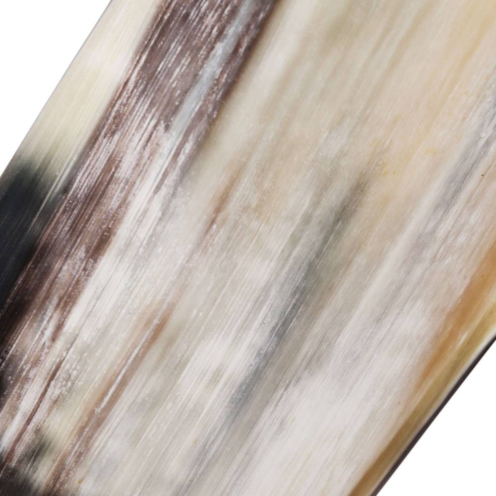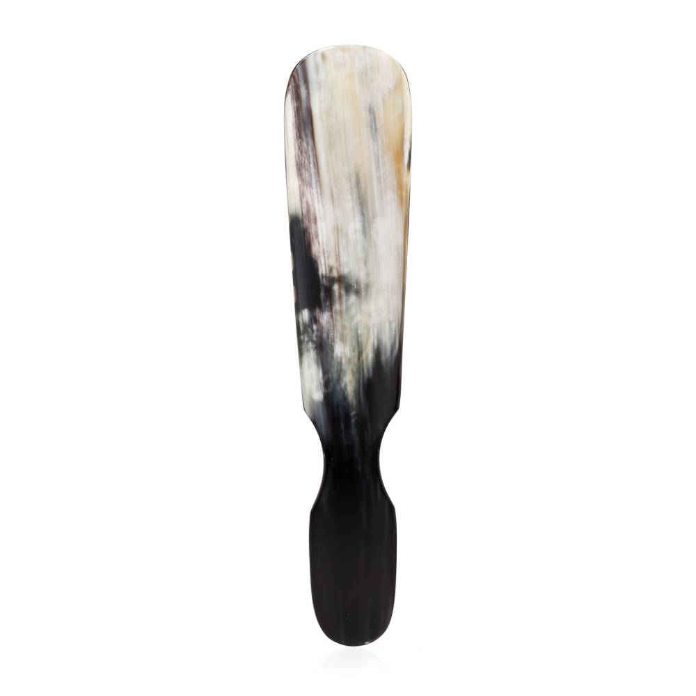Компактный дорожный рожок для обуви Abbeyhorn. Модель выполнена из цельного куска обработанного бычьего рога чёрного цвета. Такой оттенок рога встречается достаточно редко и обладает особым благородным узором. С внешней стороны аксессуар украшен логотипом бренда.