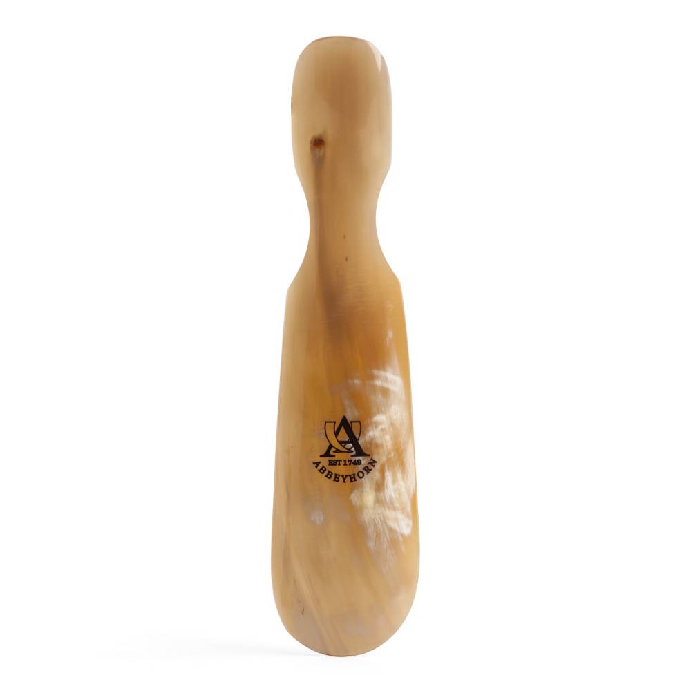 Компактный дорожный рожок для обуви Abbeyhorn. Модель выполнена из цельного куска обработанного бычьего рога натурально цвета. С внешней стороны аксессуар украшен логотипом бренда.