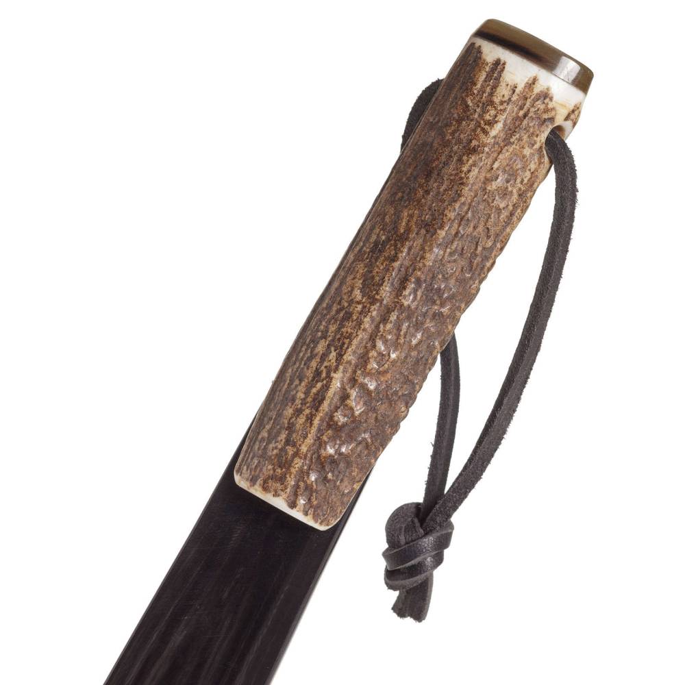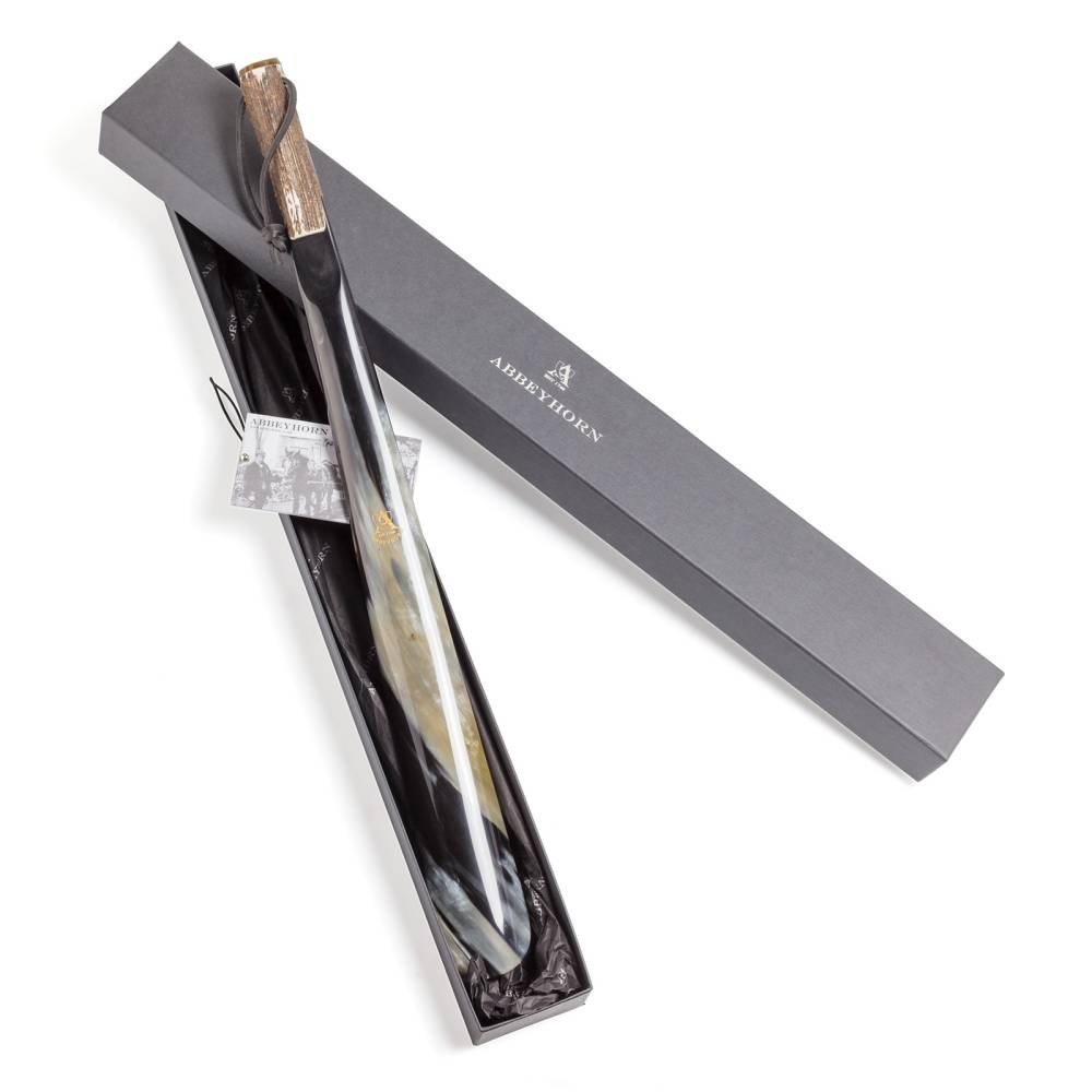 Роскошный коллекционный обувной рожок Abbeyhorn выполнен из цельного куска обработанного бычьего рога чёрного цвета. Такой оттенок рога встречается достаточно редко и обладает особым благородным узором. Ручка выполнена из оленьего рога и дополнена петлёй из натуральной кожи. С внешней стороны рожок украшен золотистым логотипом бренда.