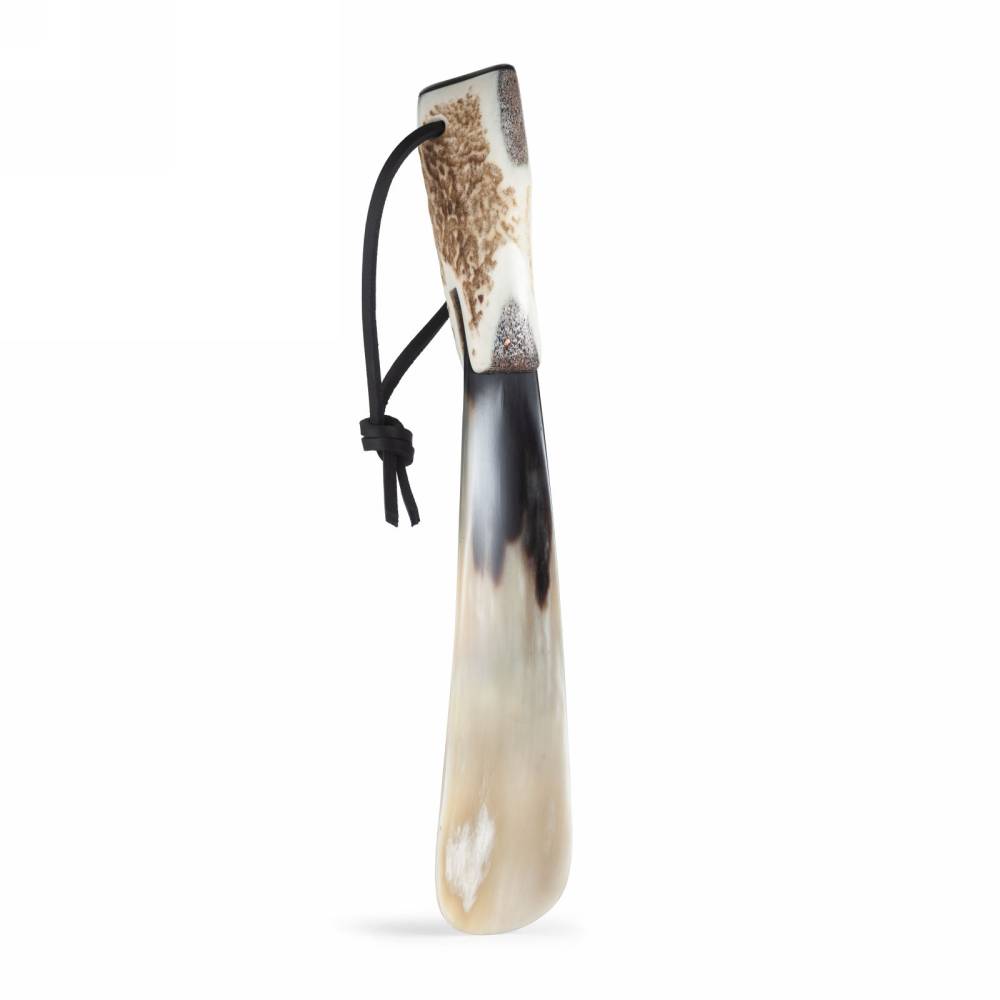 Компактный коллекционный обувной рожок Abbeyhorn выполнен из цельного куска обработанного бычьего рога бежевого цвета с естесственным рисунком. Ручка выполнена из оленьего рога и дополнена петлёй из натуральной кожи. С внешней стороны рожок украшен золотистым логотипом бренда.