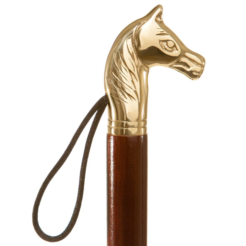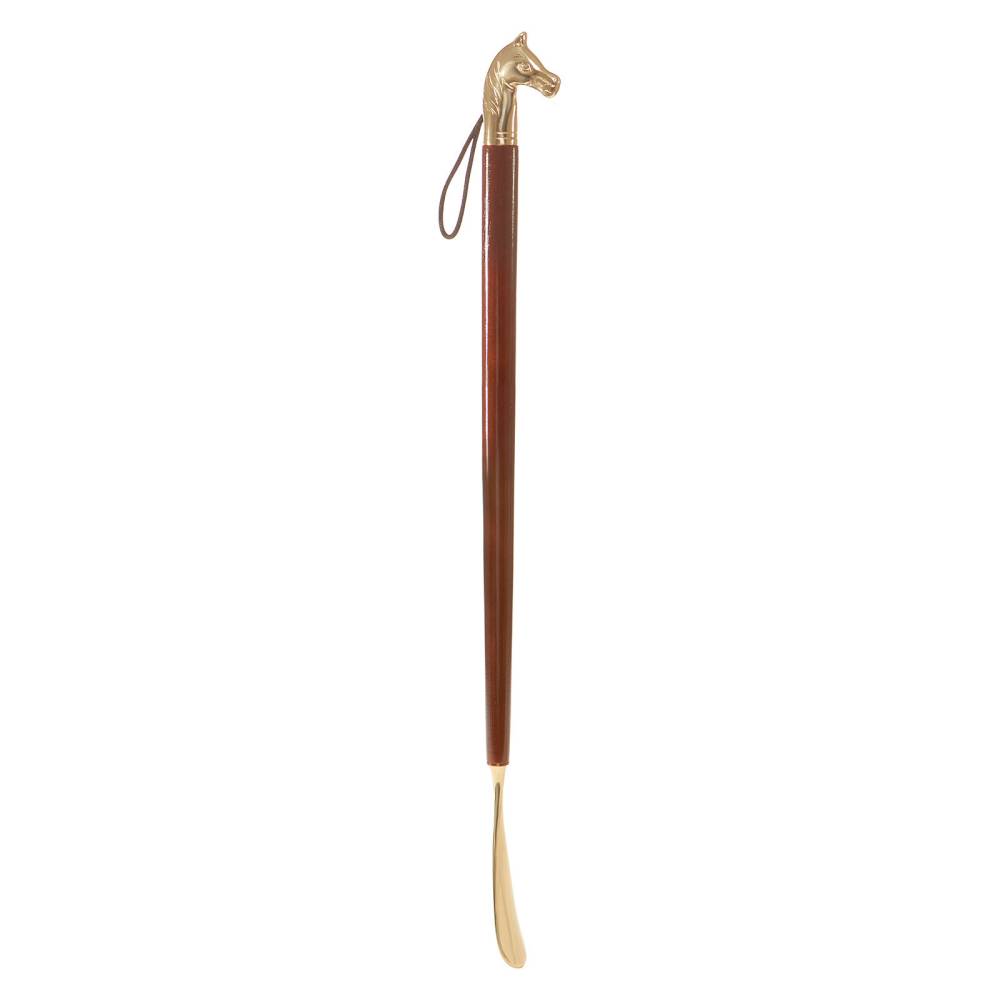 Рожок для обуви французской марки Saphir с ручкой в виде головы коня и ложкой из латуни. Основа рожка выполнена из натурального дерева, окрашена в коричневый цвет и покрыта лаком. Ручка дополнена текстильной петлёй.