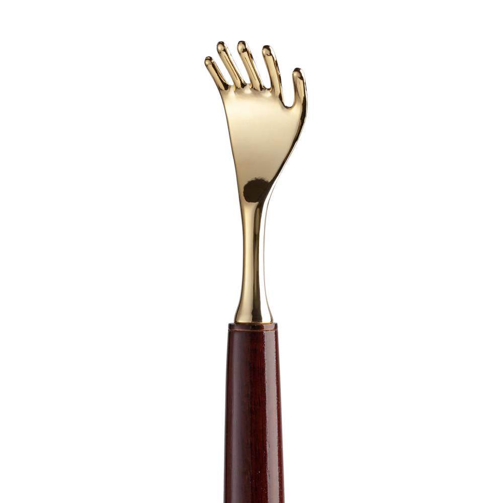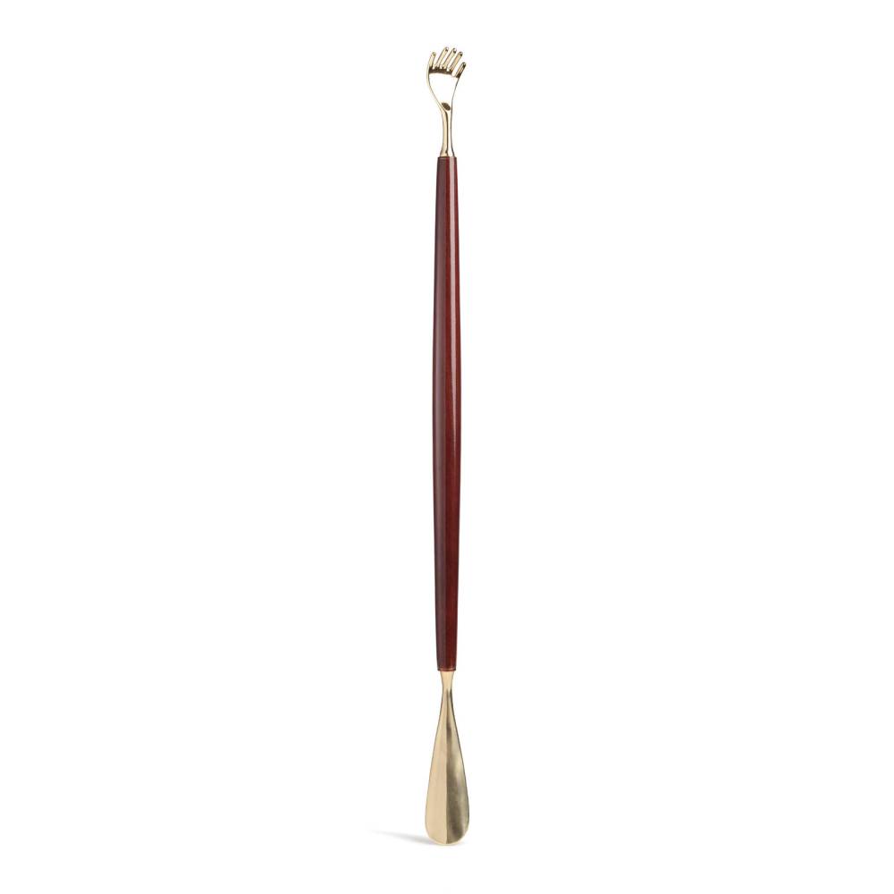 Рожок для обуви французской марки Saphir с ручкой в виде кисти руки и ложкой из латуни. Основа рожка выполнена из натурального дерева, окрашена в коричневый цвет и покрыта лаком. Ручка дополнена текстильной петлёй.