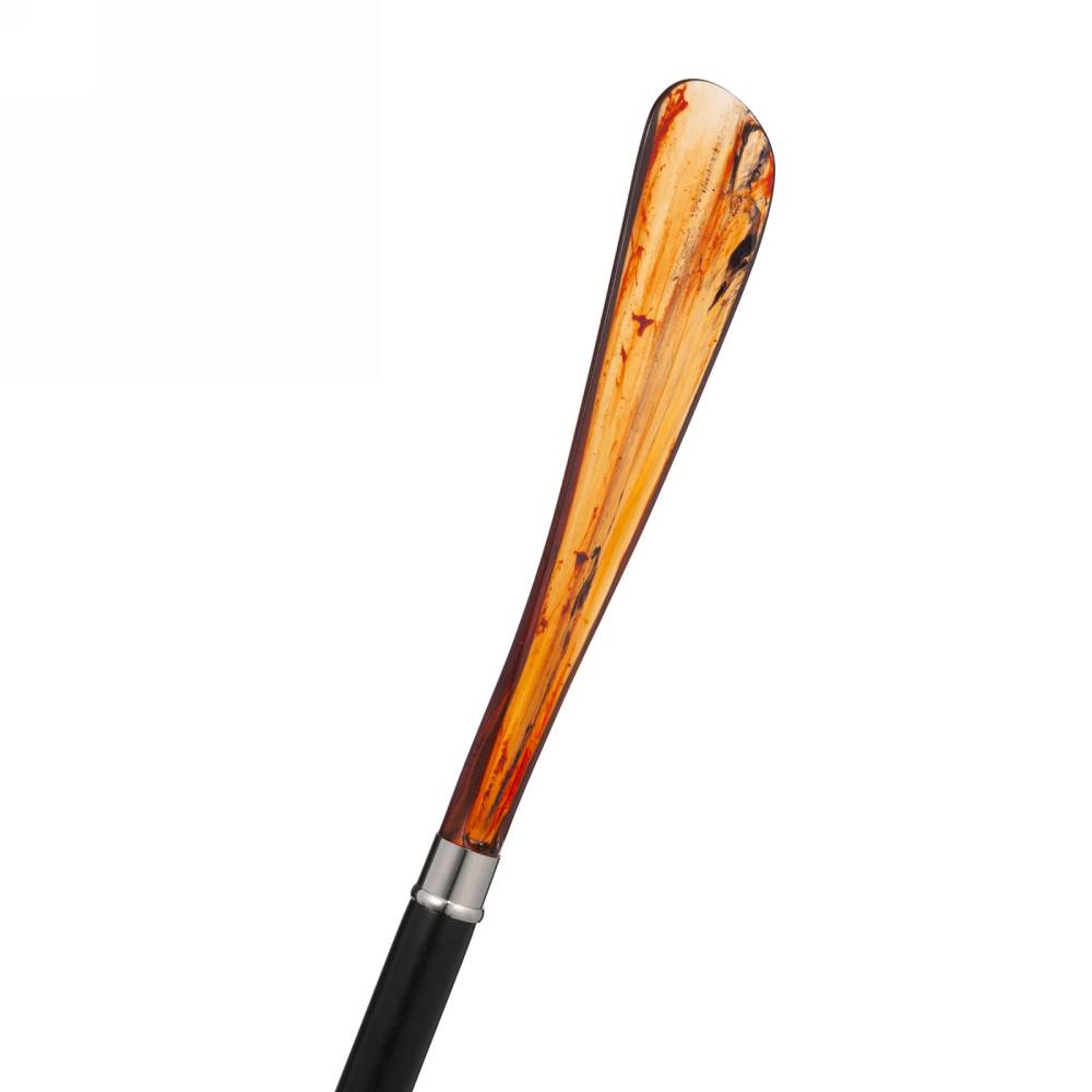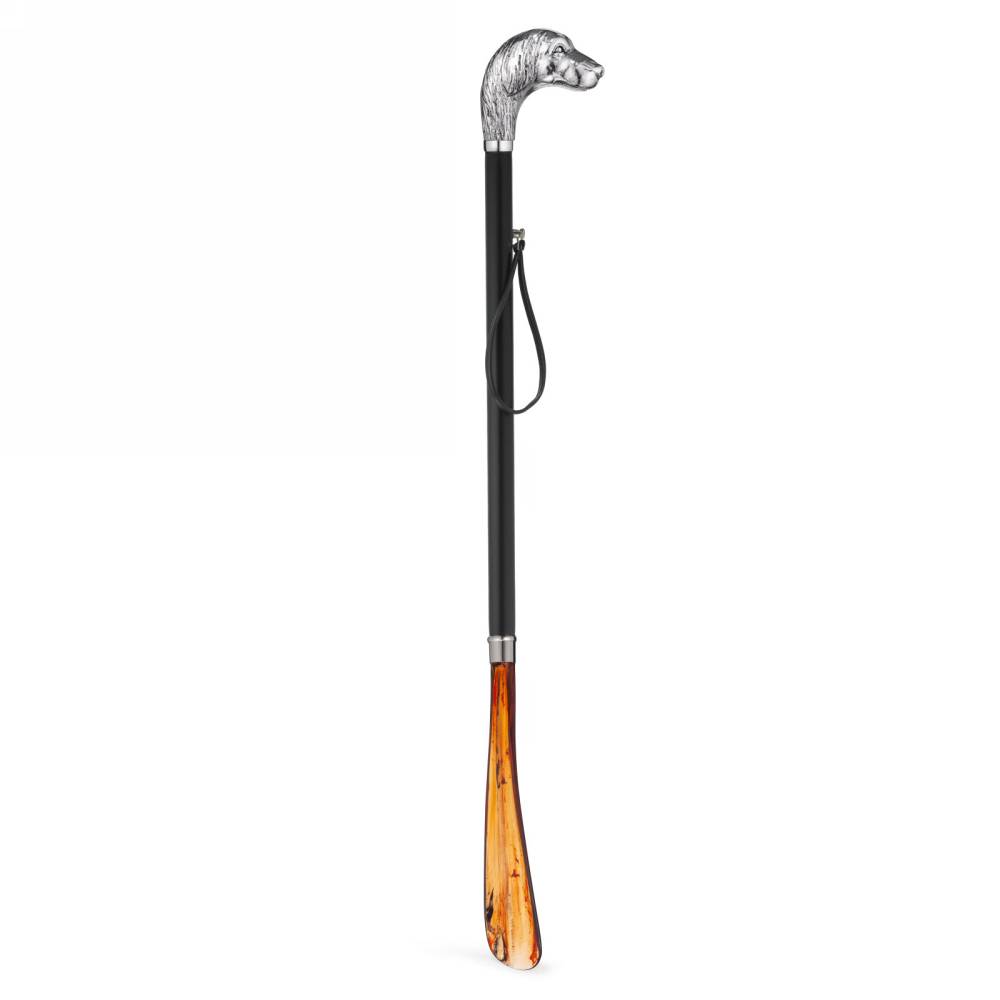 Изысканный рожок для обуви немецкой марки Comfort Concept (бывший бренд Nico, входивишй в холдинг BNS) с алюминиевой ручкой в виде головы собаки. Основание выполнено из дерева чёрного цвета, покрытого лаком, а ложка – из прозрачного пластика янтарного оттенка. Ручка дополнена кожаной петлёй для удобного подвешивания. Рожок станет прекрасным подарком ценителю хорошей обуви и отлично дополнит интерьер прихожей или гардеробной комнаты.