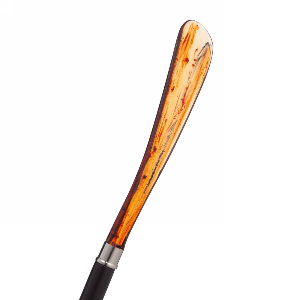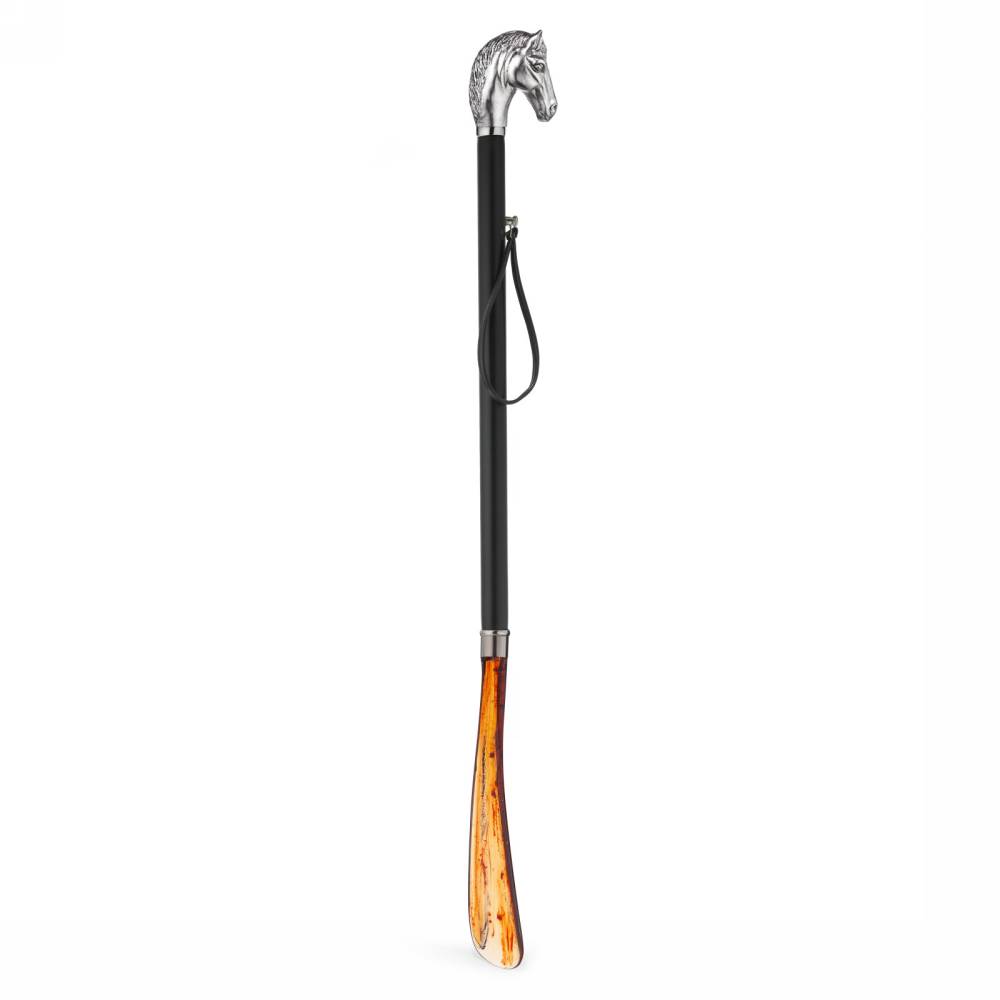 Изысканный рожок для обуви немецкой марки Comfort Concept (бывший бренд Nico, входивишй в холдинг BNS) с алюминиевой ручкой в виде головы лошади. Основание выполнено из дерева чёрного цвета, покрытого лаком, а ложка – из прозрачного пластика янтарного оттенка. Ручка дополнена кожаной петлёй для удобного подвешивания. Рожок станет прекрасным подарком ценителю хорошей обуви и отлично дополнит интерьер прихожей или гардеробной комнаты.