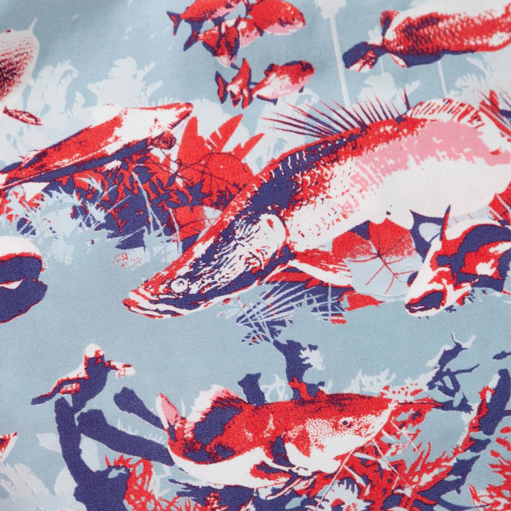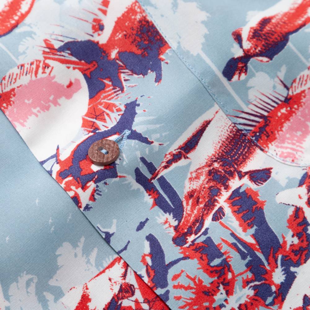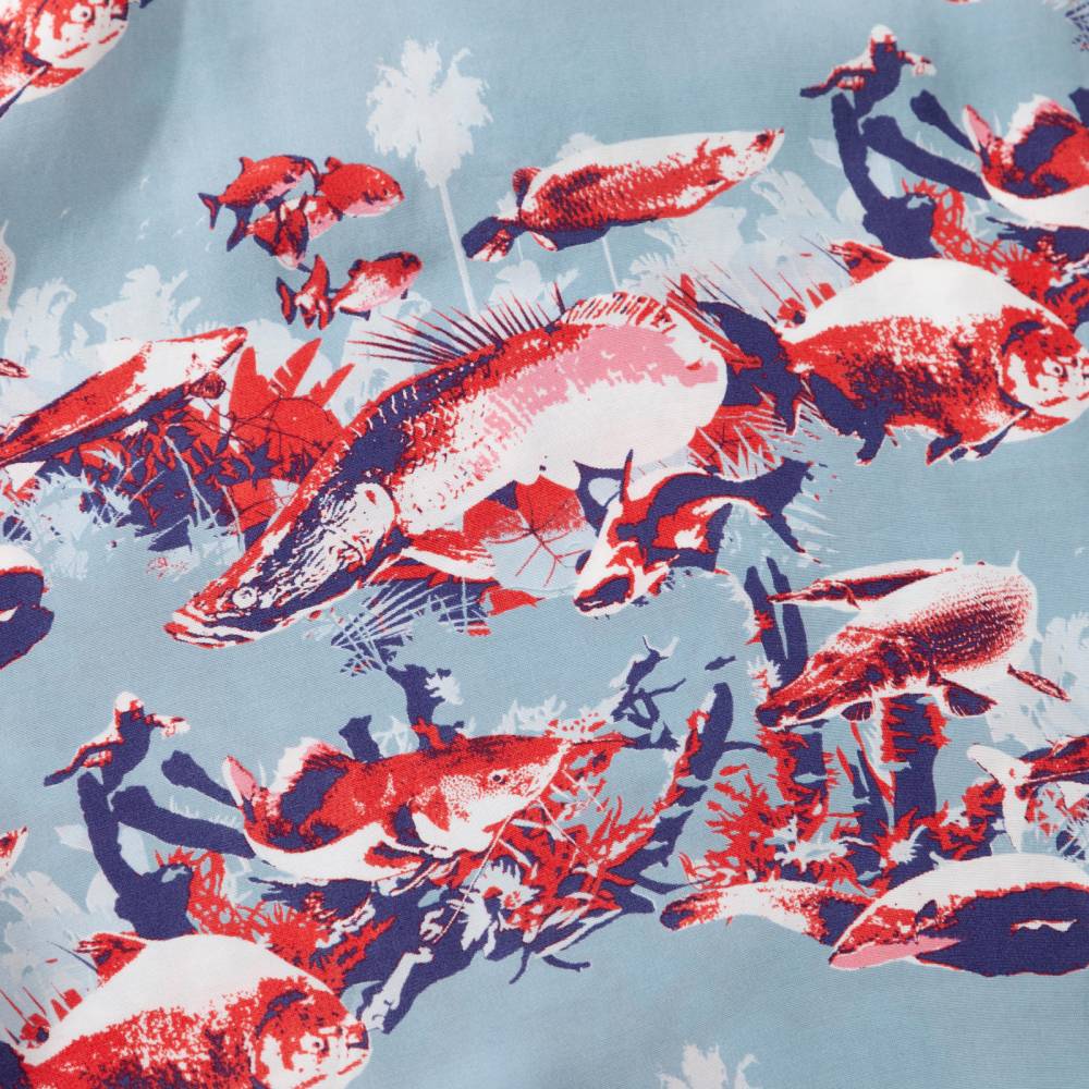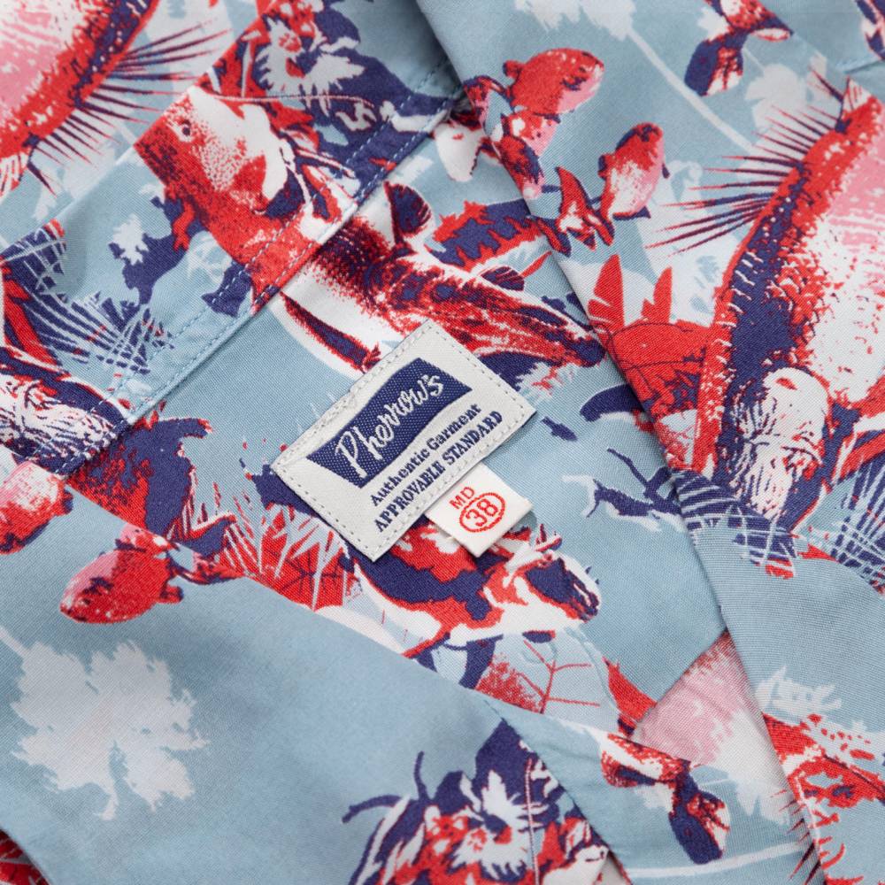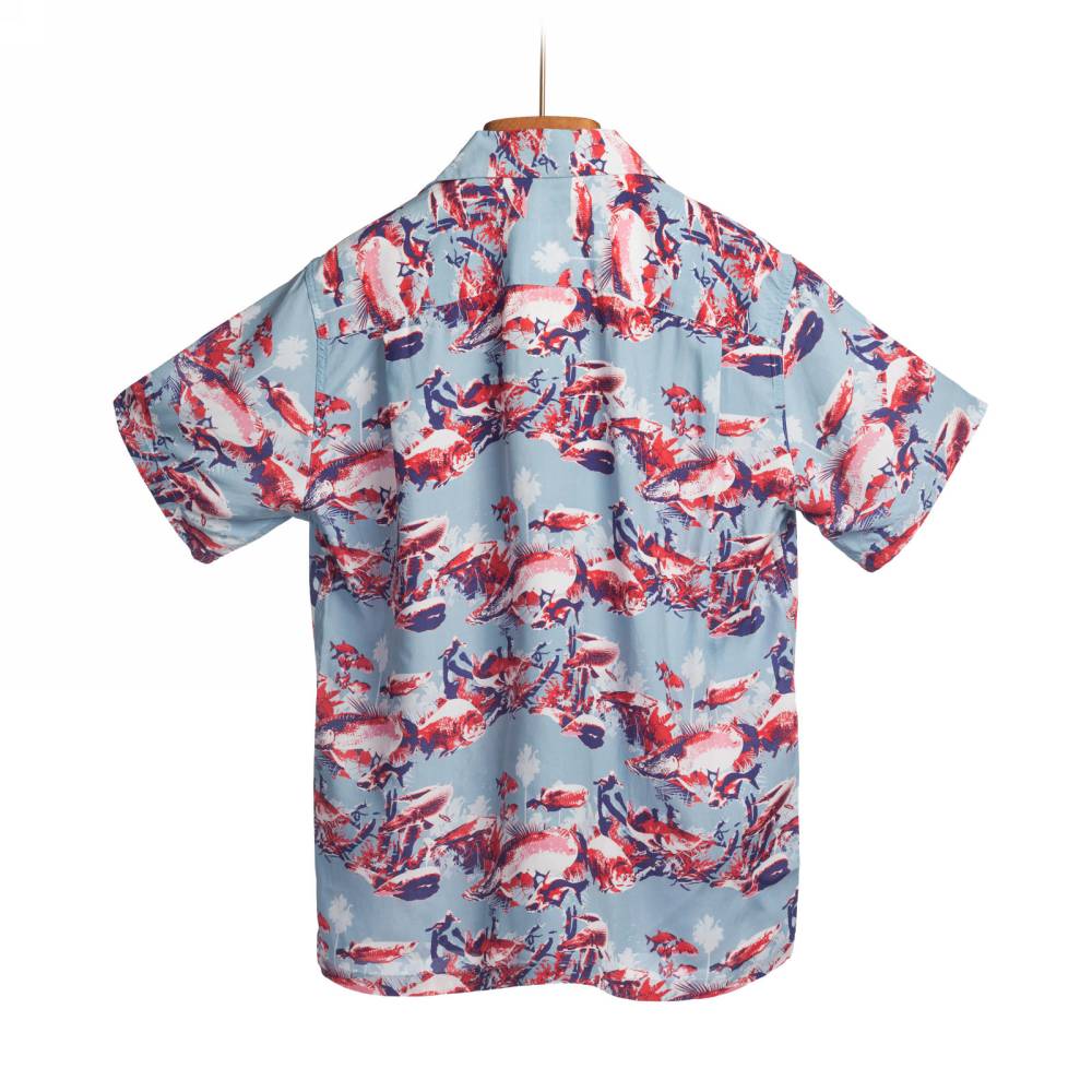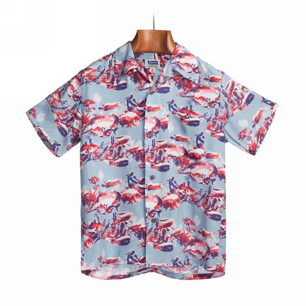 Яркая летная мужская рубашка Pherrow’s в гавайском стиле с коротким рукавом. Выполнена из района – лёгкой гладкой ткани, которая известна как искусственный шёлк. Ткань приглушённого голубого оттенка с принтами в виде рыб в красной, синей и белой цветовой гамме. Модель стандартного расслабленного силуэта не стесняет движения и приятна к телу. На спине расположены два защипа для большей свободы. Особенностью рубашки является оригинальный мягкий и широкий воротник с острыми краями, вдохновлённый винтажными гавайскими моделями. На груди слева имеется один карман, куда можно положить очки.