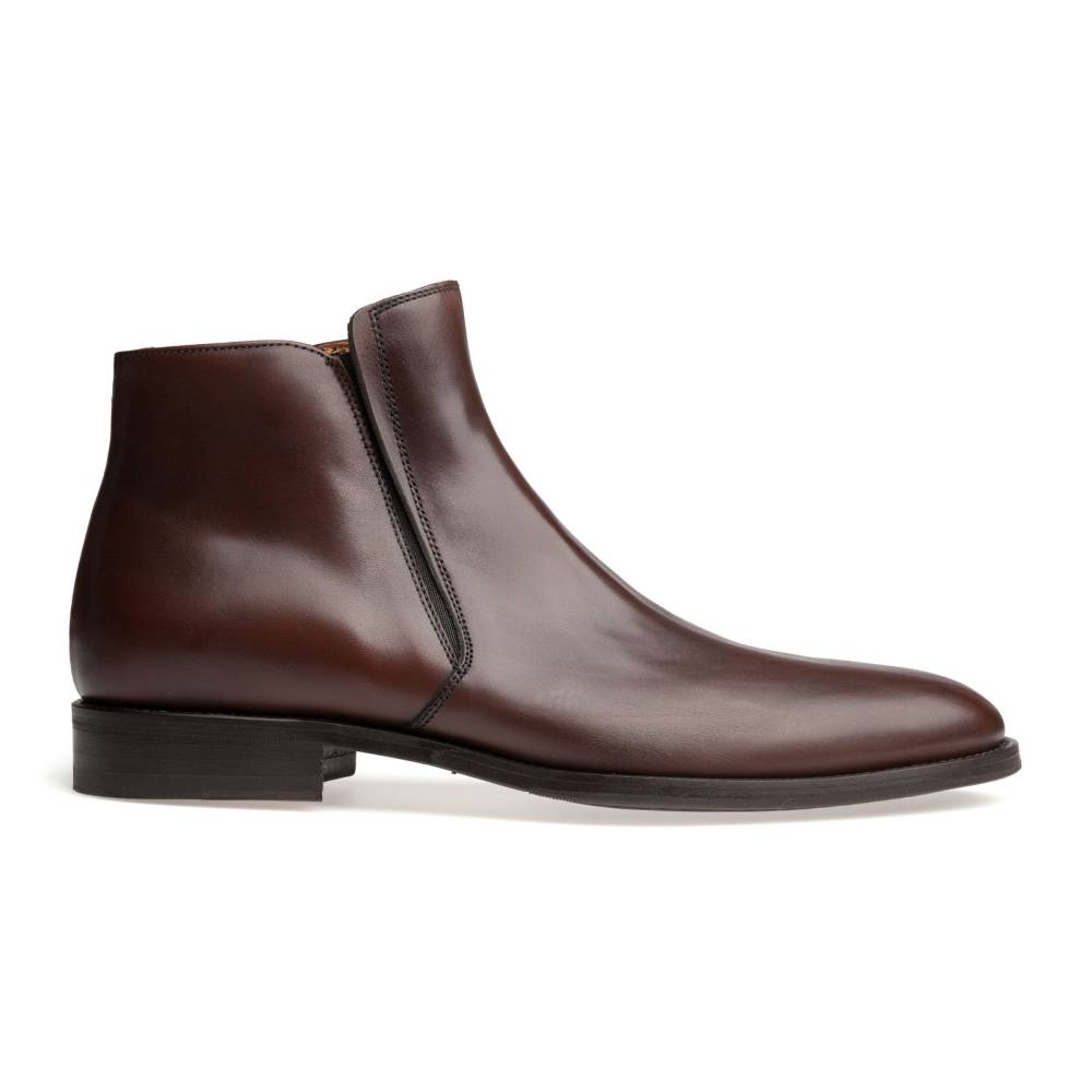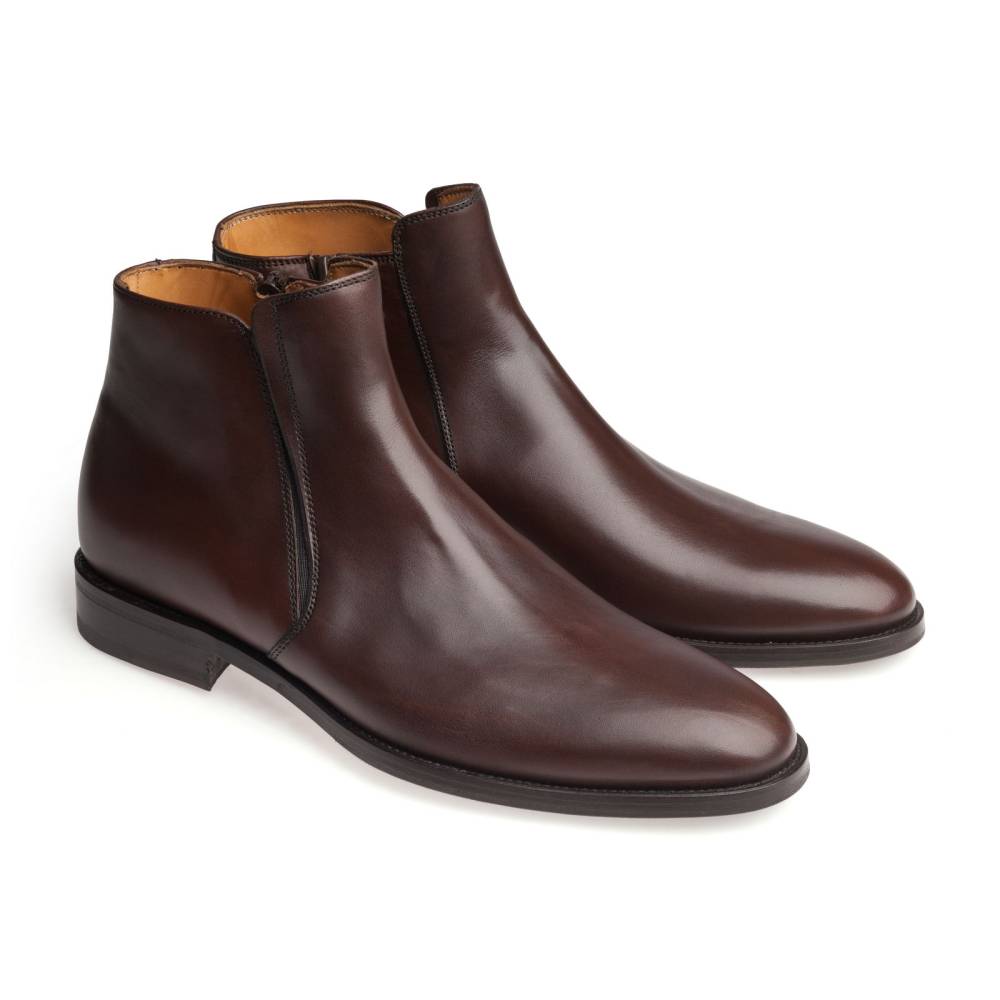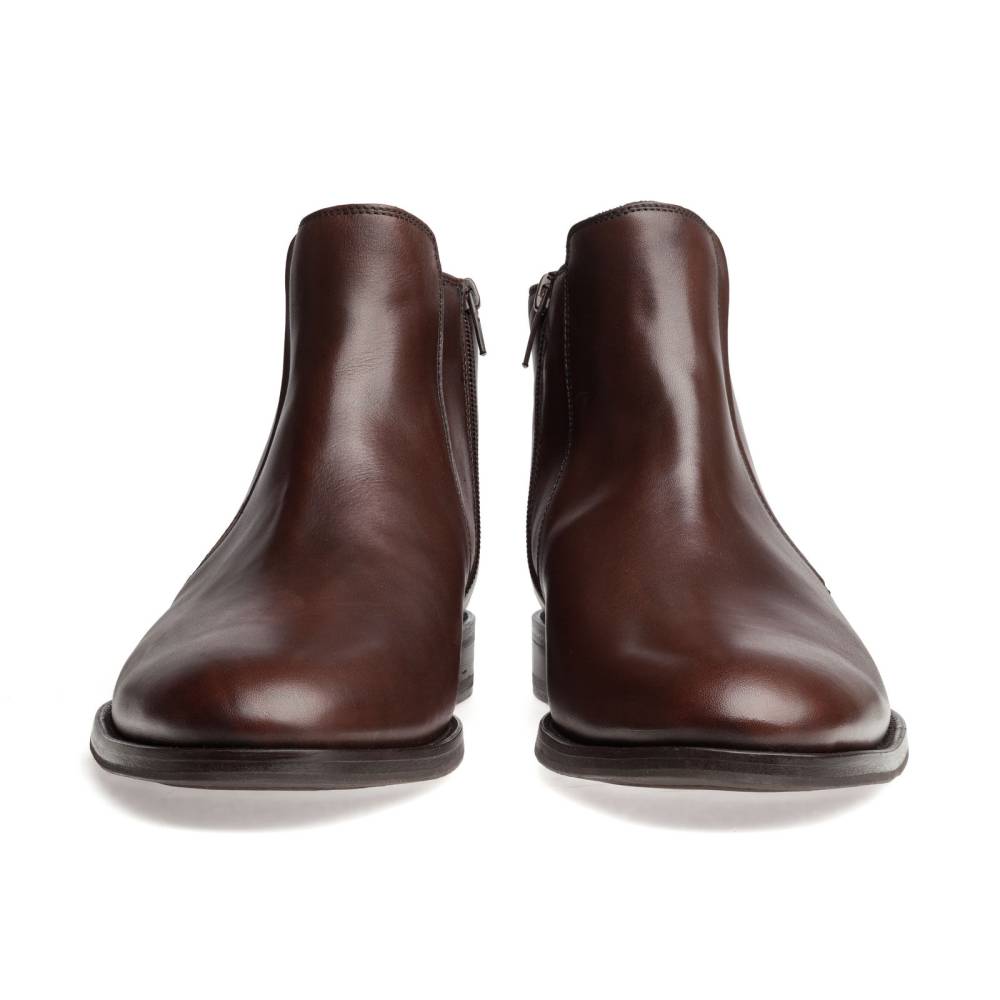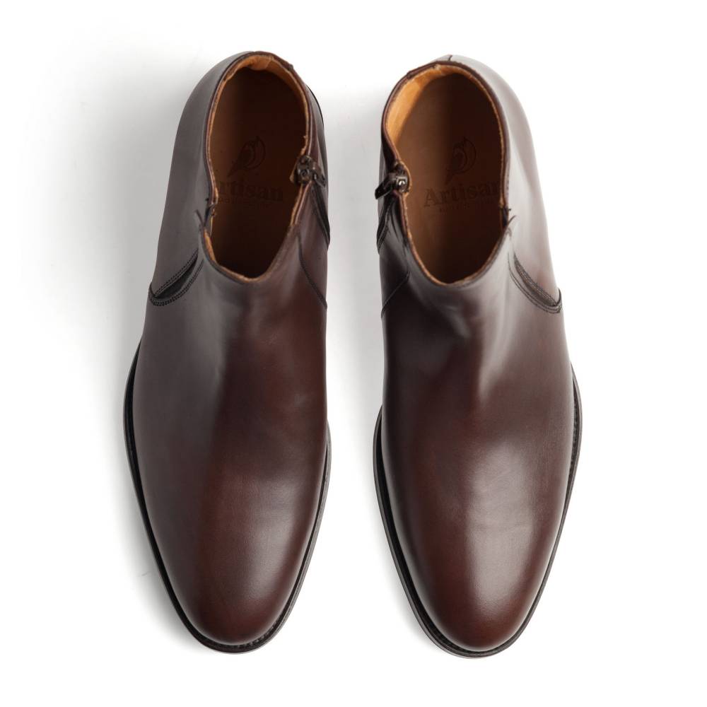 Коричневые сапоги Artisan на легкой и гибкой комбинированной подошве. Верх выполнен из телячьей кожи. Внутренняя отделка из тонкой кожи горчичного оттенка. С наружной стороны расположена эластичная вставка, прикрытая клапаном, а с внутренней — молния, которая позволяет быстро и легко надевать обувь. Конструкция Blake.