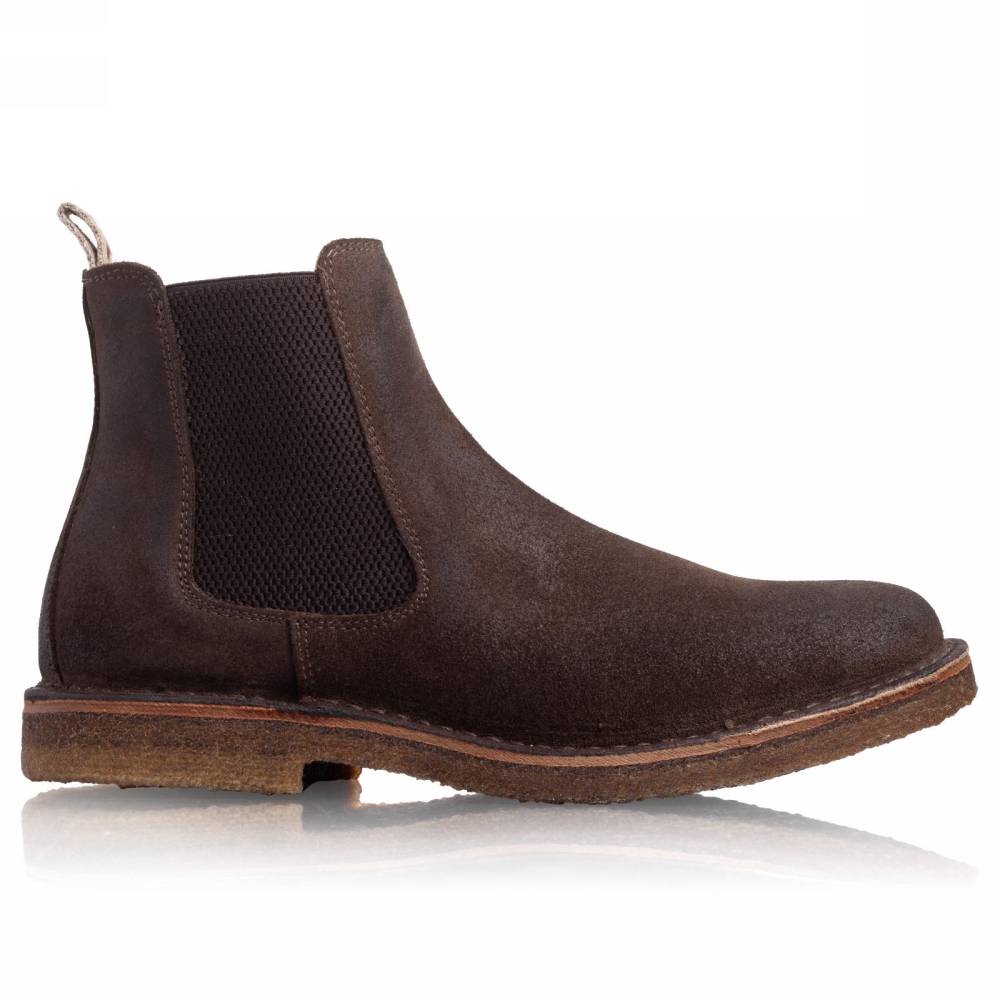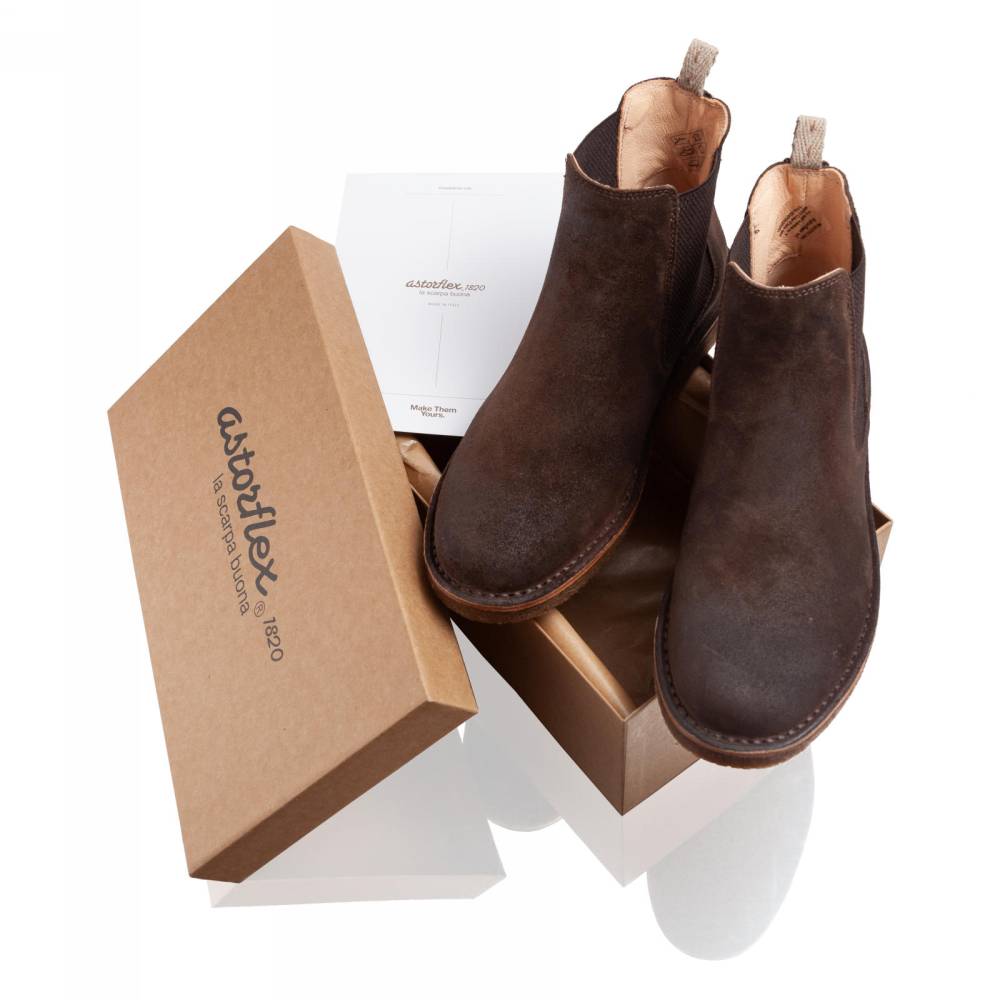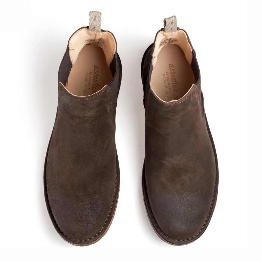 Удобные мужские сапоги челси Astorflex на гибкой подошве из натурального каучука. Верх выполнен из высококачественной тосканской промасленной замши коричневого цвета. В качестве подкладки используется гипоаллергенная тонкая кожа растительного дубления, которая моментально высыхает и поддерживает естественный комфортный микроклимат внутри. Между верхом и подошвой сапоги дополнены промежуточным слоем из плотной кожи, который делает обувь более структурированной и износостойкой. По бокам расположены традиционные эластичные вставки. Задник дополнен текстильной петлёй для удобства. Метод сшивания stitch-down (доппельный метод крепления).