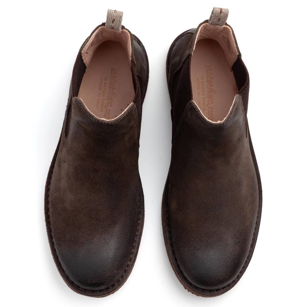 Удобные мужские сапоги челси Astorflex на гибкой подошве из натурального каучука. Верх выполнен из высококачественной тосканской промасленной замши тёмно-серого цвета. В качестве подкладки используется гипоаллергенная тонкая кожа растительного дубления, которая моментально высыхает и поддерживает естественный комфортный микроклимат внутри. Между верхом и подошвой сапоги дополнены промежуточным слоем из плотной кожи, который делает обувь более структурированной и износостойкой. По бокам расположены традиционные эластичные вставки. Задник дополнен текстильной петлёй для удобства. Метод сшивания stitch-down (доппельный метод крепления).