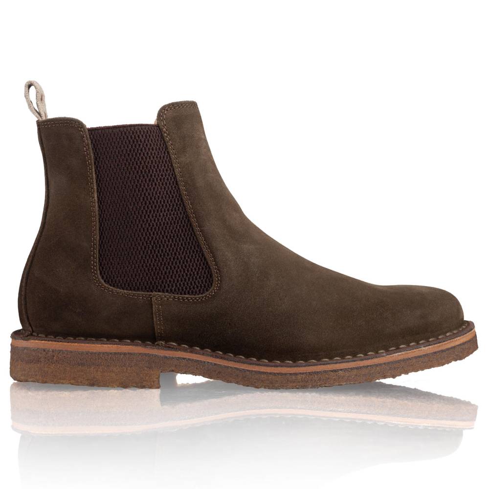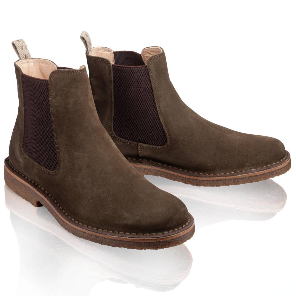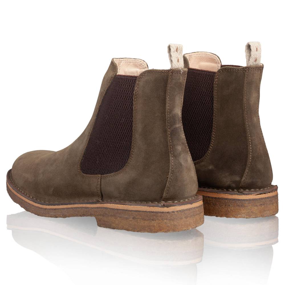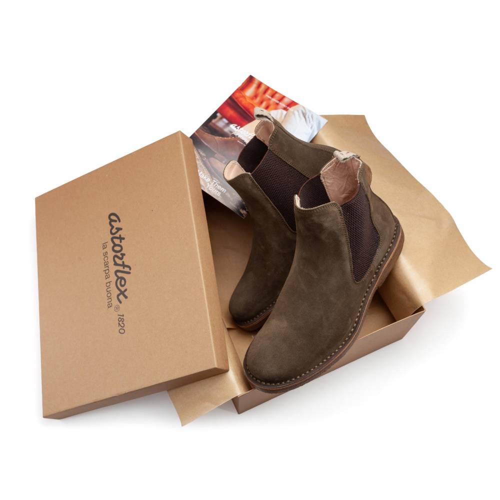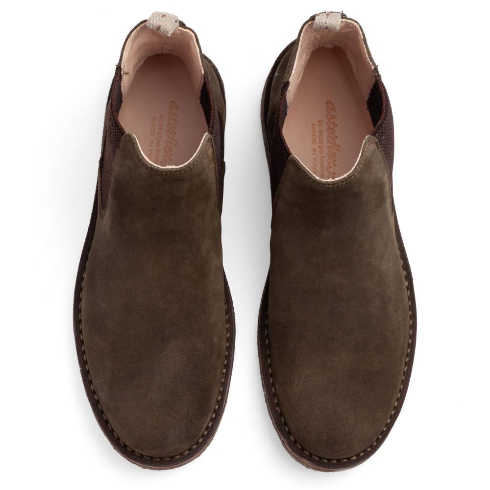 Удобные мужские сапоги челси Astorflex на гибкой подошве из натурального каучука. Верх выполнен из высококачественной тосканской замши темно-зелёного цвета. В качестве подкладки используется гипоаллергенная тонкая кожа растительного дубления, которая моментально высыхает и поддерживает естественный комфортный микроклимат внутри. Между верхом и подошвой сапоги дополнены промежуточным слоем из плотной кожи, который делает обувь более структурированной и износостойкой. По бокам расположены традиционные эластичные вставки. Задник дополнен текстильной петлёй для удобства. Метод сшивания stitch-down (доппельный метод крепления).