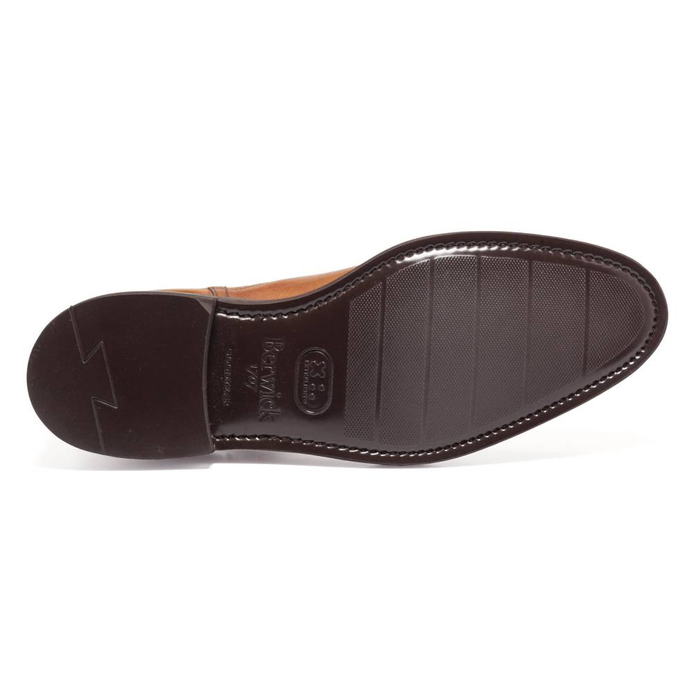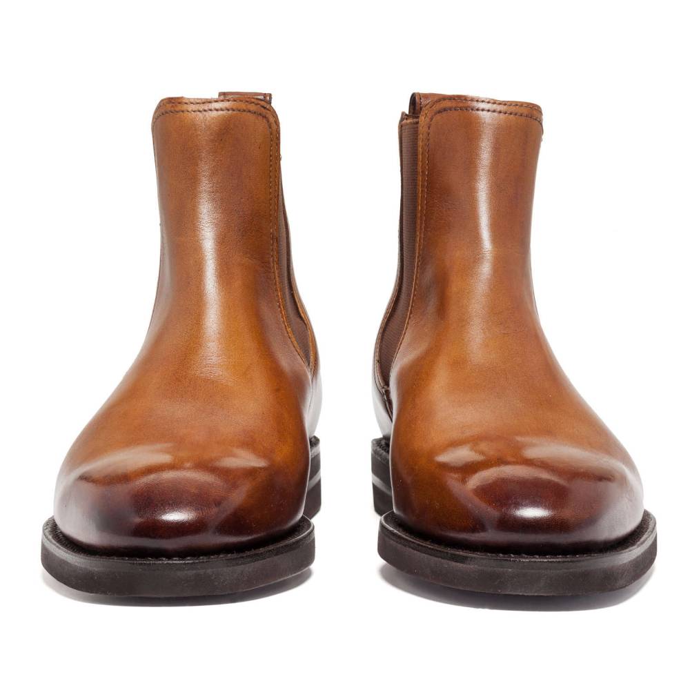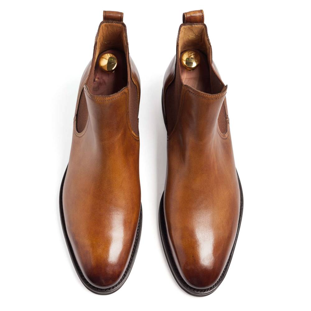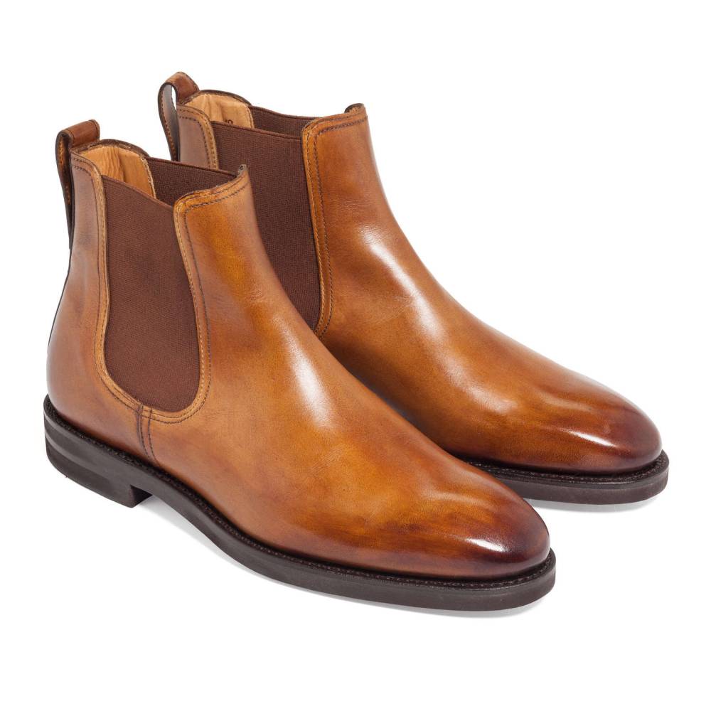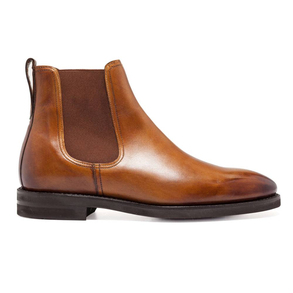 Светло-коричневые сапоги челси Berwick на ультра-лёгкой пластичной резиновой подошве XL Extralight®. Верх выполнен из телячьей кожи. Особенностью модели является ручная окраска, которая создает неповторимый внешний вид кожи с неравномерной игрой цвета и градиентным затемнением на мысе. Внутренняя отделка из тонкой кожи горчичного оттенка. Сверху расположена кожаная петля, а по бокам - традиционные эластичные вставки, которые позволяют быстро и легко надевать обувь. Конструкция Goodyear Welted.