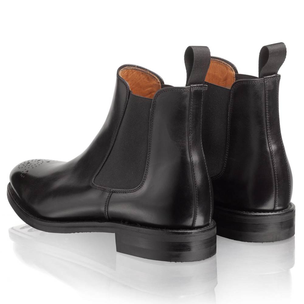 Элегантные сапоги челси Berwick на подошве из прочной резины британской фирмы Dainite. Верх обуви выполнен из гладкой телячьей кожи чёрного цвета. Мысок украшен ненавязчивым перфорированным узором. Внутренняя отделка из тонкой мягкой кожи бежевого оттенка. По бокам расположены традиционные эластичные вставки, благодаря которым сапоги быстро и легко надеваются. Конструкция Goodyear Welted.