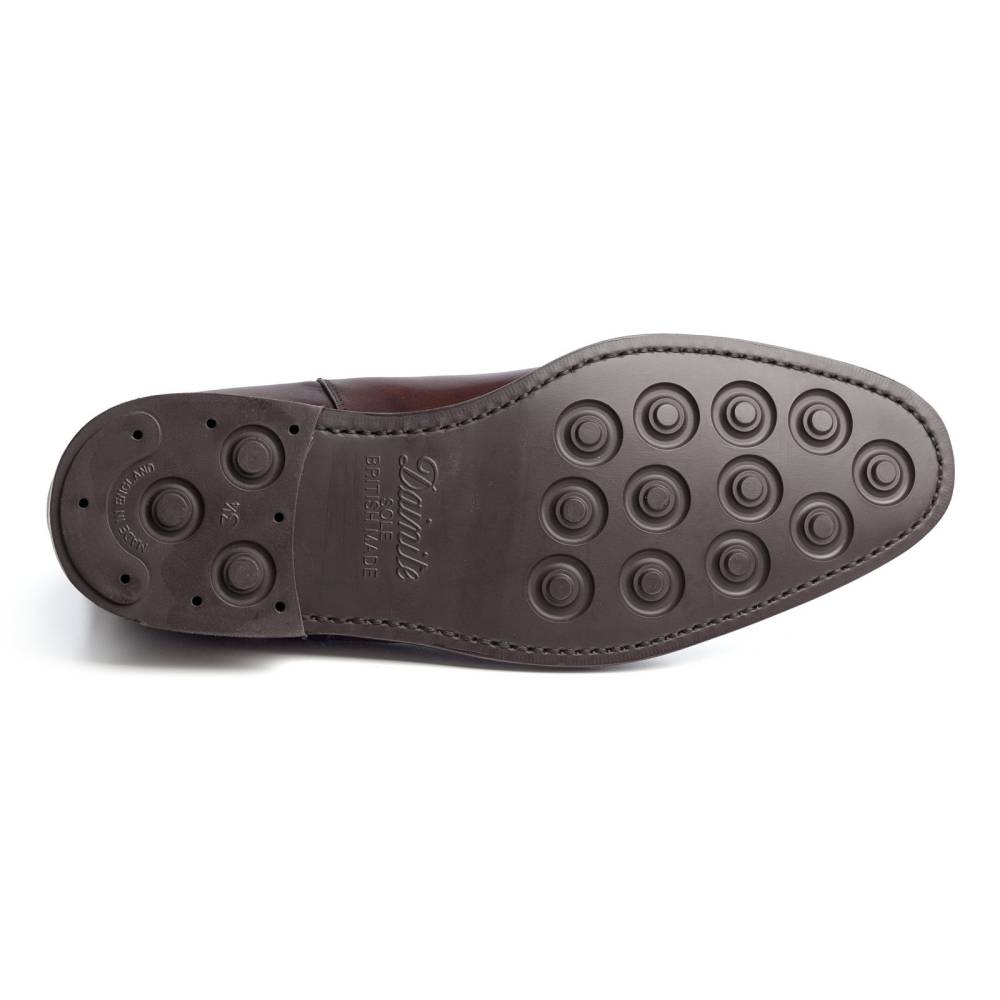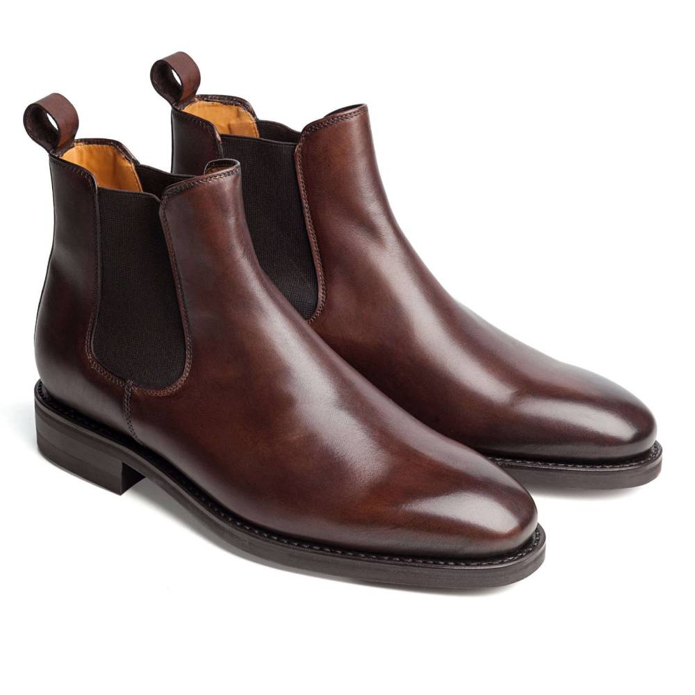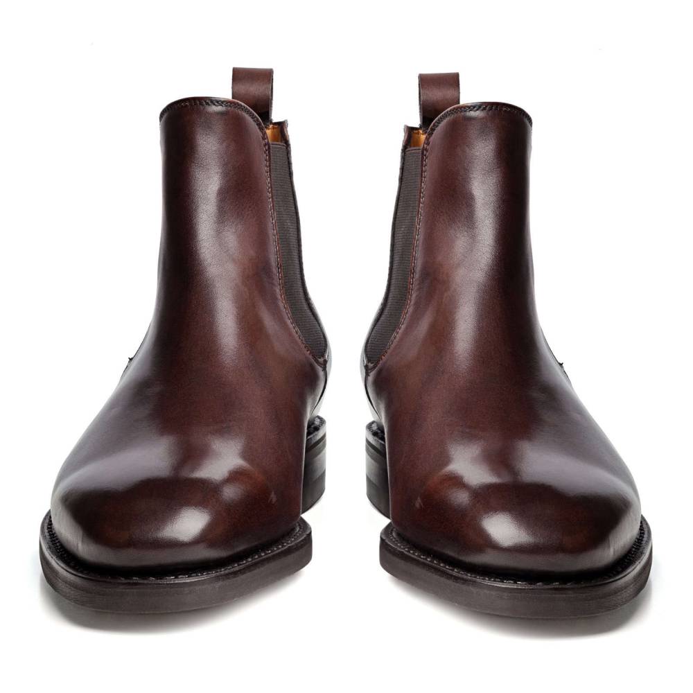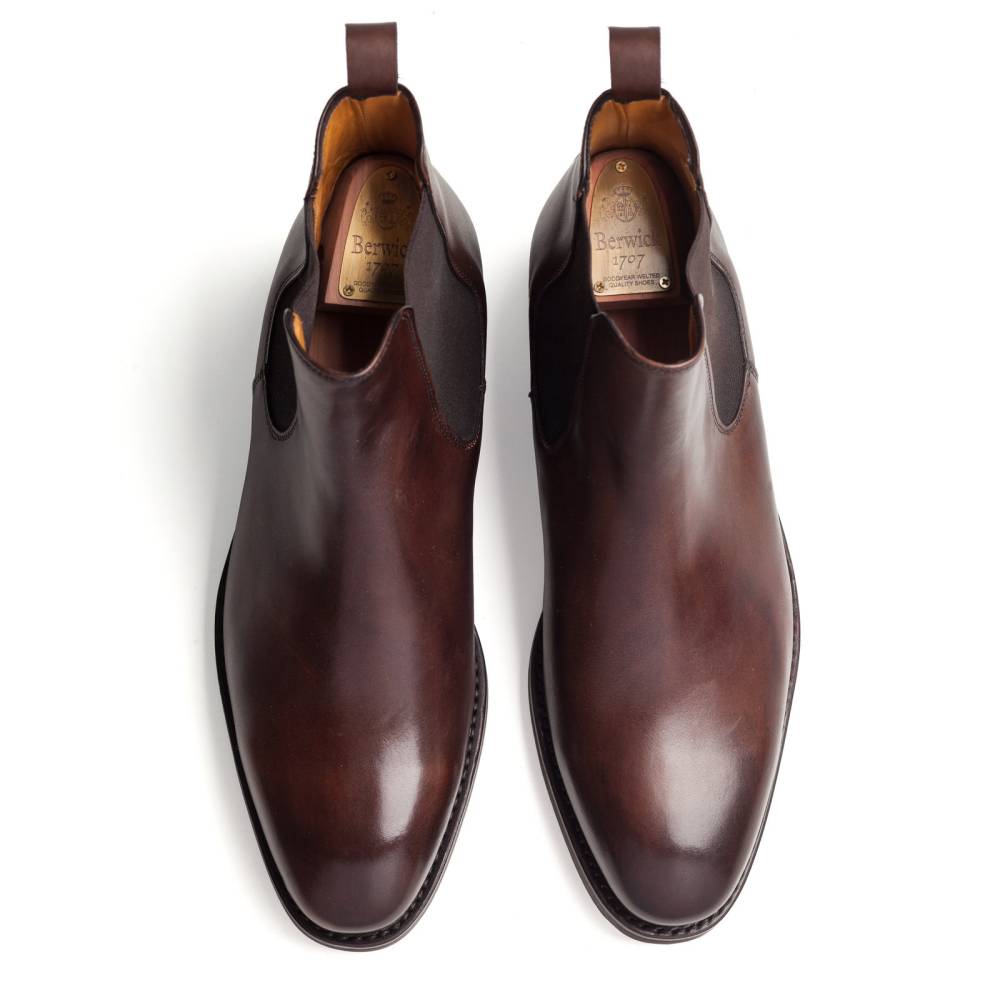 Классические мужские сапоги челси Berwick на подошве из прочной резины британской фирмы Dainite. Верх обуви выполнен из гладкой телячьей кожи тёмно-коричневого цвета. Особенностью модели является ручная окраска, которая создает неповторимый внешний вид кожи с неравномерной игрой цвета и градиентным затемнением на мысе. Внутренняя отделка из тонкой мягкой кожи бежевого оттенка. По бокам расположены традиционные эластичные вставки, благодаря которым сапоги быстро и легко надеваются. Конструкция Goodyear Welted.