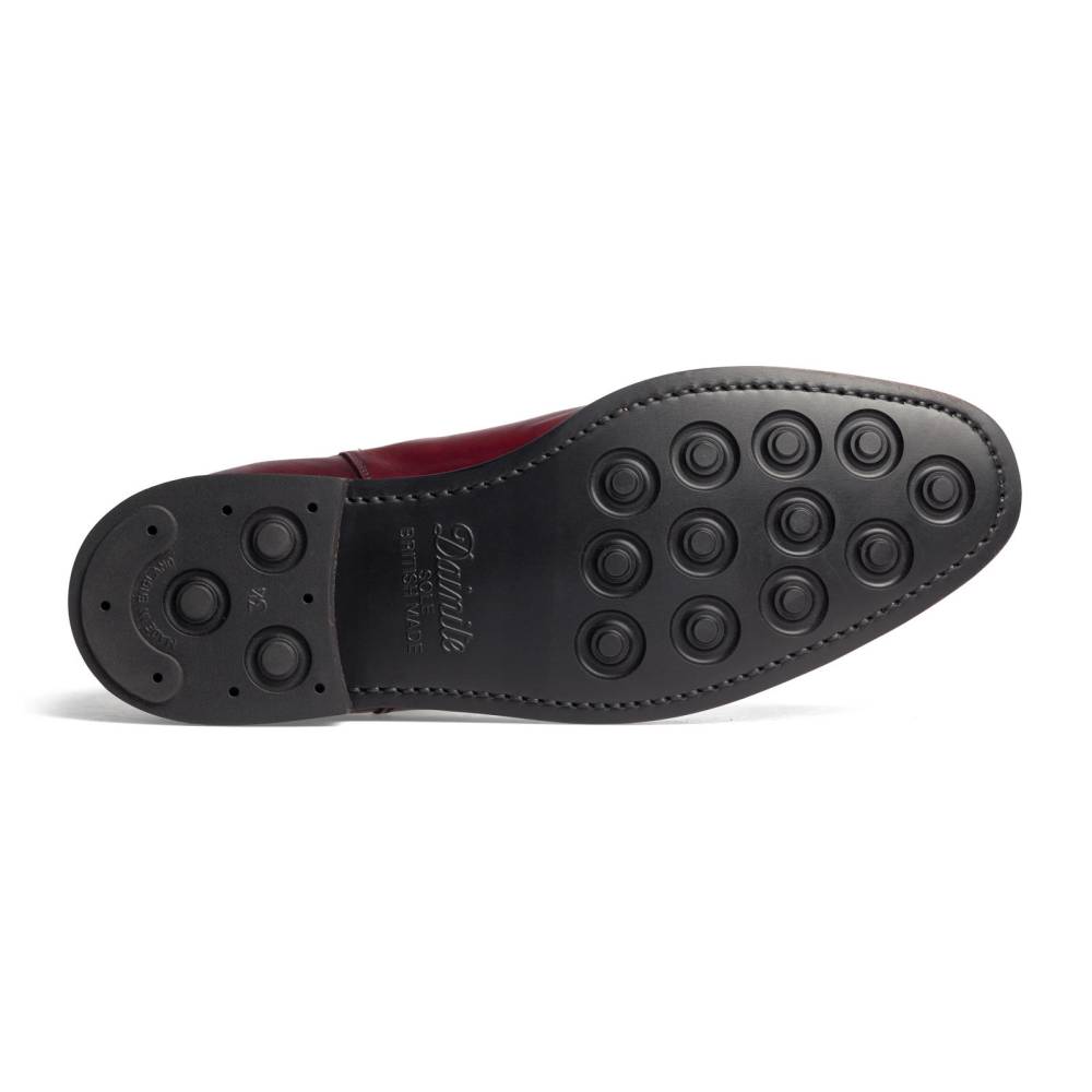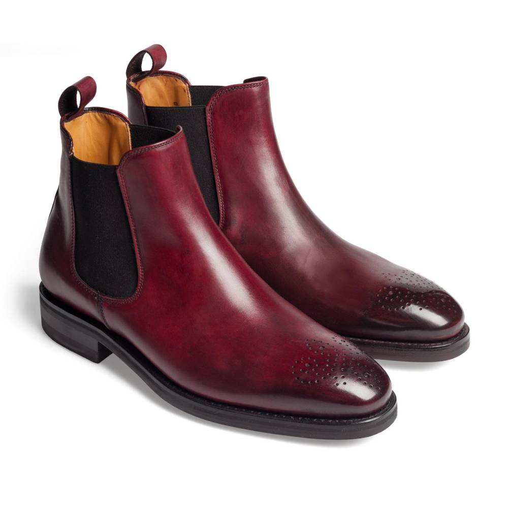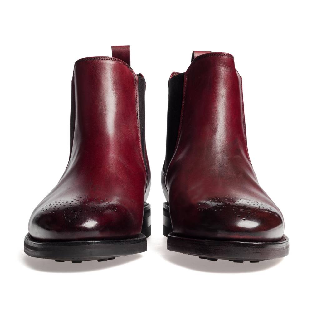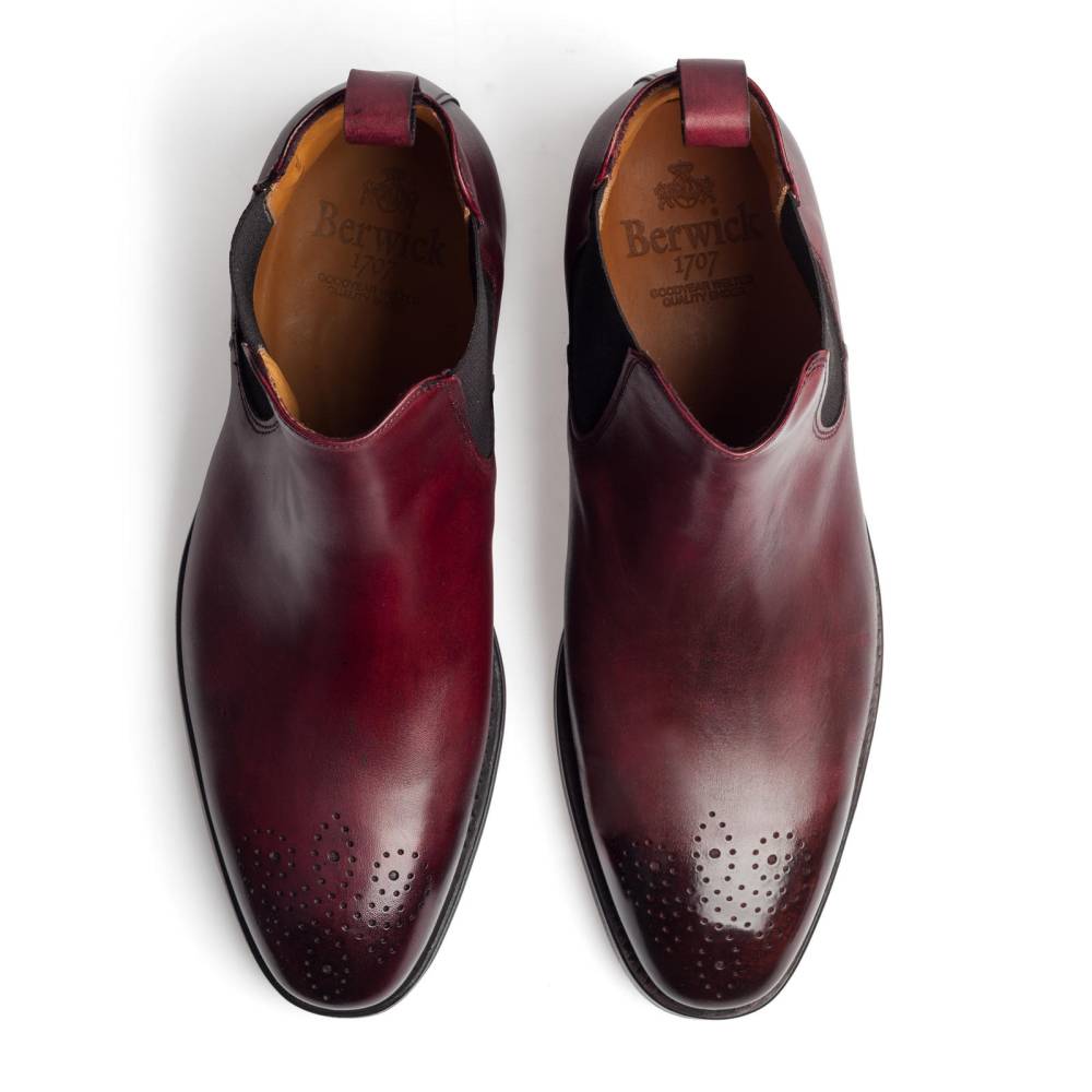 Классические мужские сапоги челси Berwick на подошве из прочной резины британской фирмы Dainite. Верх обуви выполнен из гладкой телячьей кожи бордового цвета. Особенностью модели является ручная окраска, которая создает неповторимый внешний вид кожи с неравномерной игрой цвета и градиентным затемнением на мысе. Внутренняя отделка из тонкой мягкой кожи бежевого оттенка. По бокам расположены традиционные эластичные вставки, благодаря которым сапоги быстро и легко надеваются. Конструкция Goodyear Welted.