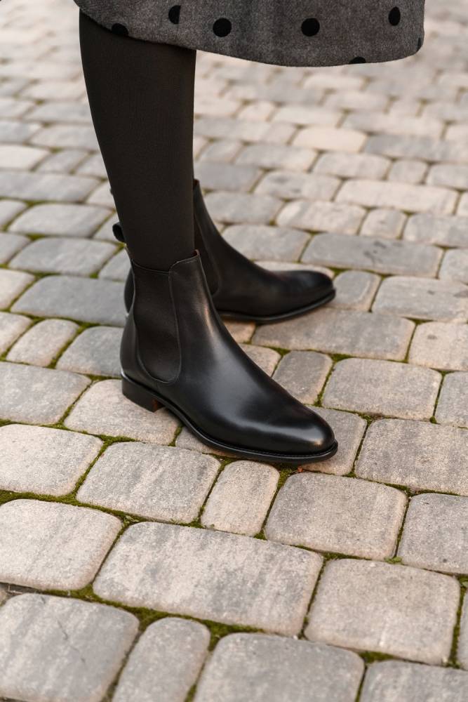 Сапоги превосходно дополнят базовый гардероб в классическом стиле. Лучше всего челси сочетать с плотными тёмными колготками и неширокими укороченными джинсами из плотного денима, так чтобы верхняя часть обуви оставалась открытой.