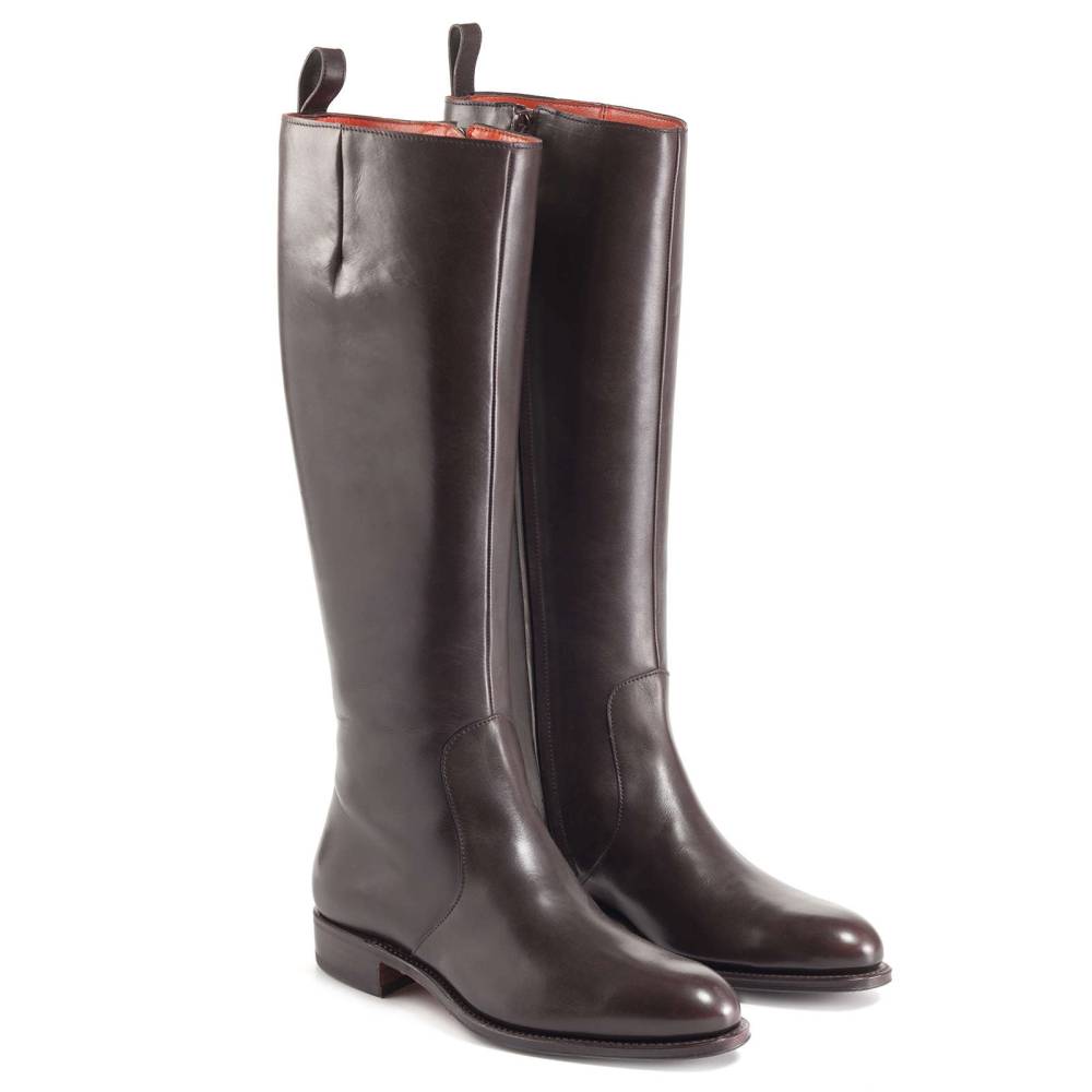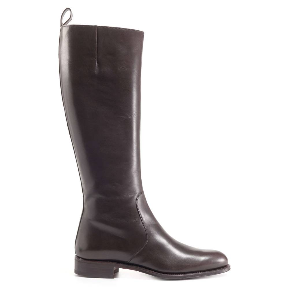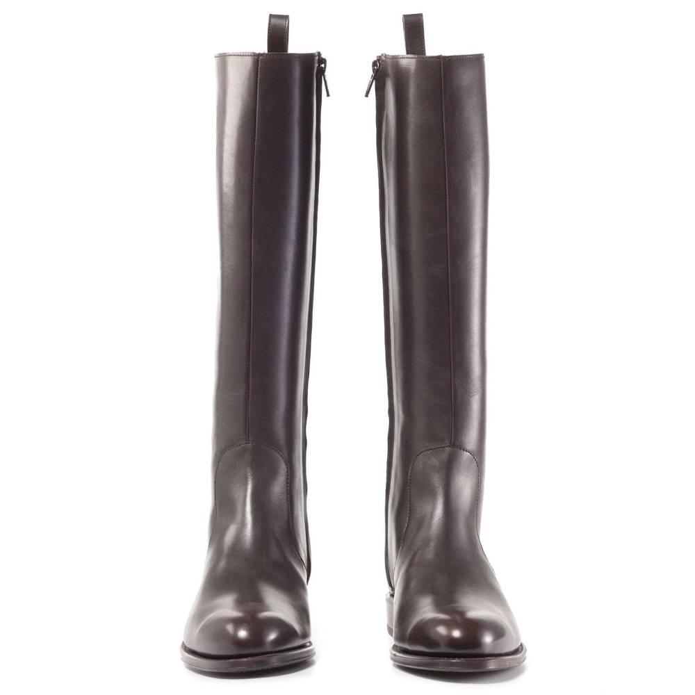 Высокие женские сапоги Carmina из мягкой гладкой телячьей кожи тёмно-коричневого цвета. Голенище застегивается на молнию сбоку. Внутренняя отделка из тонкой ярко-оранжевой кожи. Подошва из кожи с фирменной профилактикой из резины.