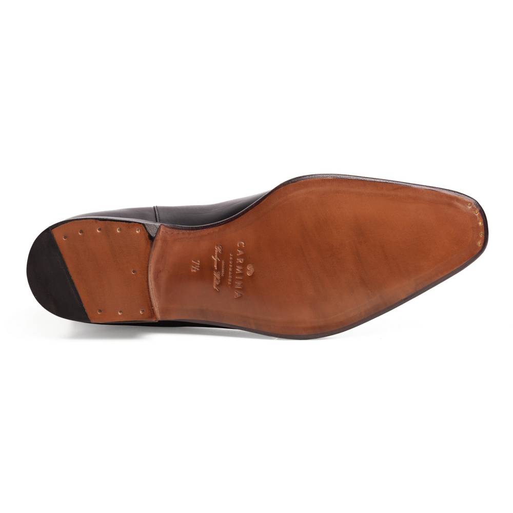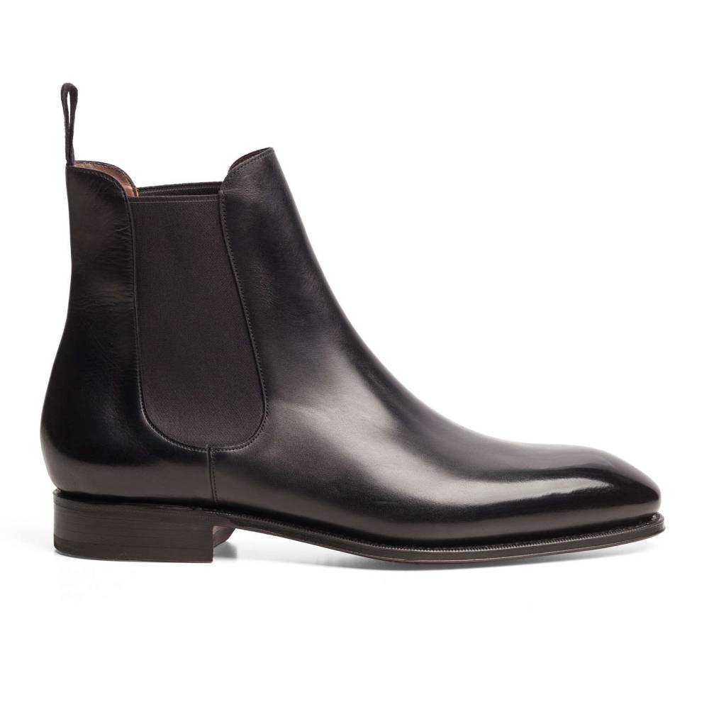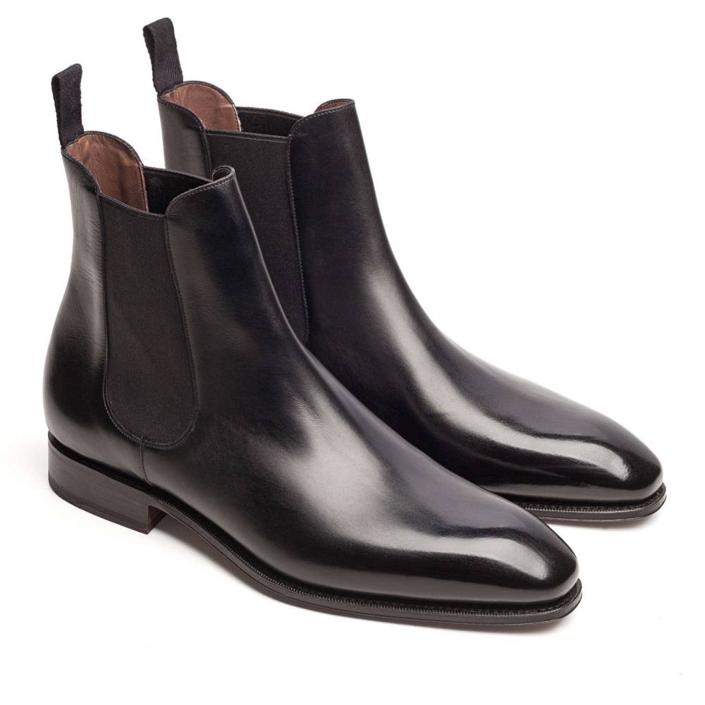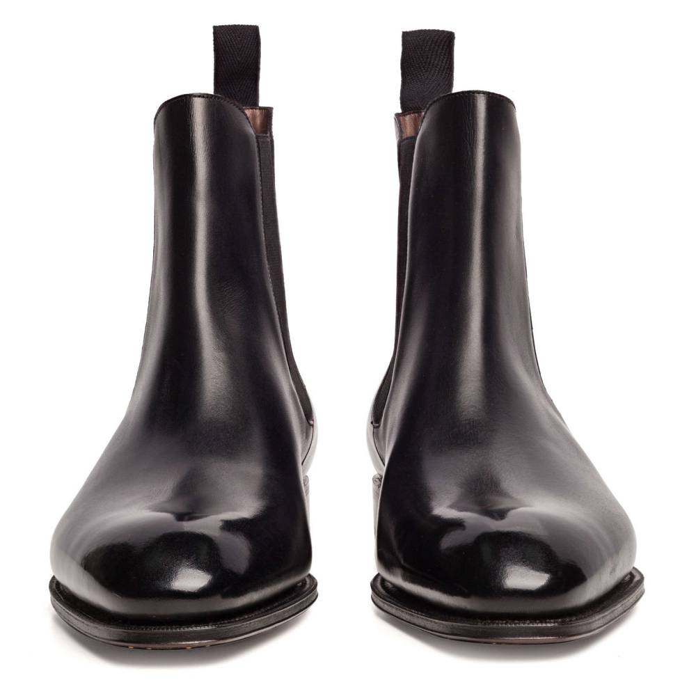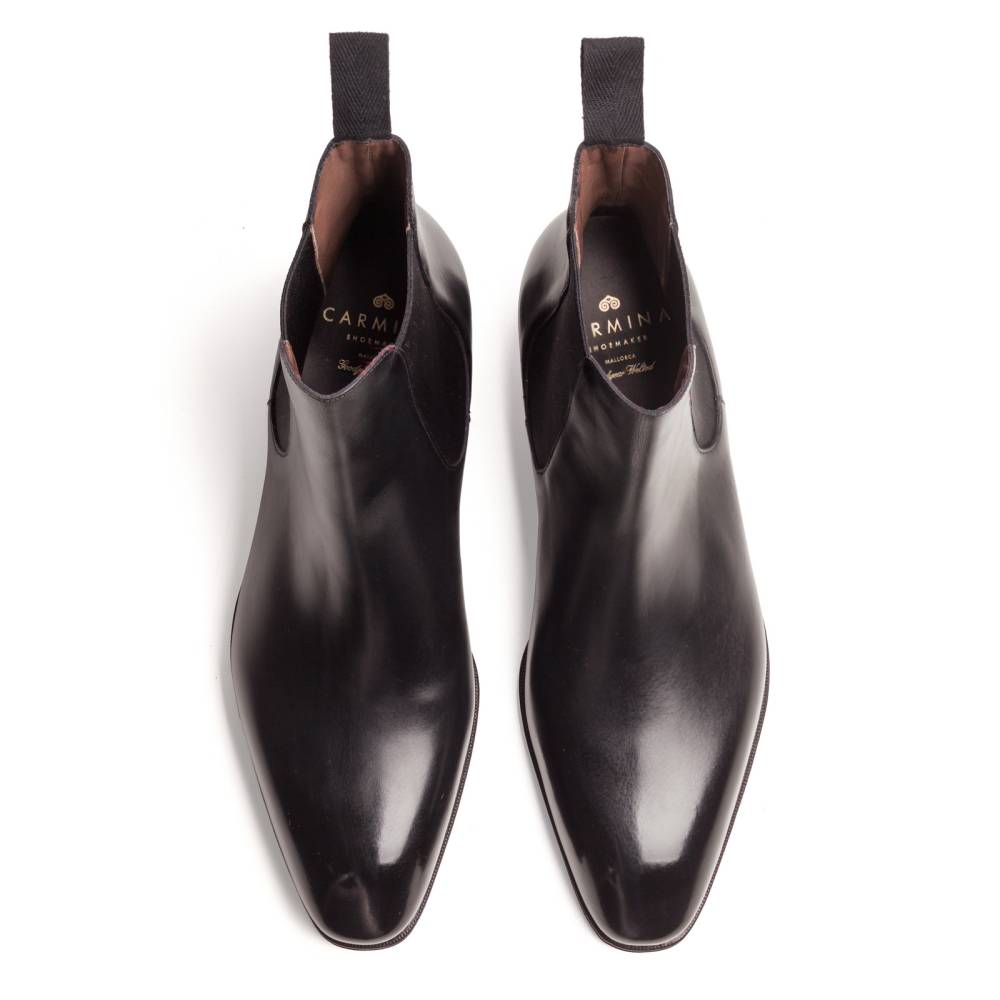 Элегантные сапоги челси Carmina из высококачественной телячьей кожи чёрного цвета. Модель имеет тонкую кожаную подошву. Сверху расположена текстильная петля, а по бокам - традиционные эластичные вставки, которые позволяют быстро и легко надевать обувь. Конструкция Goodyear Welted.