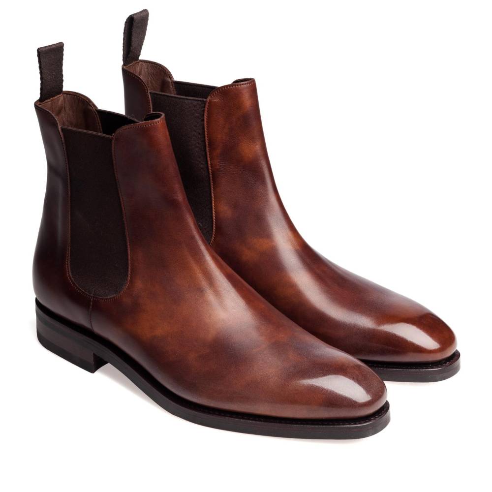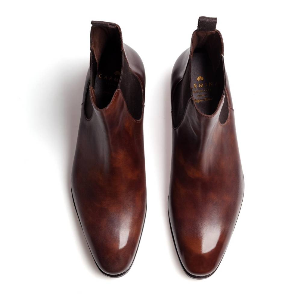 Тёмно-коричневые сапоги «Chelsea» от испанского бренда Carmina Shoemaker на резиновой подошве. Верх обуви выполнен из гладкой телячьей кожи «museum calf». Особенностью данного типа кожи является характерный «пятнистый окрас», который схож с узорами на мраморе. Внутренняя отделка из тонкой мягкой кожи тёмно-коричневого оттенка. По бокам расположены традиционные эластичные вставки, благодаря которым сапоги быстро и легко надеваются. Конструкция Goodyear Welted.