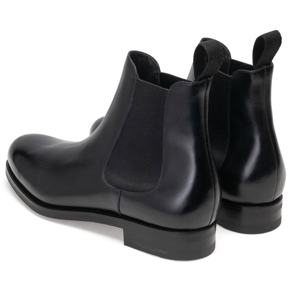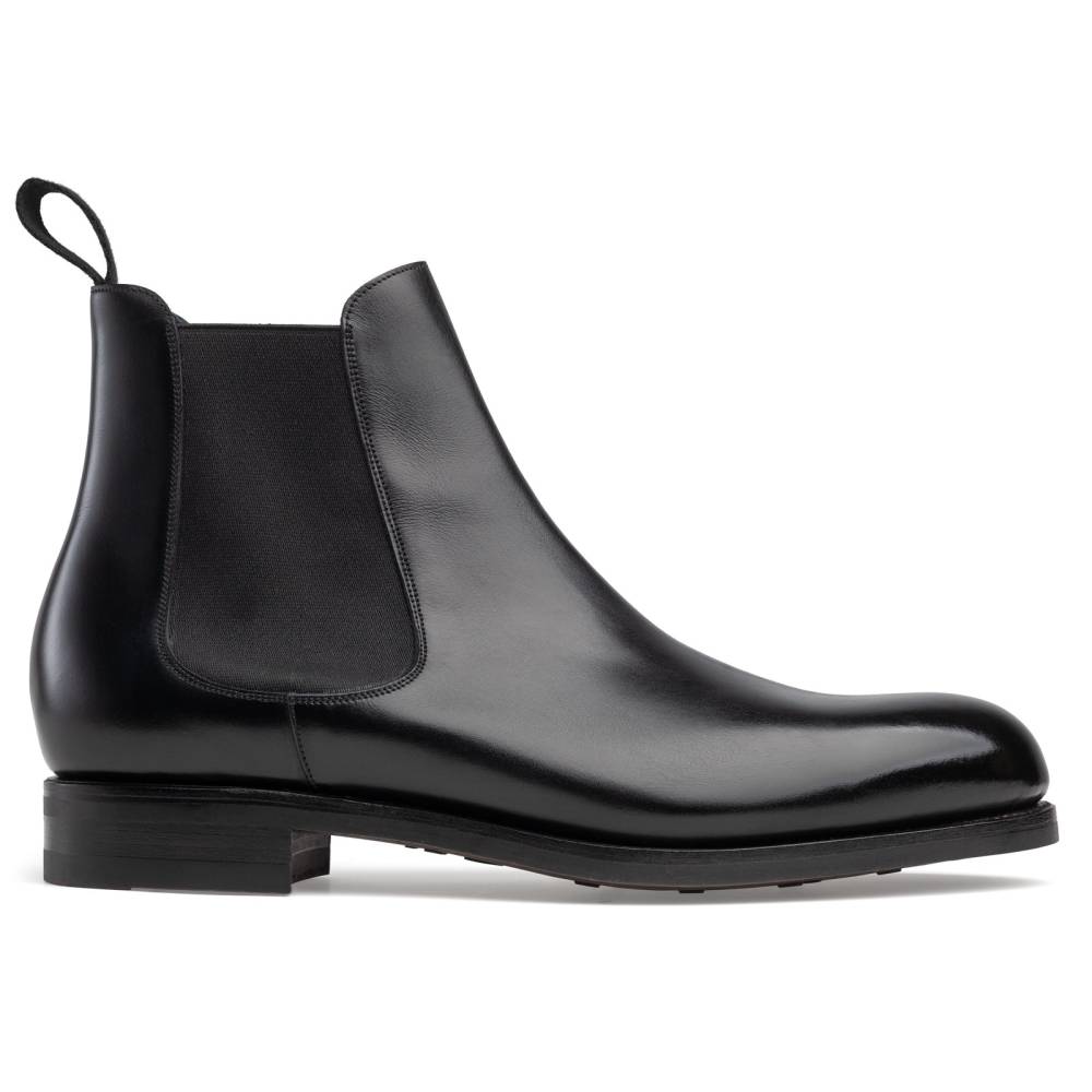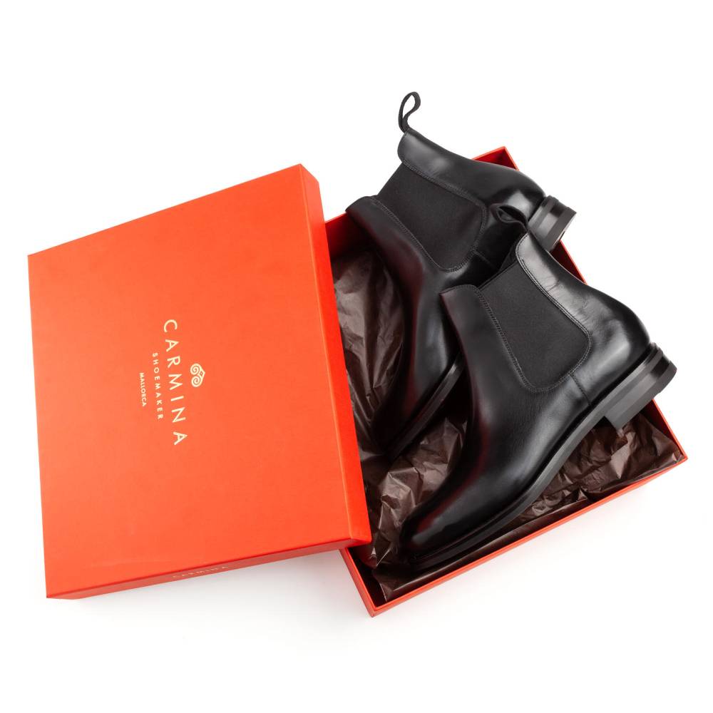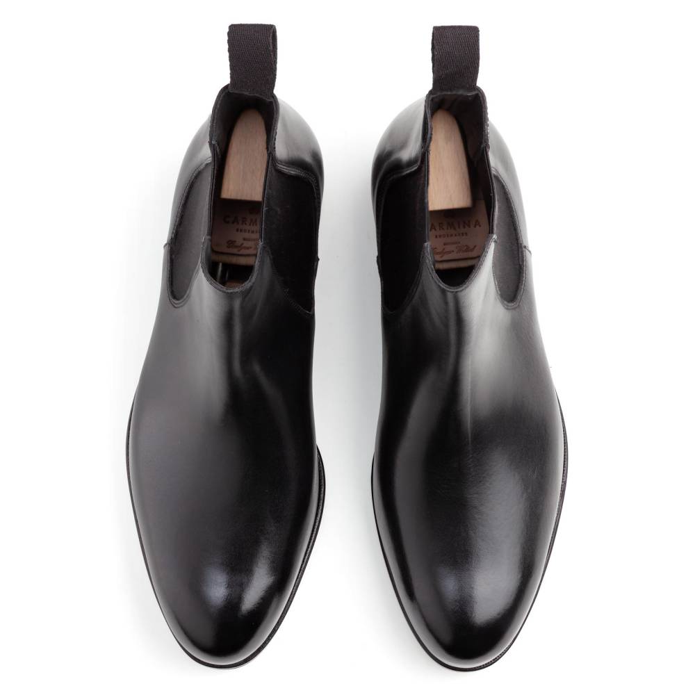 Элегантные сапоги челси Carmina из высококачественной телячьей кожи чёрного цвета. Модель имеет практичную подошву из резины с протектором. Сверху расположена текстильная петля, а по бокам - традиционные эластичные вставки, которые позволяют быстро и легко надевать обувь. Конструкция Goodyear Welted.