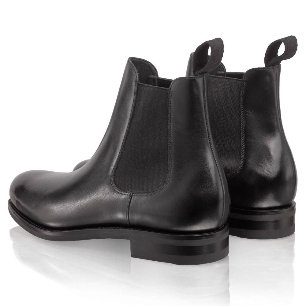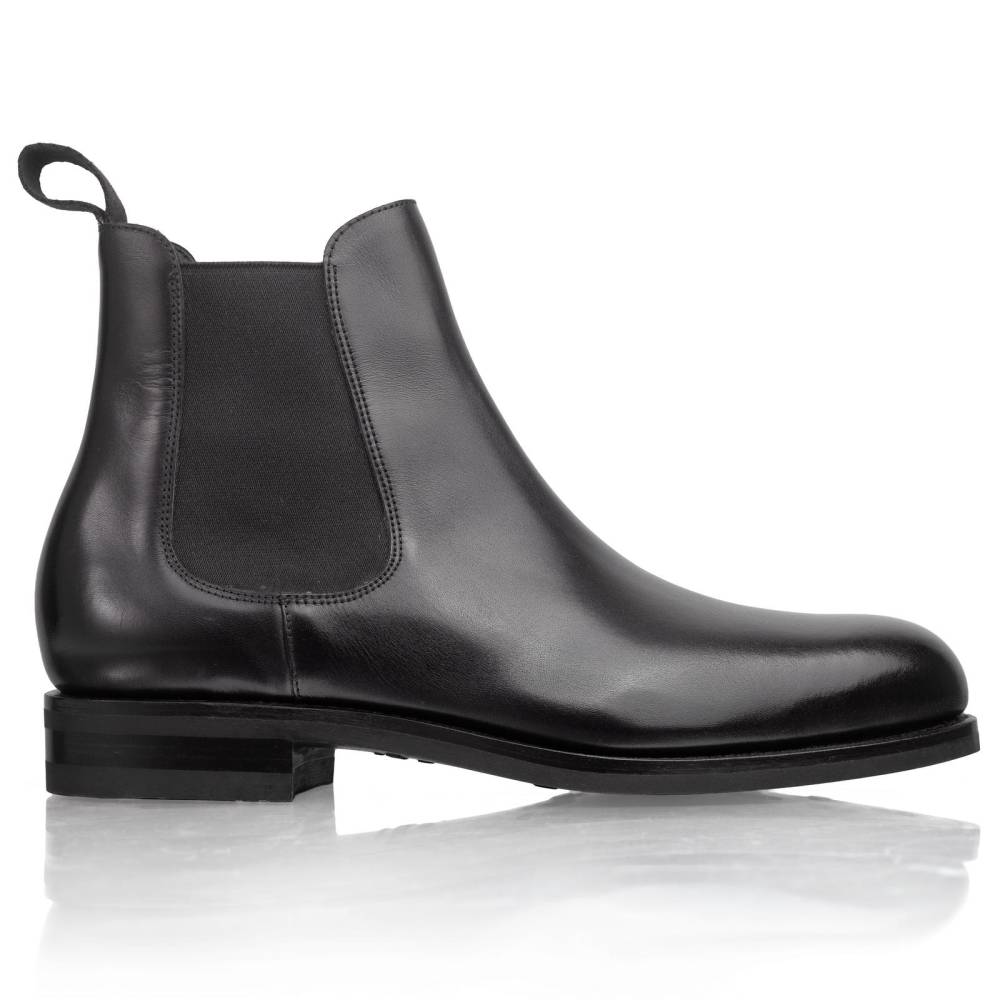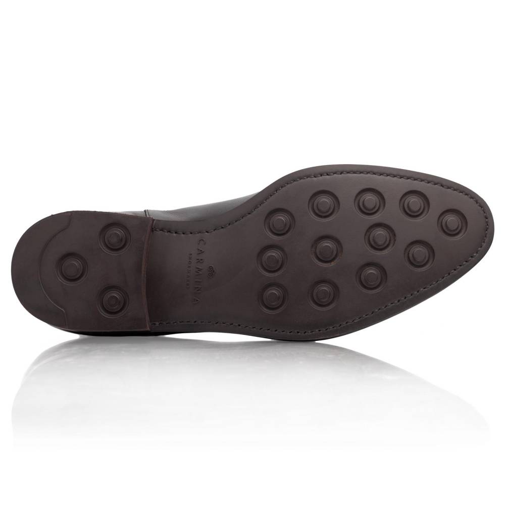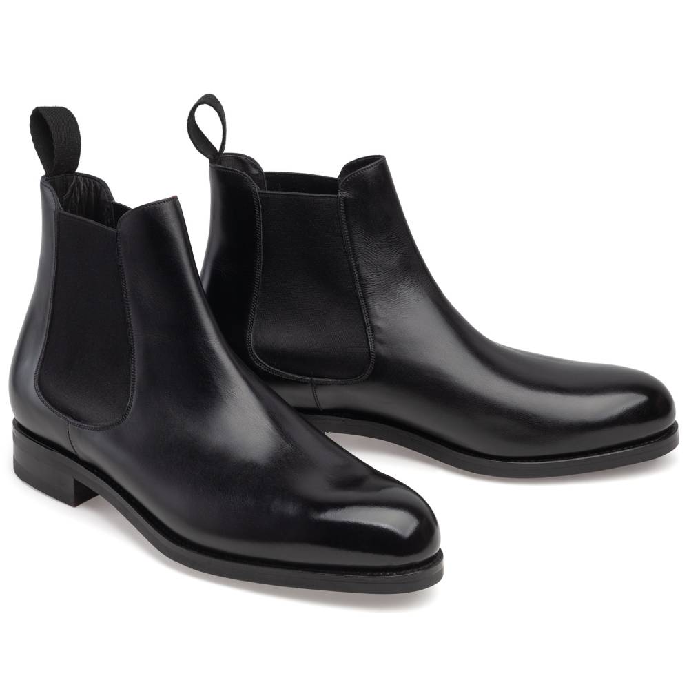 Элегантные сапоги челси Carmina из высококачественной телячьей кожи чёрного цвета. Модель имеет практичную подошву из резины с протектором. Сверху расположена текстильная петля, а по бокам - традиционные эластичные вставки, которые позволяют быстро и легко надевать обувь. Конструкция Goodyear Welted.