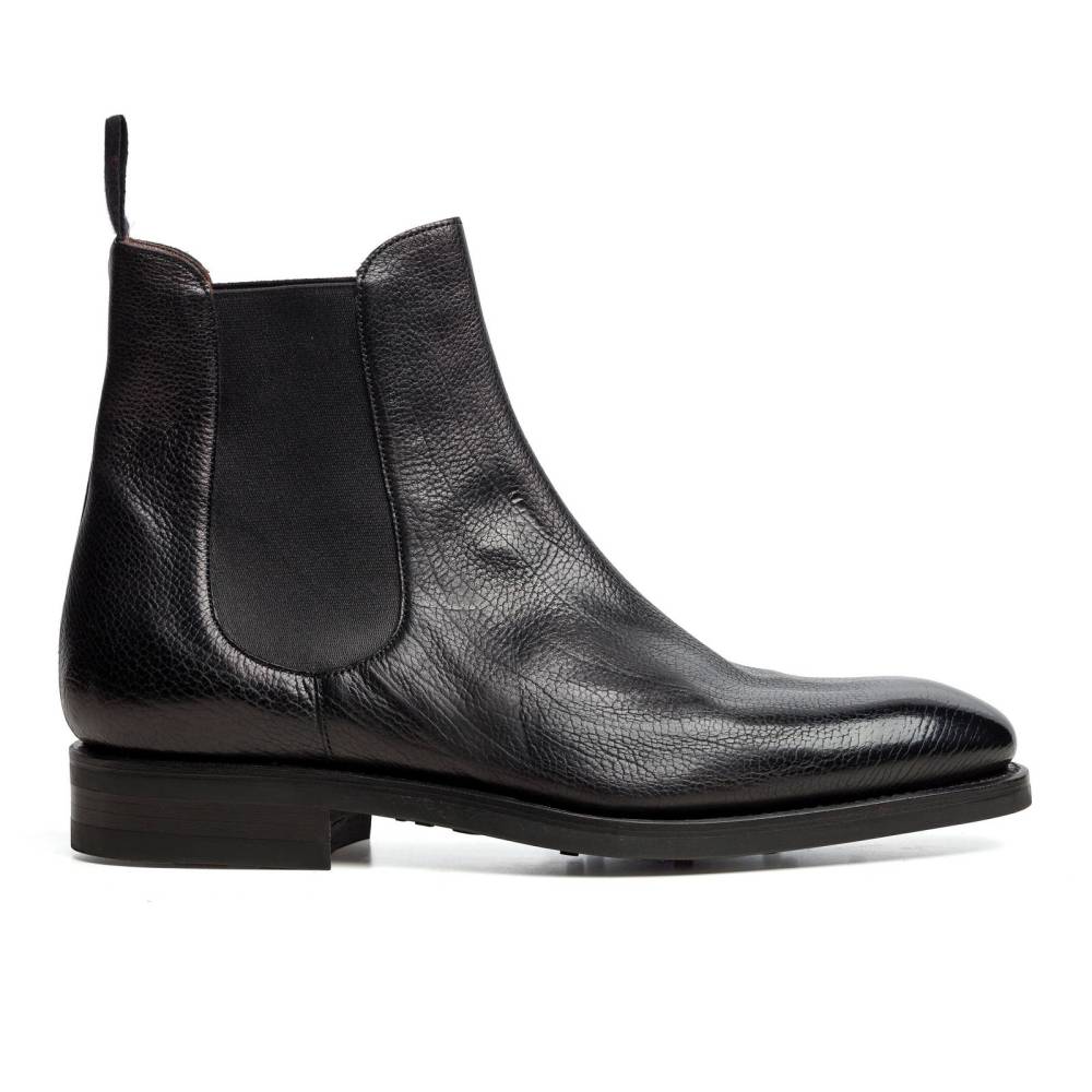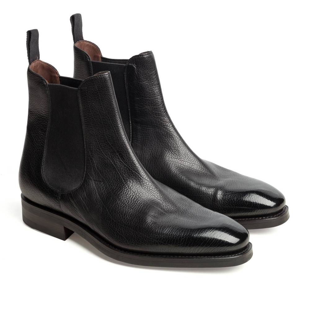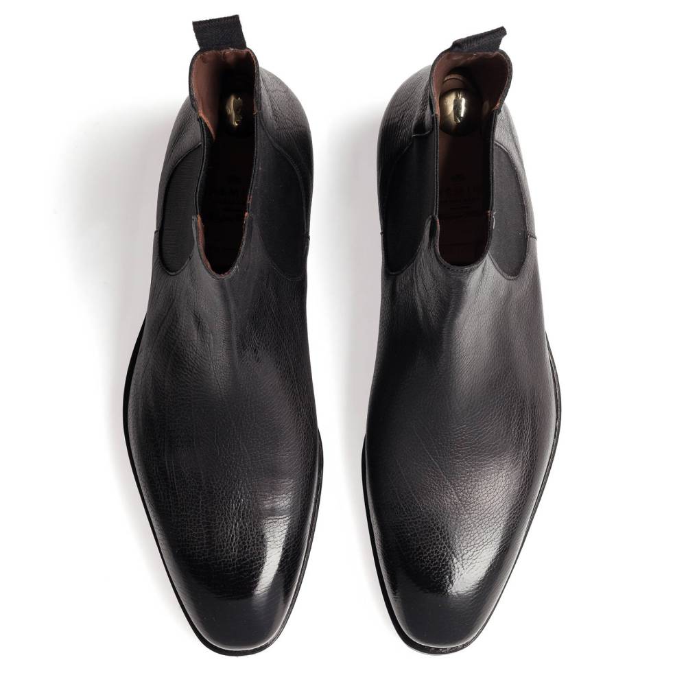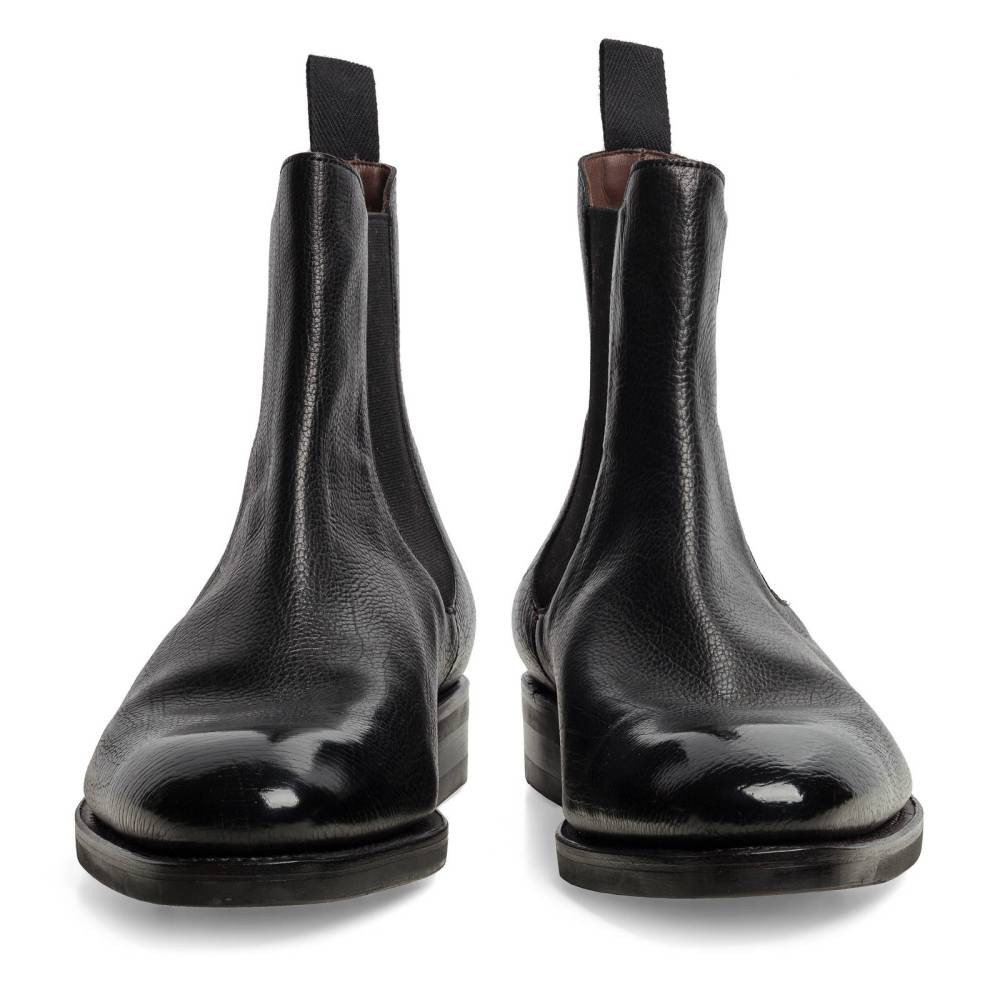 Элегантные мужские сапоги челси Carmina выполнены из кожи ламы чёрного цвета. Данный вид кожи отличает особая мягкость и эластичность, также узнаваема зернистая текстура. Модель имеет износостойкую резиновую подошву. Пяточная часть дополнена текстильной петлёй, а по бокам расположены эластичные вставки, благодаря которым сапоги быстро и легко надеваются. Конструкция Goodyear Welted.