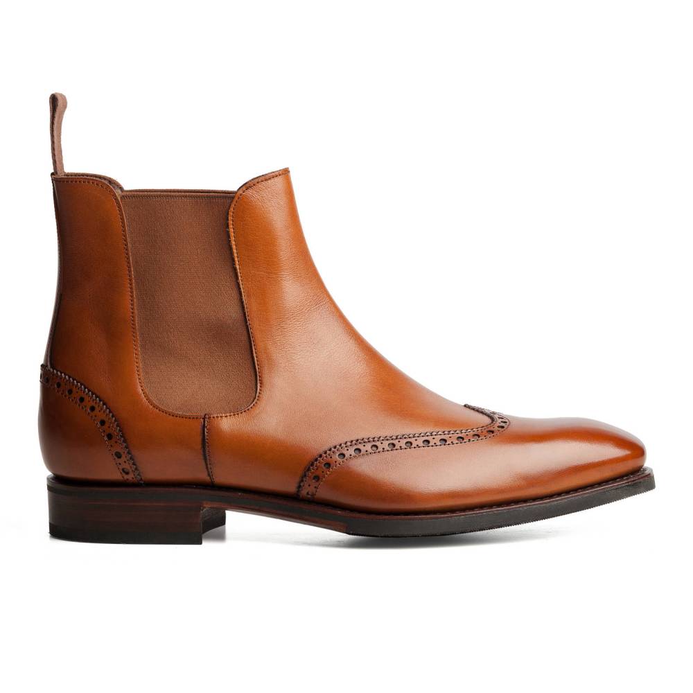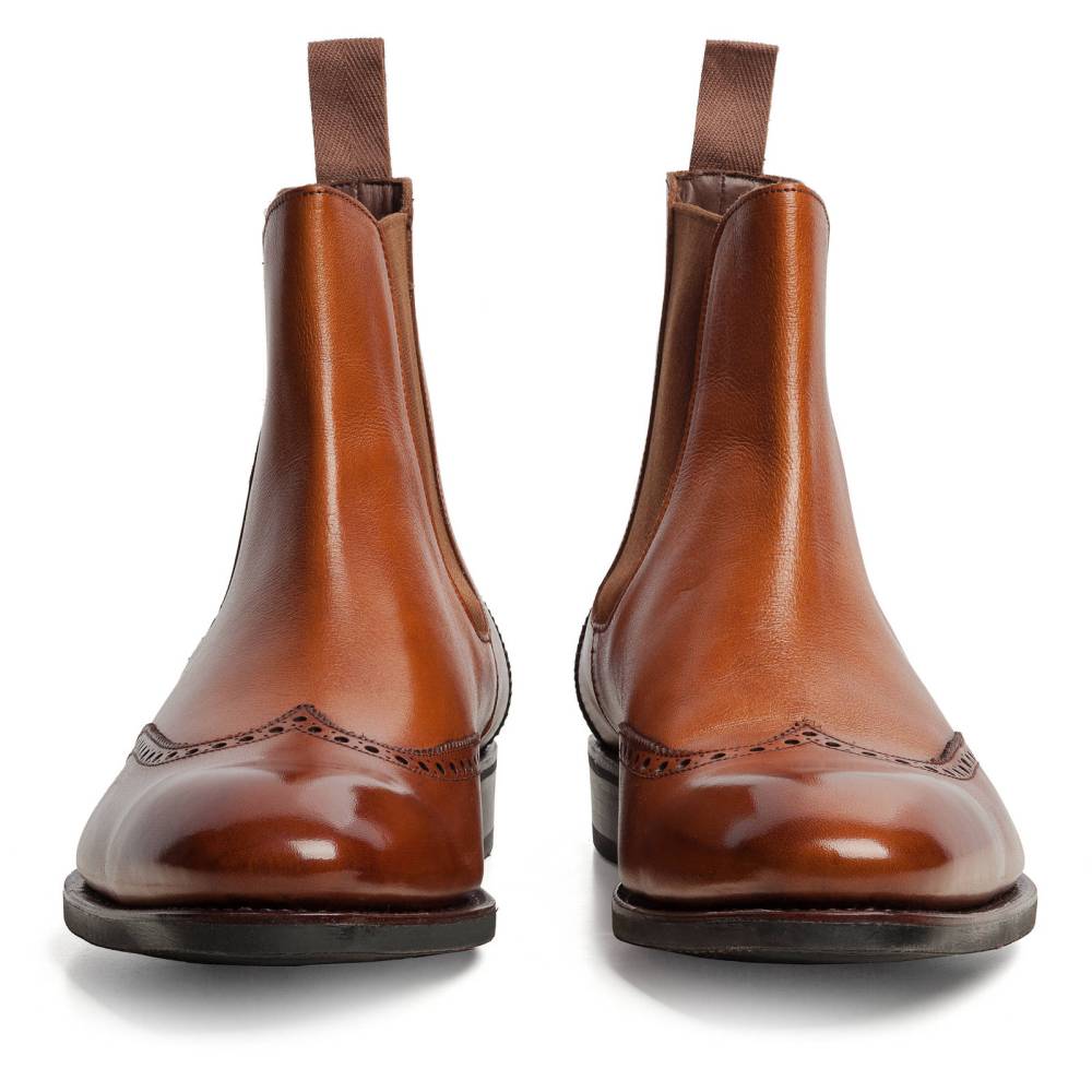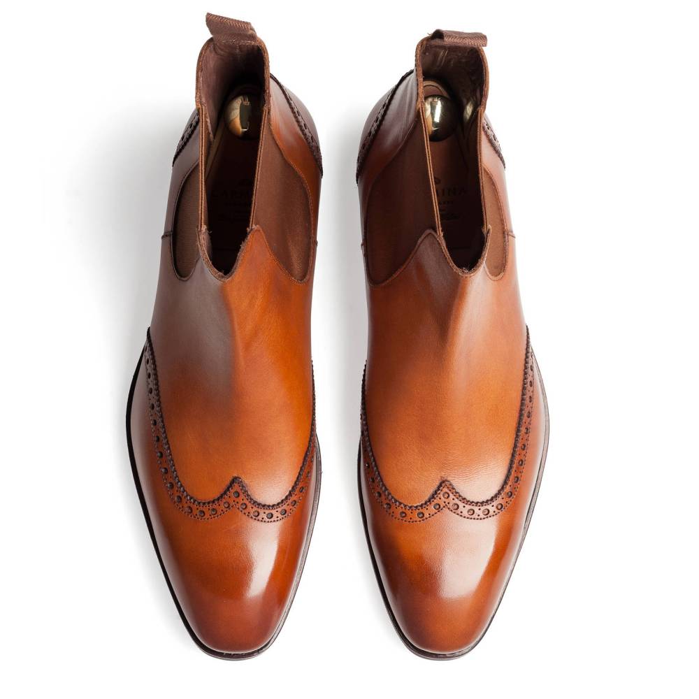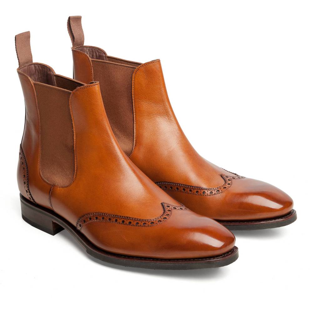 Mужские сапоги челси испанского бренда Carmina светло-коричневого цвета. Верх выполнен из высококачественной телячьей кожи, украшенной традиционным узором «брог». Модель имеет практичную комбинированную подошву из кожи и резины. Пяточная часть дополнена текстильной петлёй, а по бокам расположены эластичные вставки, благодаря которым сапоги быстро и легко надеваются. Конструкция Goodyear Welted.