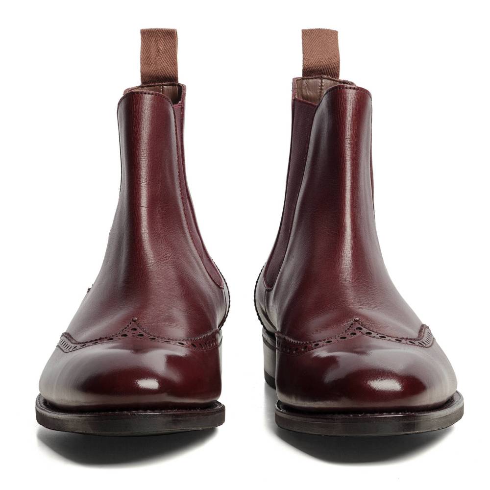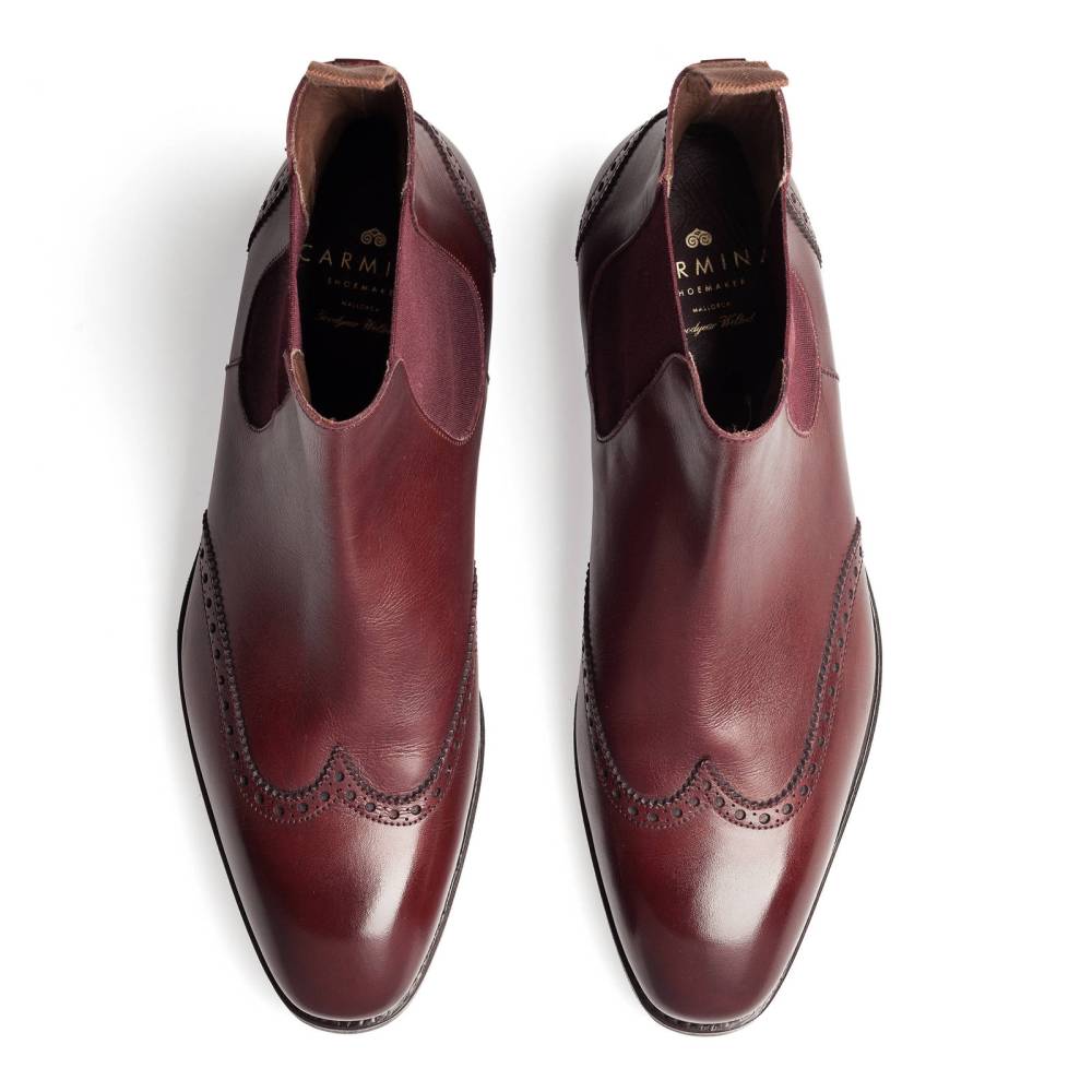 Mужские сапоги челси испанского бренда Carmina насыщенного бордового цвета. Верх выполнен из высококачественной телячьей кожи, украшенной традиционным узором «брог». Модель имеет практичную комбинированную подошву из кожи и резины. Пяточная часть дополнена текстильной петлёй, а по бокам расположены эластичные вставки, благодаря которым сапоги быстро и легко надеваются. Конструкция Goodyear Welted.