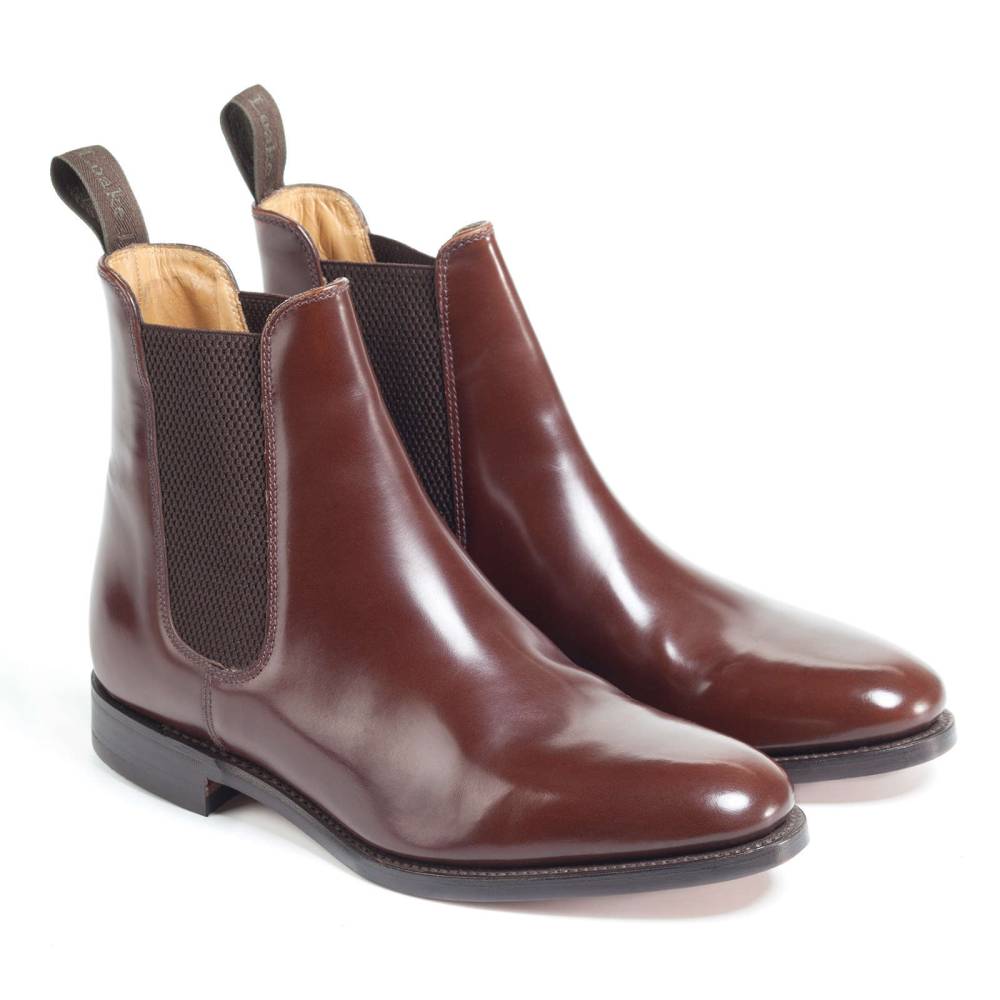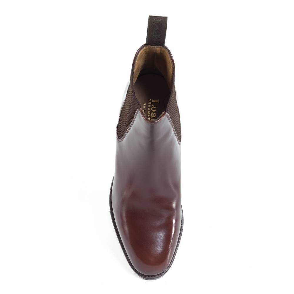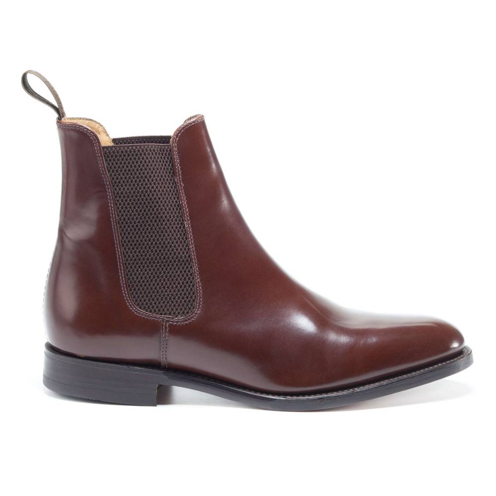Сапоги челси Loake из коллекции Shoemakers на кожаной подошве. Верхняя часть выполнена из плотной полированной телячьей кожи тёплого коричневого оттенка. Внутренняя отделка из тонкой мягкой кожи. По бокам расположены эластичные вставки, благодаря которым сапоги легко надеваются. Конструкция Goodyear.