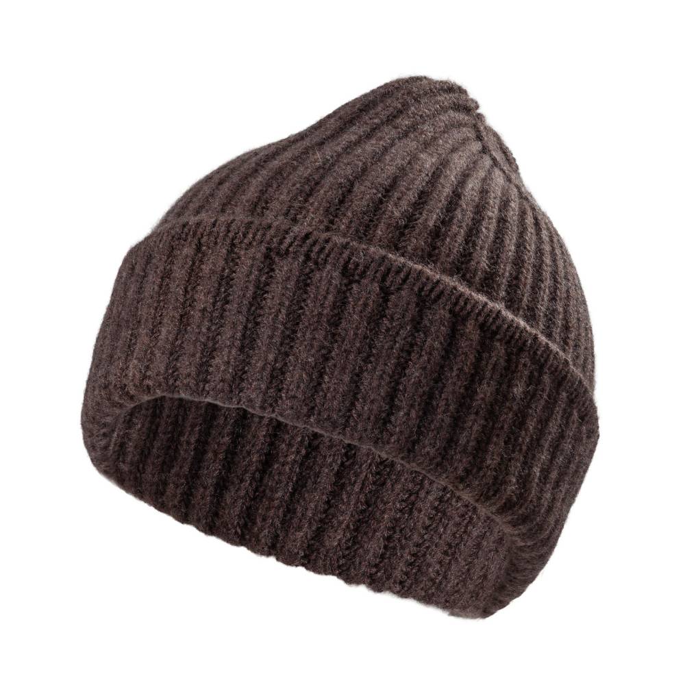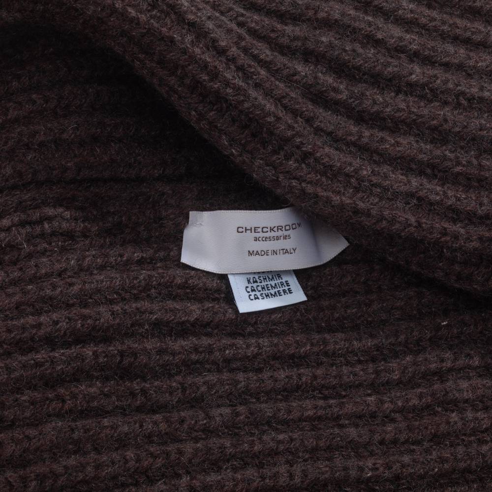 Тёплая и мягкая шапка Checkroom с отворотом связана из высококачественной кашемировой пряжи тёмно-коричневого цвета. Плотная нить в 4 сложения (4 ply). Крупная вязка (3 gauge). Модель создана по специальному заказу бутика Checkroom на небольшом предприятии в Генуе, которое с 1922 года специализируется на производстве продукции из кашемира. Необработанный кашемир поставляется из региона на краю пустыни Гоби от домашних коз (capra hircus). Затем на производстве в Италии красится и обрабатывается.