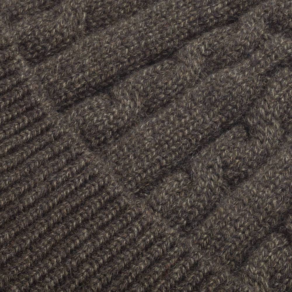 Тонкая и мягкая шапка Checkroom с отворотом связана из высококачественной кашемировой пряжи тёмно-зелёного цвета. Плотная нить в 4 сложения (4 ply). Крупная вязка (3 gauge). Модель создана по специальному заказу бутика Checkroom на небольшом предприятии в Генуе, которое с 1922 года специализируется на производстве продукции из кашемира. Необработанный кашемир поставляется из региона на краю пустыни Гоби от домашних коз (capra hircus). Затем на производстве в Италии красится и обрабатывается.