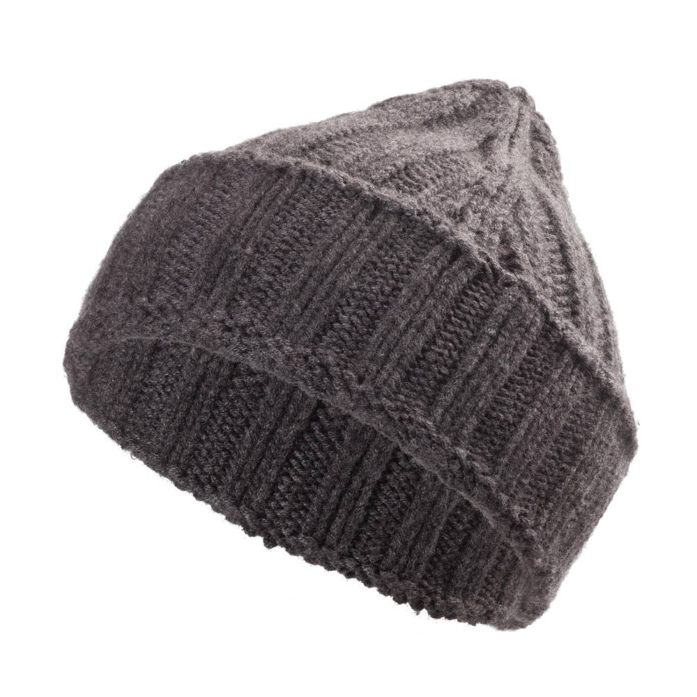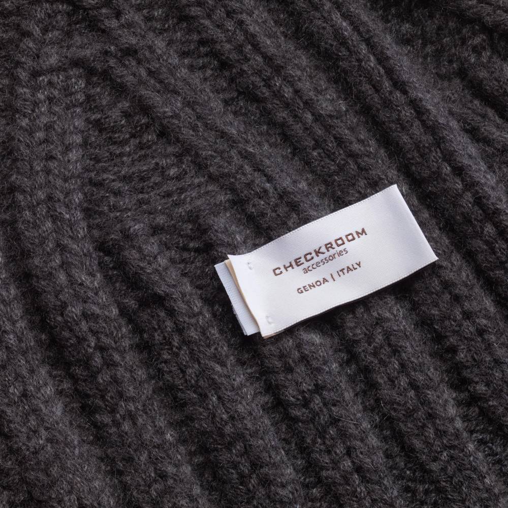 Тёплая и мягкая шапка Checkroom с отворотом связана из высококачественной кашемировой пряжи тёмно-серого цвета. Плотная нить в 4 сложения (4 ply). Крупная вязка (3 gauge). Модель создана по специальному заказу бутика Checkroom на небольшом предприятии в Генуе, которое с 1922 года специализируется на производстве продукции из кашемира. Необработанный кашемир поставляется из региона на краю пустыни Гоби от домашних коз (capra hircus). Затем на производстве в Италии красится и обрабатывается.