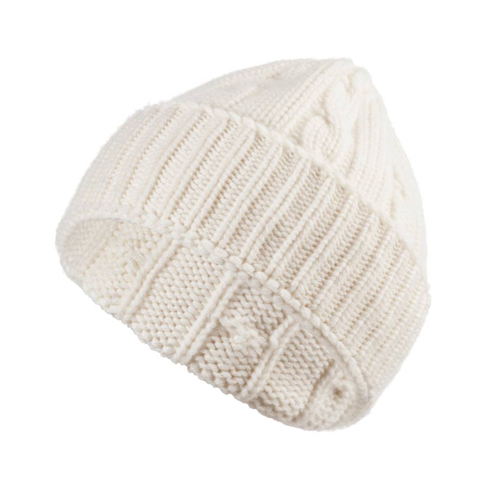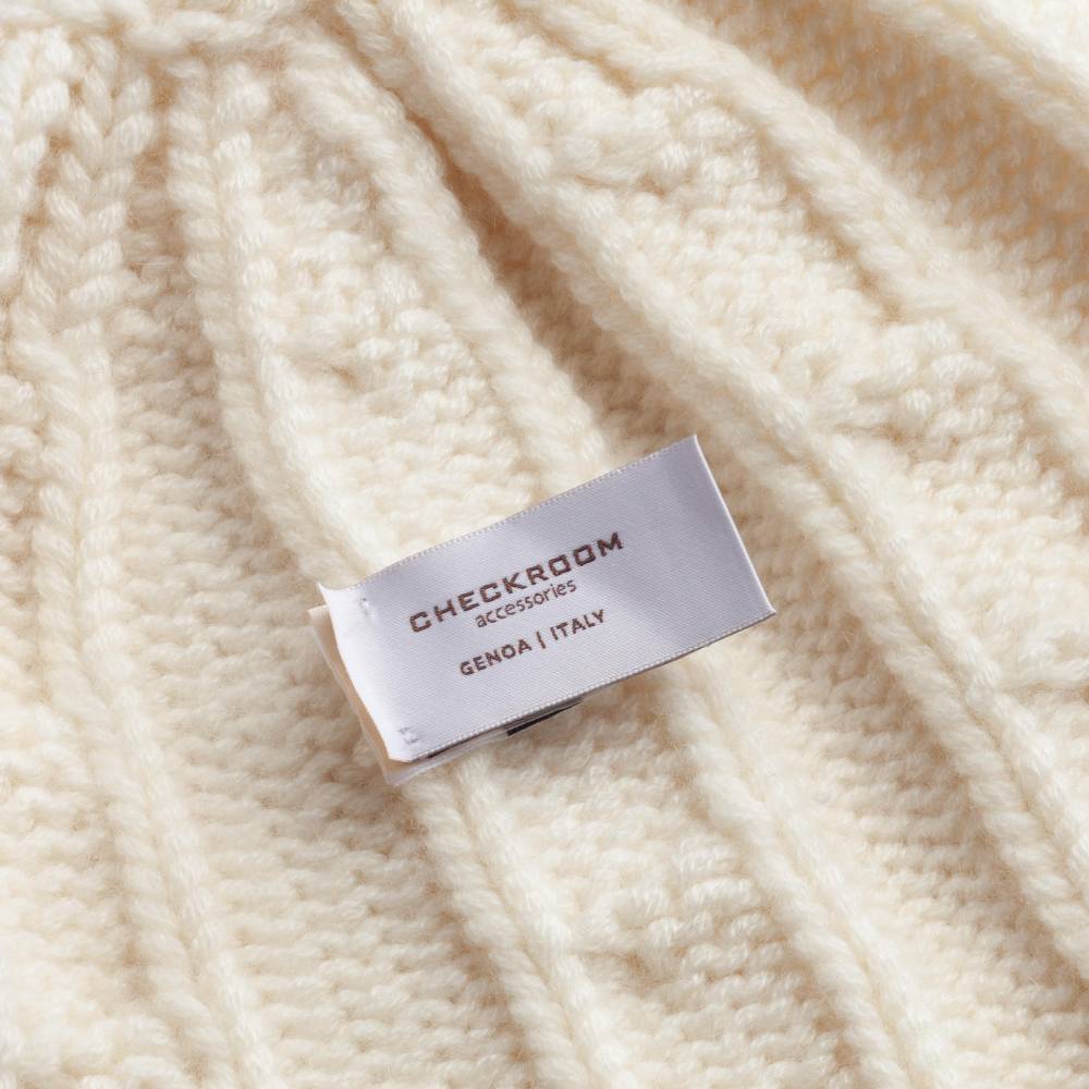 Тёплая и мягкая шапка Checkroom с отворотом связана из высококачественной кашемировой пряжи светло-бежевого цвета. Плотная нить в 4 сложения (4 ply). Крупная вязка (3 gauge). Модель создана по специальному заказу бутика Checkroom на небольшом предприятии в Генуе, которое с 1922 года специализируется на производстве продукции из кашемира. Необработанный кашемир поставляется из региона на краю пустыни Гоби от домашних коз (capra hircus). Затем на производстве в Италии красится и обрабатывается.