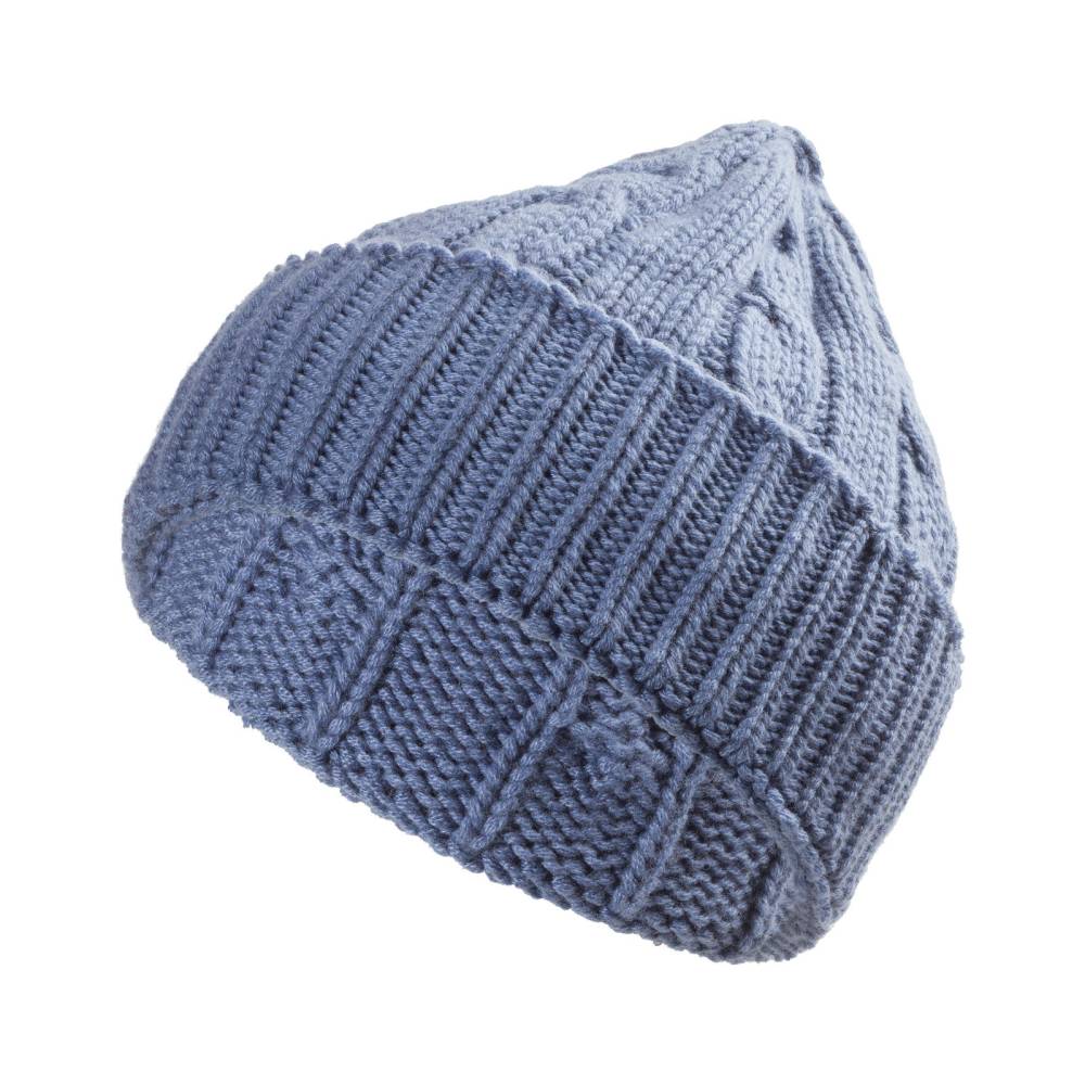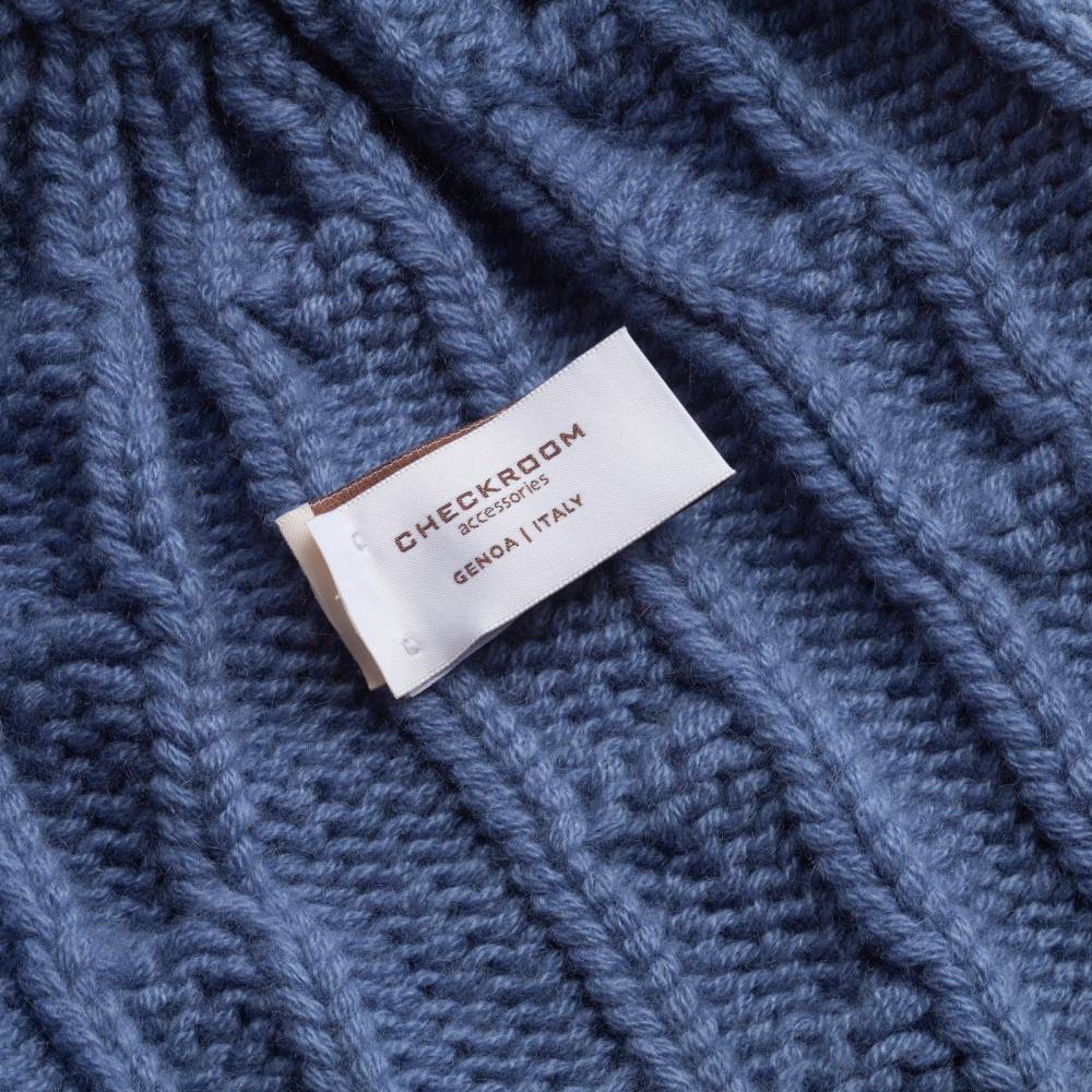 Тёплая и мягкая шапка Checkroom с отворотом связана из высококачественной кашемировой пряжи светло-синего цвета. Плотная нить в 4 сложения (4 ply). Крупная вязка (3 gauge). Модель создана по специальному заказу бутика Checkroom на небольшом предприятии в Генуе, которое с 1922 года специализируется на производстве продукции из кашемира. Необработанный кашемир поставляется из региона на краю пустыни Гоби от домашних коз (capra hircus). Затем на производстве в Италии красится и обрабатывается.