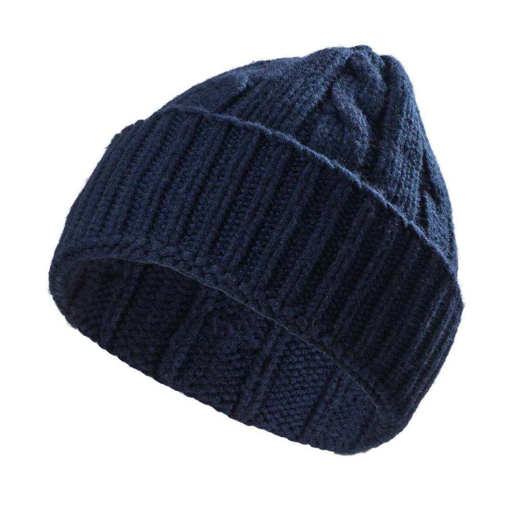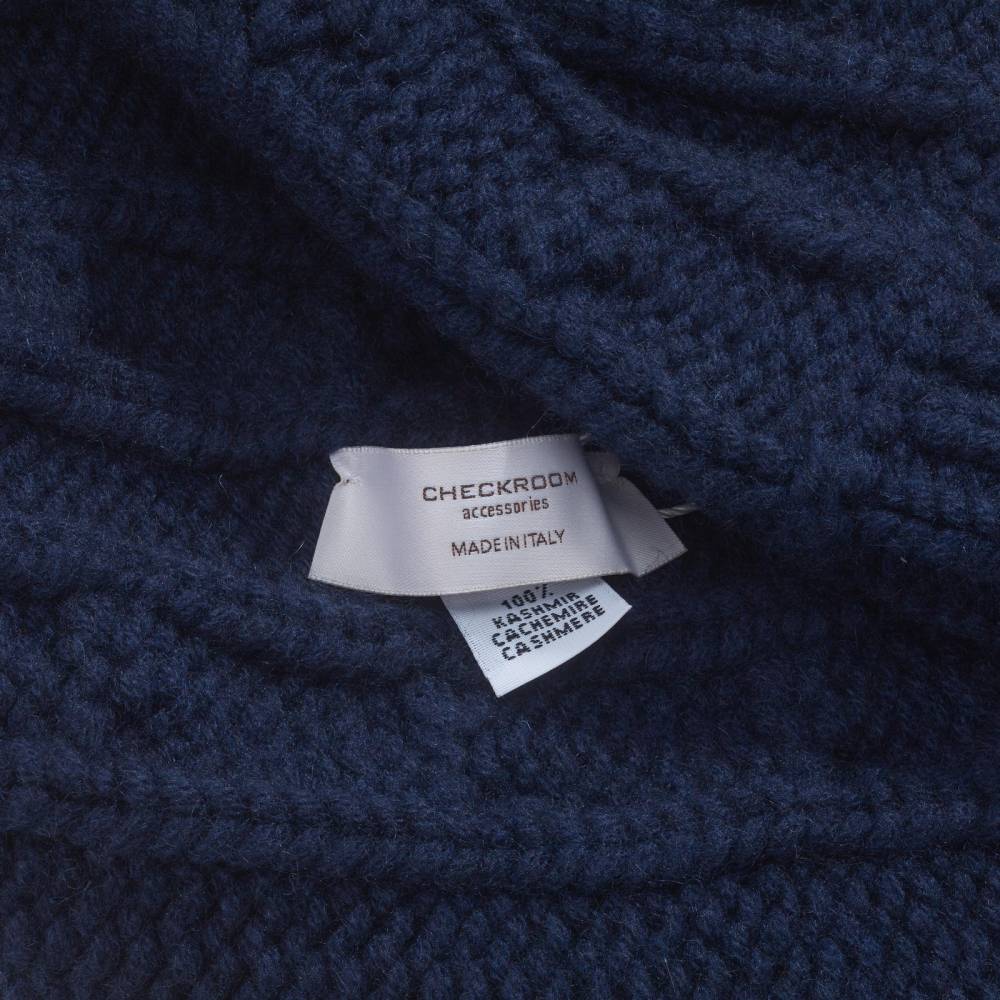 Тёплая и мягкая шапка Checkroom с отворотом связана из высококачественной кашемировой пряжи тёмно-синего цвета. Плотная нить в 4 сложения (4 ply). Крупная вязка (3 gauge). Модель создана по специальному заказу бутика Checkroom на небольшом предприятии в Генуе, которое с 1922 года специализируется на производстве продукции из кашемира. Необработанный кашемир поставляется из региона на краю пустыни Гоби от домашних коз (capra hircus). Затем на производстве в Италии красится и обрабатывается.