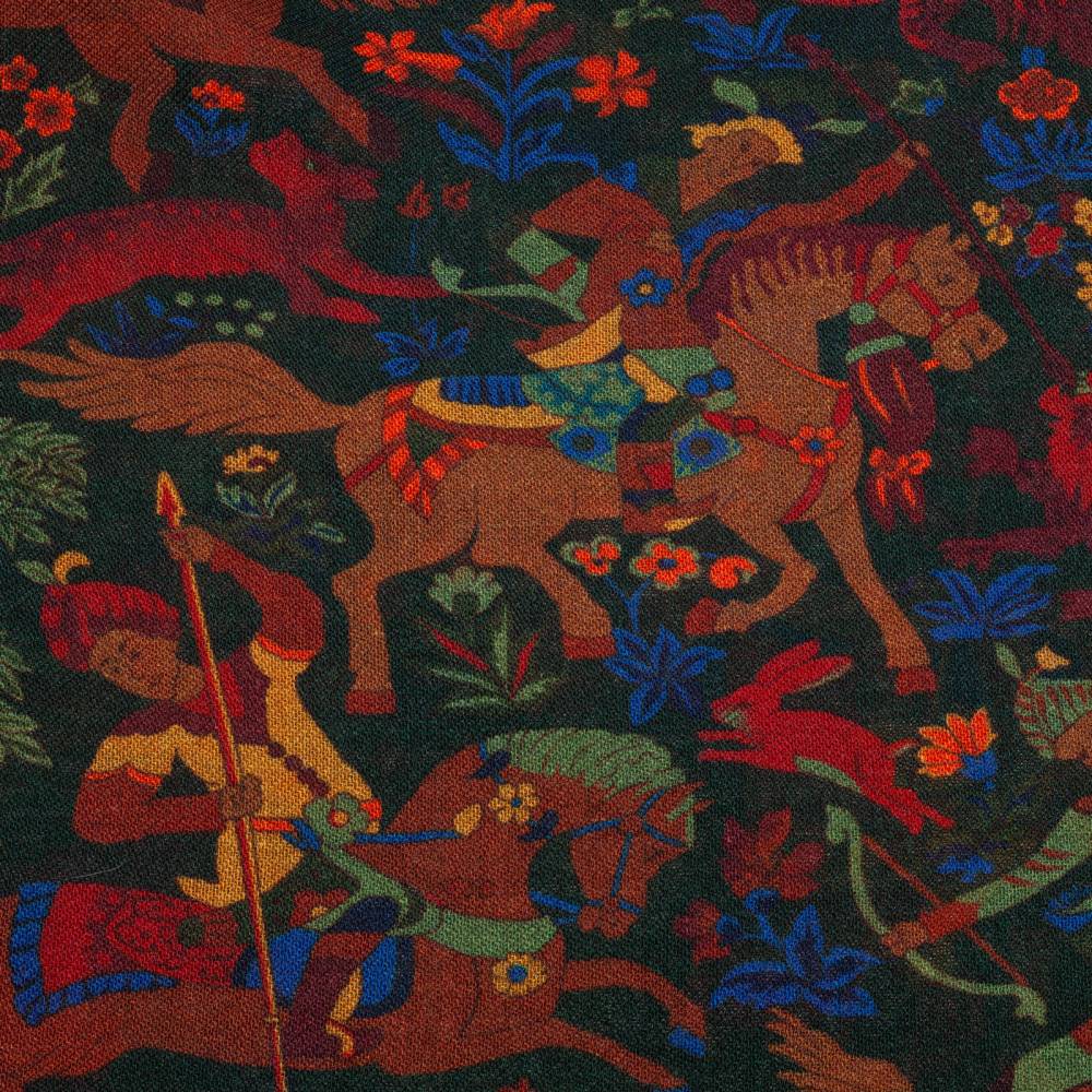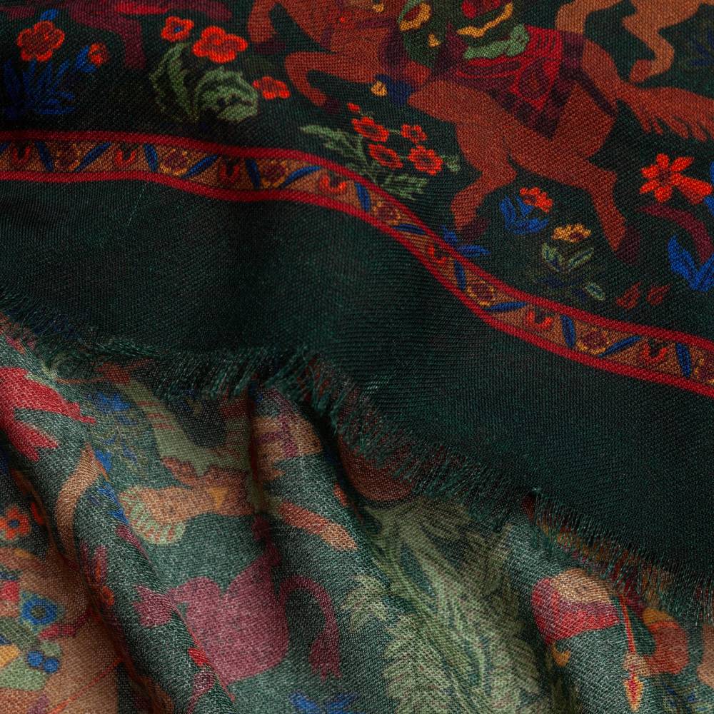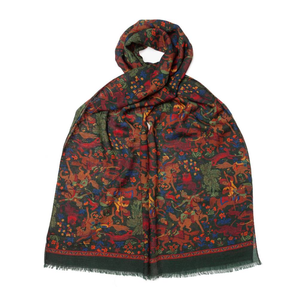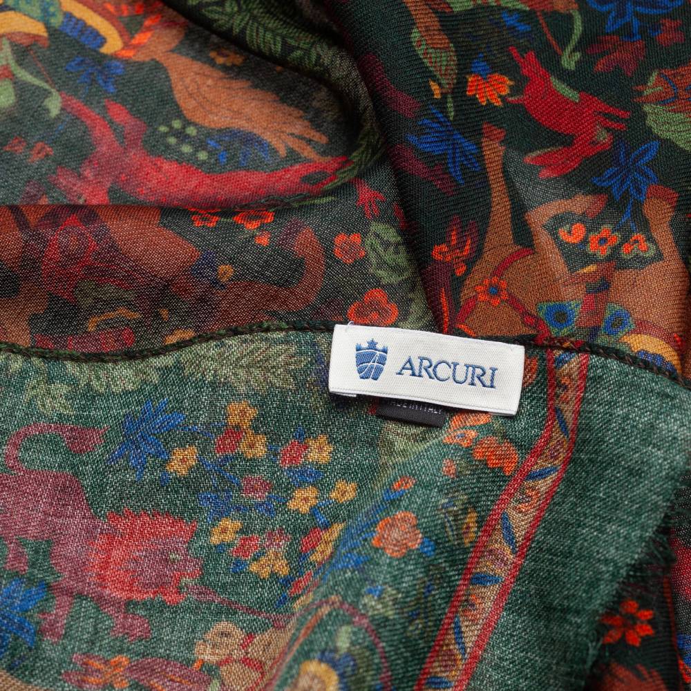 Роскошный шарф итальянского бренда Arcuri Cravatte в зелёной цветовой гамме с красочными принтам. Полотно полностью выполнено из лёгкой и нежной шерсти, за счёт чего шарф изысканным образом драпируется. Края подшиты вручную. Особый шарм аксессуару придают запоминающиеся принты со сценами охоты в экзотических джунглях. Лёгкий и приятный на ощупь, этот шарф не только согреет в прохладную погоду, но и добавит элегантный акцент практически в любой не слишком формальный образ. Благодаря размеру шарф можно комфортно повязывать всевозможными узлами и складывать необходимым образом. Модель подходит как мужчинам, так и женщинам.
