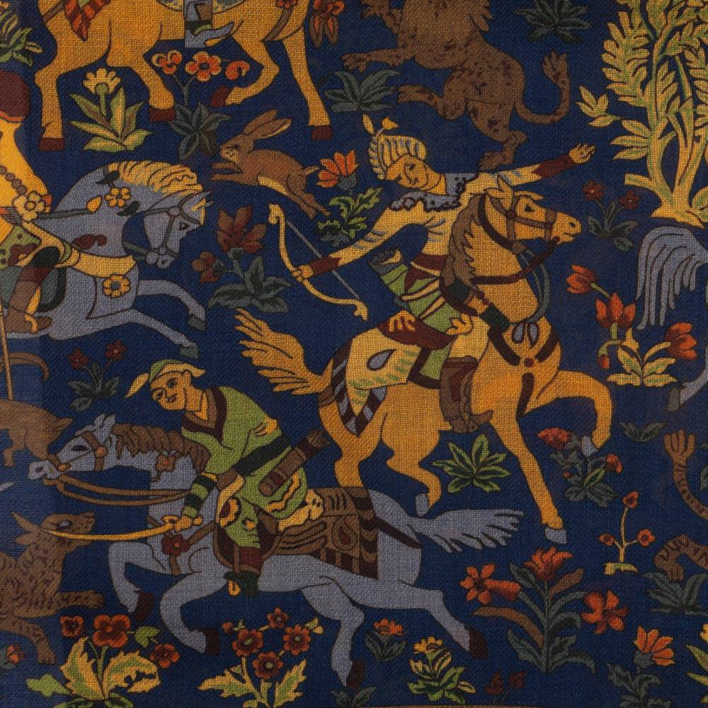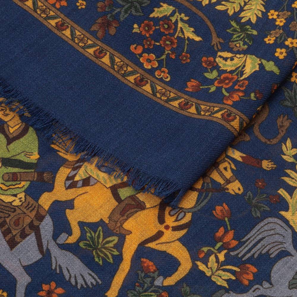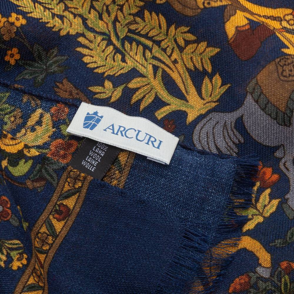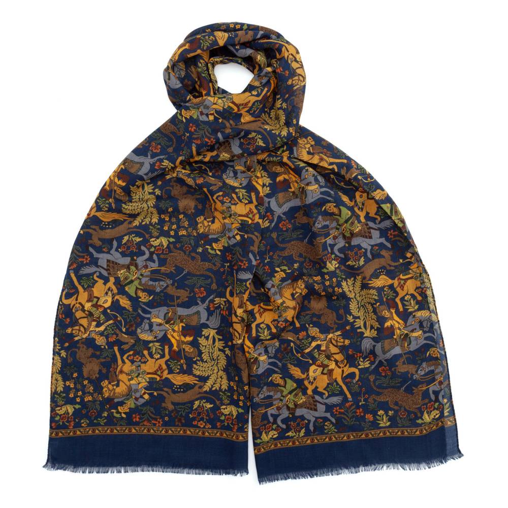 Роскошный шарф итальянского бренда Arcuri Cravatte в тёмно-синей гамме с красочными принтам. Полотно полностью выполнено из лёгкой и нежной шерсти, за счёт чего шарф изысканным образом драпируется. Края подшиты вручную. Особый шарм аксессуару придают запоминающиеся принты со сценами охоты в экзотических джунглях. Лёгкий и приятный на ощупь, этот шарф не только согреет в прохладную погоду, но и добавит элегантный акцент практически в любой не слишком формальный образ. Благодаря размеру шарф можно комфортно повязывать всевозможными узлами и складывать необходимым образом. Модель подходит как мужчинам, так и женщинам.