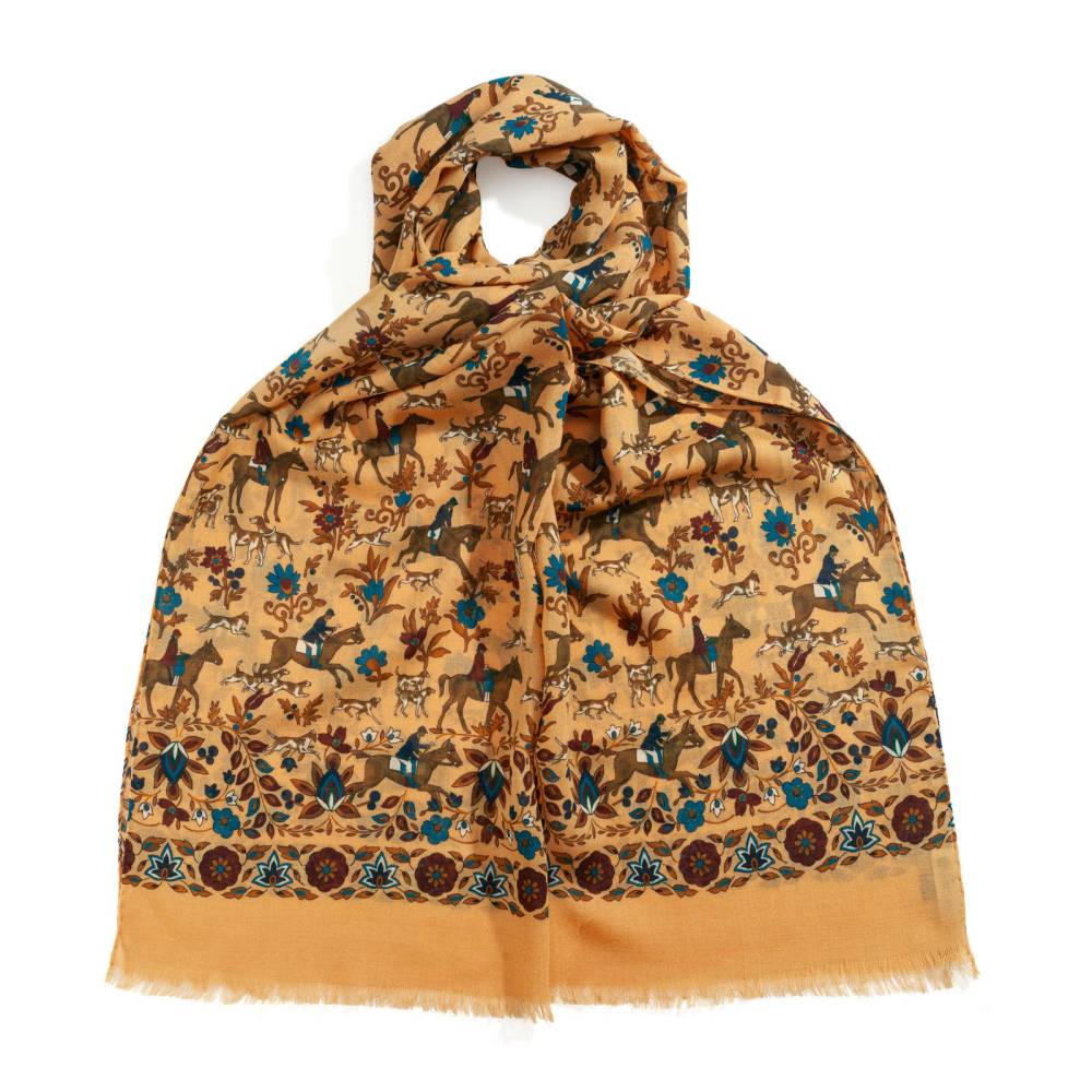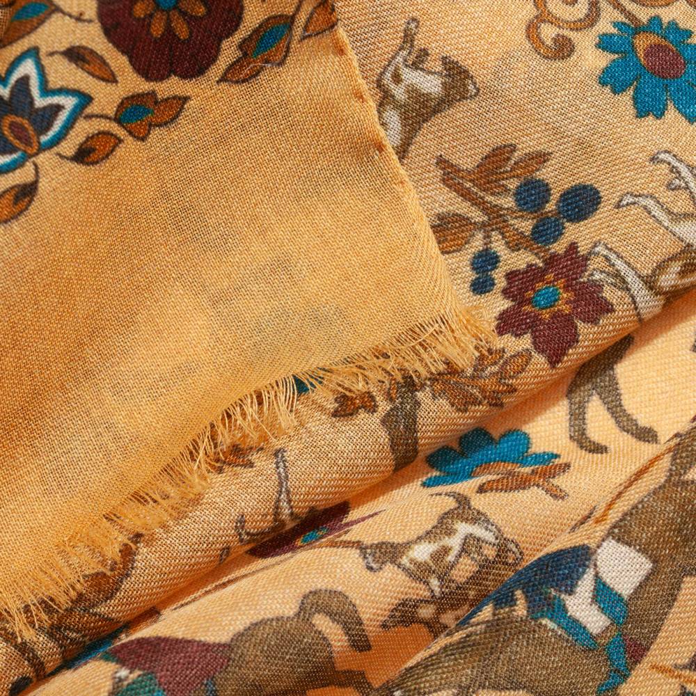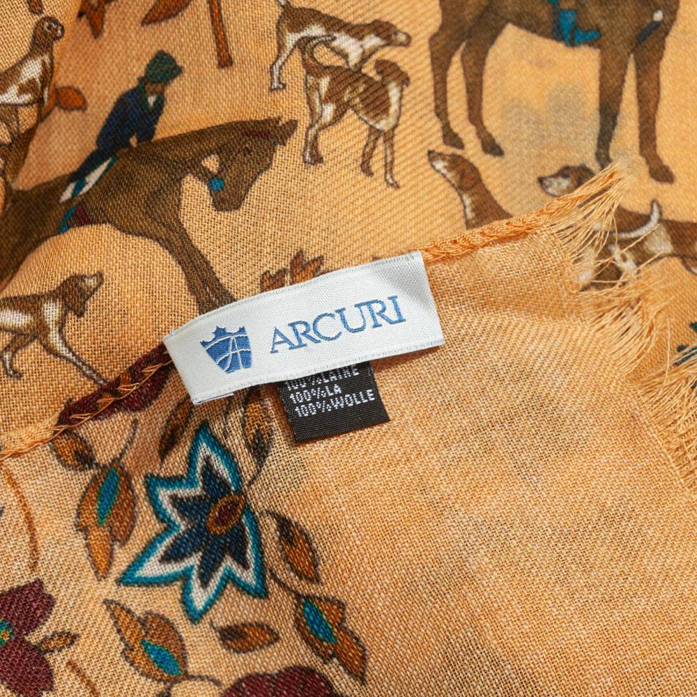 Роскошный шарф итальянского бренда Arcuri Cravatte в жёлтой цветовой гамме с красочными принтам. Полотно полностью выполнено из лёгкой и нежной шерсти, за счёт чего шарф изысканным образом драпируется. Края подшиты вручную. Особый шарм аксессуару придают принты в виде наездников и сцен охоты. Лёгкий и приятный на ощупь, этот шарф не только согреет в прохладную погоду, но и добавит элегантный акцент практически в любой не слишком формальный образ. Благодаря размеру шарф можно комфортно повязывать всевозможными узлами и складывать необходимым образом. Модель подходит как мужчинам, так и женщинам.