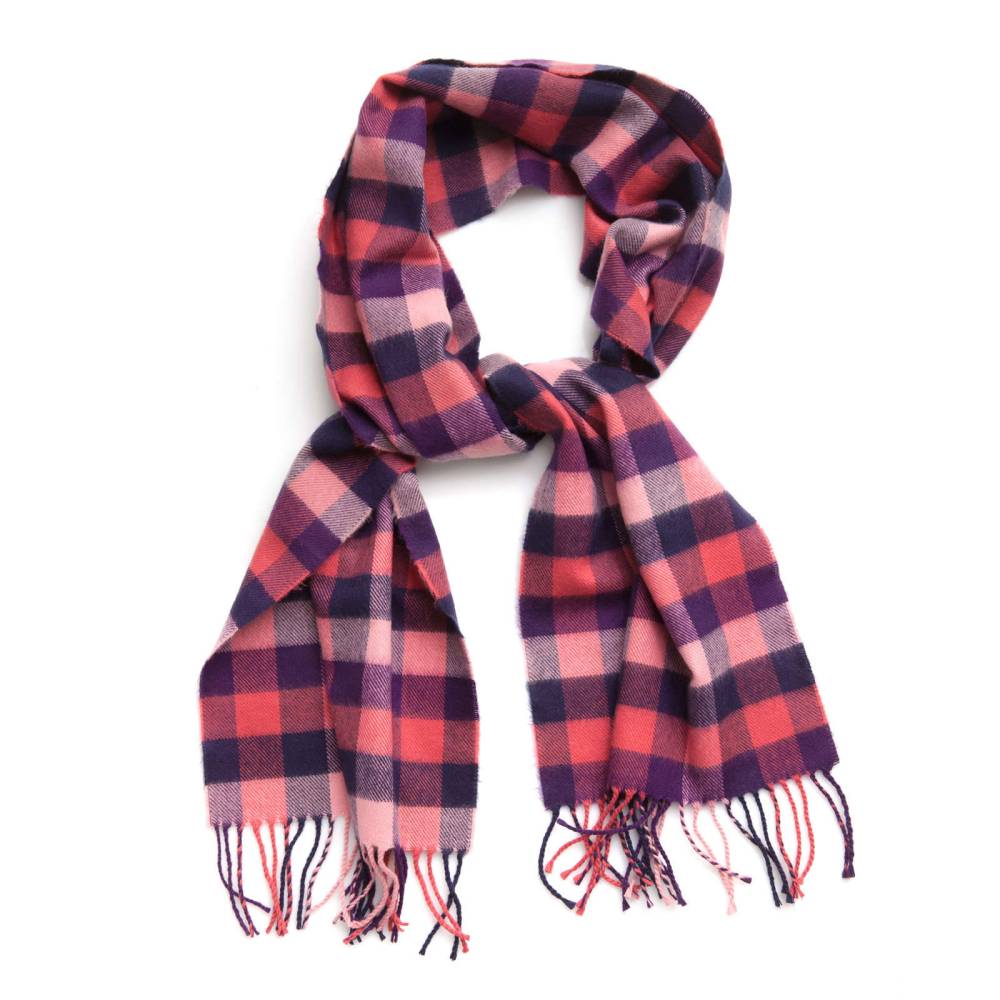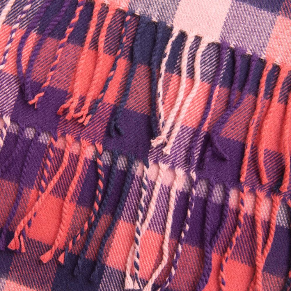Тёплый шарф с традиционным клетчатым орнаментом, состоящим из горизонтальных и вертикальных полос фиолетового и розового оттенка. Выполнен из мягкого высококачественного английского кашемира. По краям шарф украшен бахромой.