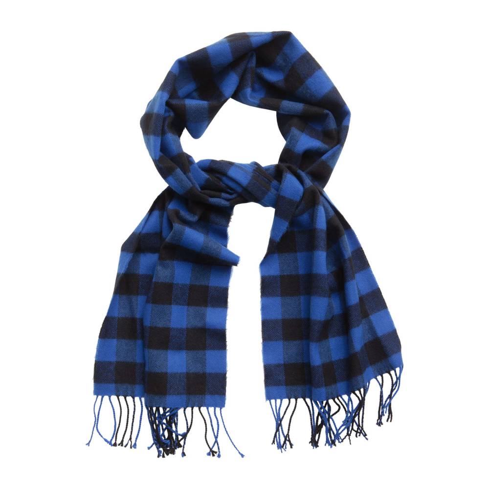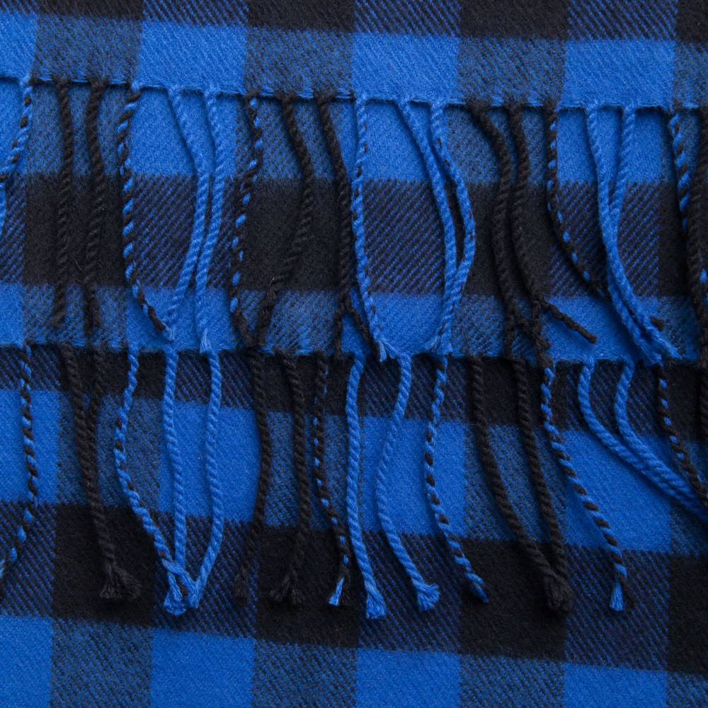 Тёплый шарф с традиционным клетчатым орнаментом, состоящим из горизонтальных и вертикальных полос в синей цветовой гамме. Выполнен из мягкого высококачественного английского кашемира. По краям шарф украшен бахромой.
