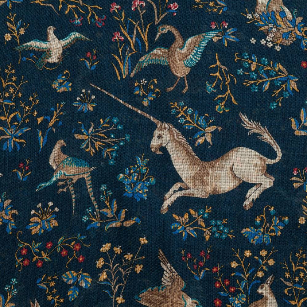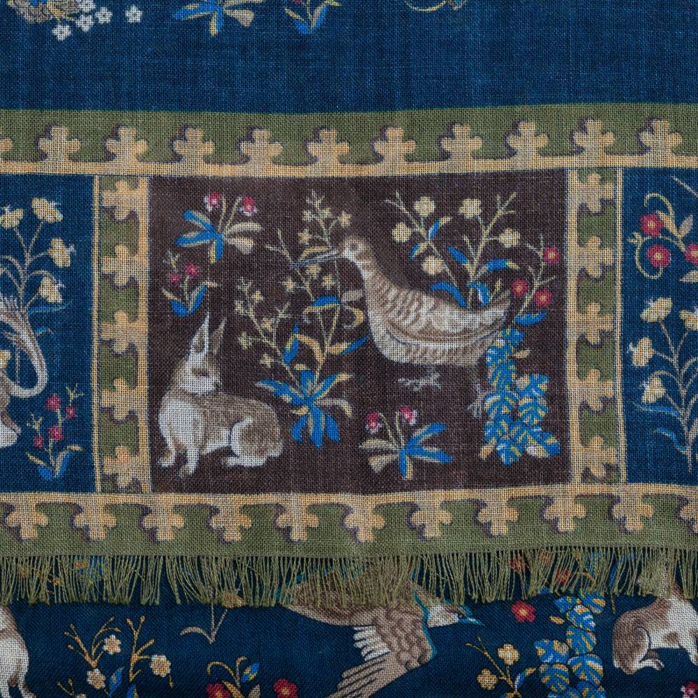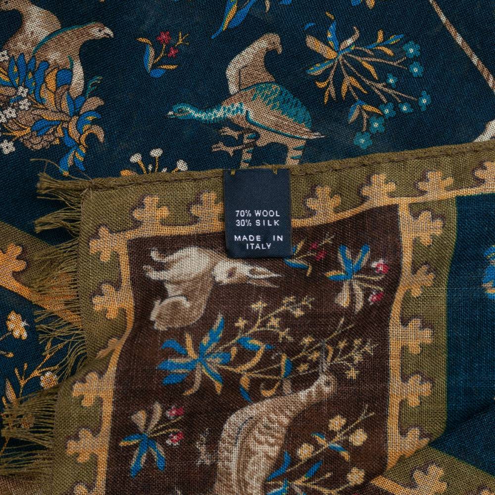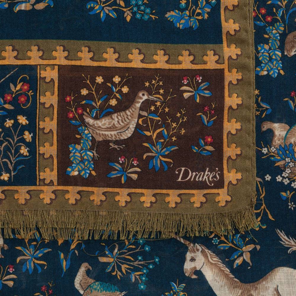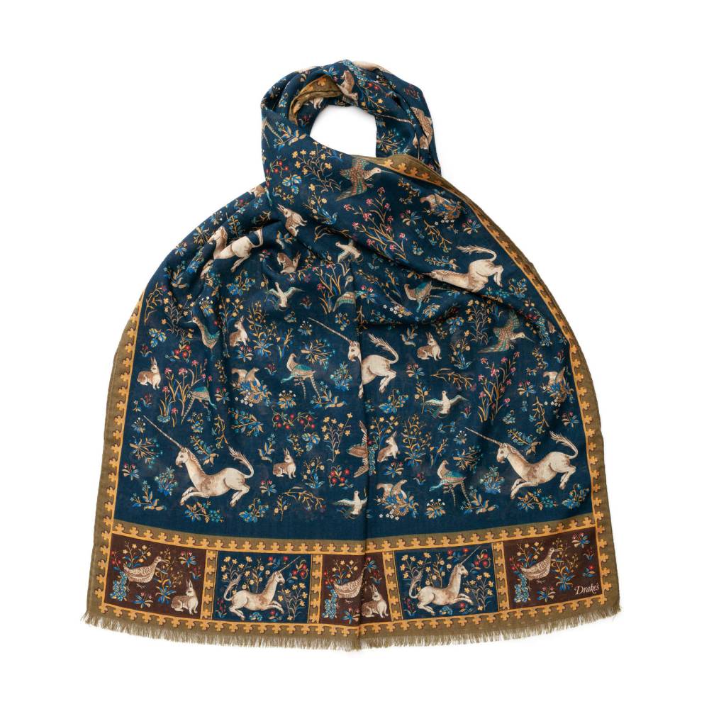 Элегантный мужской шарф в тёмно-синей цветовой гамме с красочными принтами с изображениями единорогов. Рисунок взят из собственных архивов компании Drake’s. Шарф выполнен из лёгкой итальянской ткани в состав которой входят шерсть и шёлк. Лёгкий и приятный на ощупь, этот шарф не только согреет в прохладную погоду, но и добавит изысканный акцент практически в любой не слишком формальный образ. Размер шарфа позволит удобно повязывать его всевозможными узлами. Сделан в Италии.