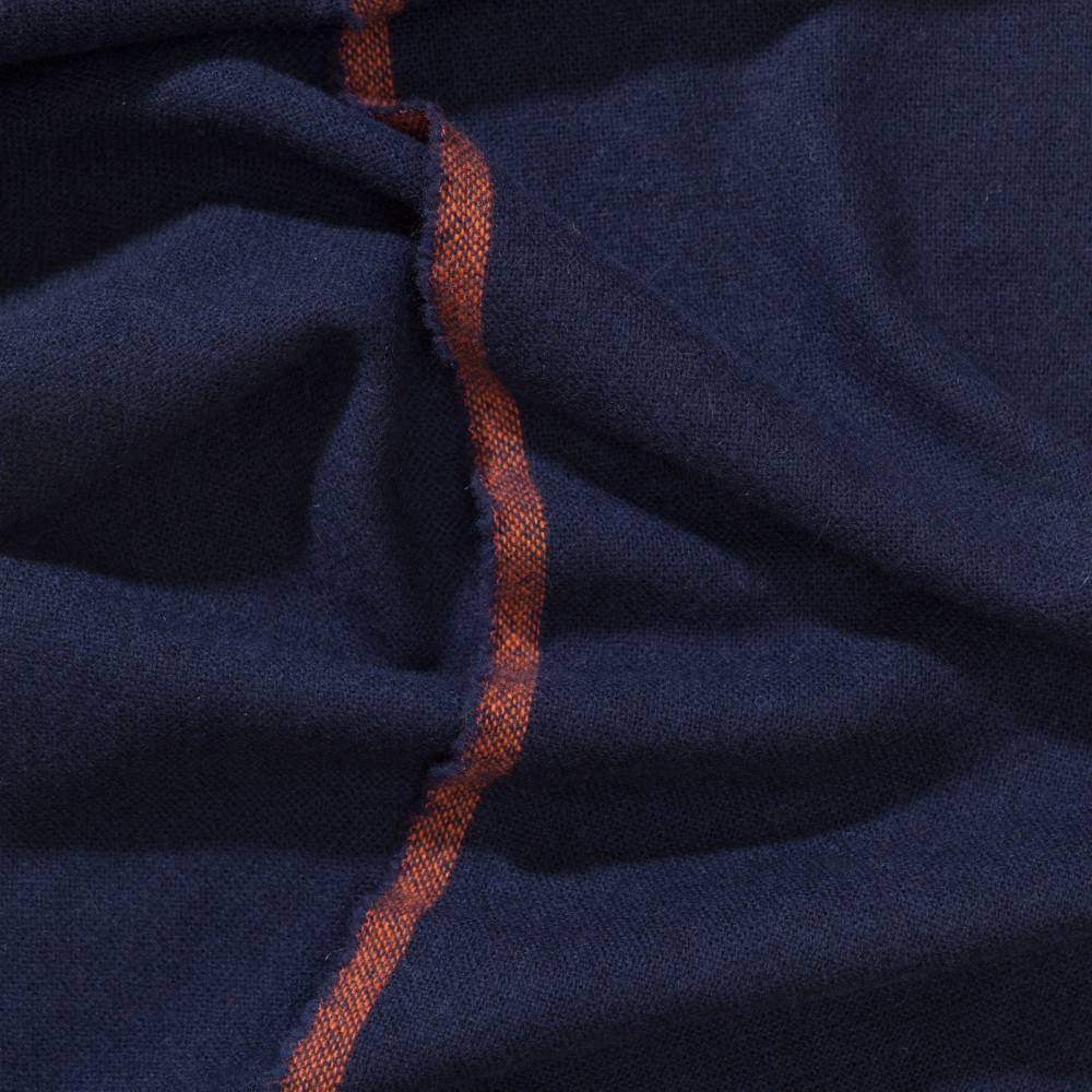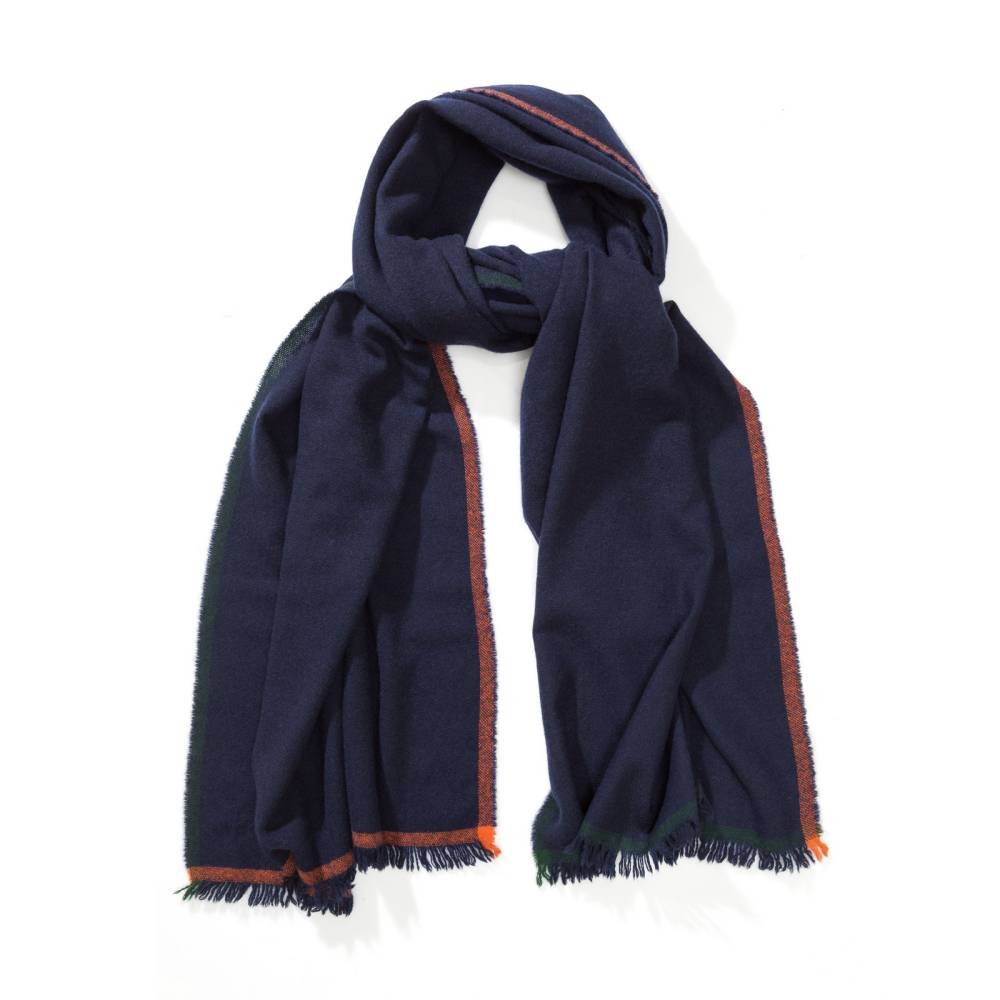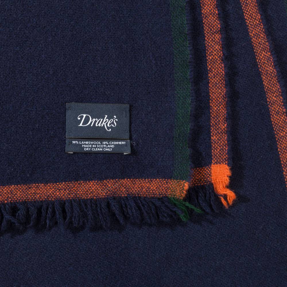Тёплый мужской шарф английского бренда Drake’s тёмно-синего цвета. Выполнен из мягкой приятной на ощупь шерсти ягнёнка с добавлением кашемира. Несмотря на лёгкость и тонкость пряжи, шарф будет согревать в холода за счёт своего размера. Его можно повязать множеством различных способов и складывать в несколько слоёв. Простой, но в то же время стильный и универсальный мужской аксессуар для холодной погоды. Подойдёт как к формальному гардеробу, так и стилю кэжуал. Сделано в Шотландии.