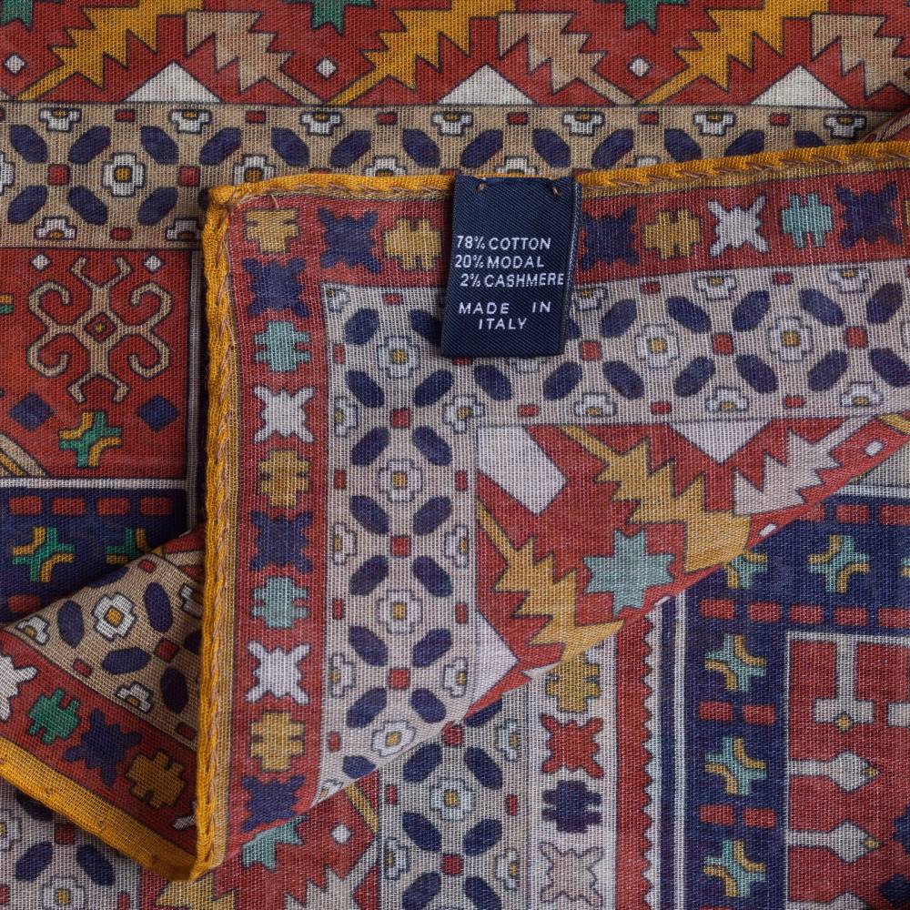 Элегантный мужской шарф в красной цветовой гамме с красочным этническим орнаментом. Лёгкий и приятный на ощупь, этот шарф не только согреет прохладным летним вечером, но и добавит элегантный акцент практически в любой не слишком формальный образ. Шарф удобно повязывать всевозможными узлами, а итальянская ткань, в состав которой входят хлопок и модал с добавлением кашемира, позволяет ему изысканным образом драпироваться. Сделан в Италии.