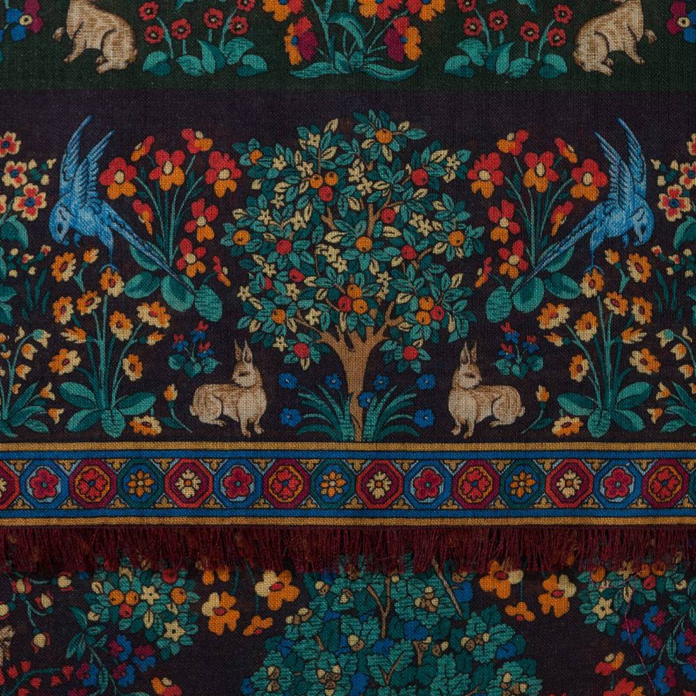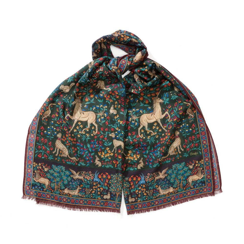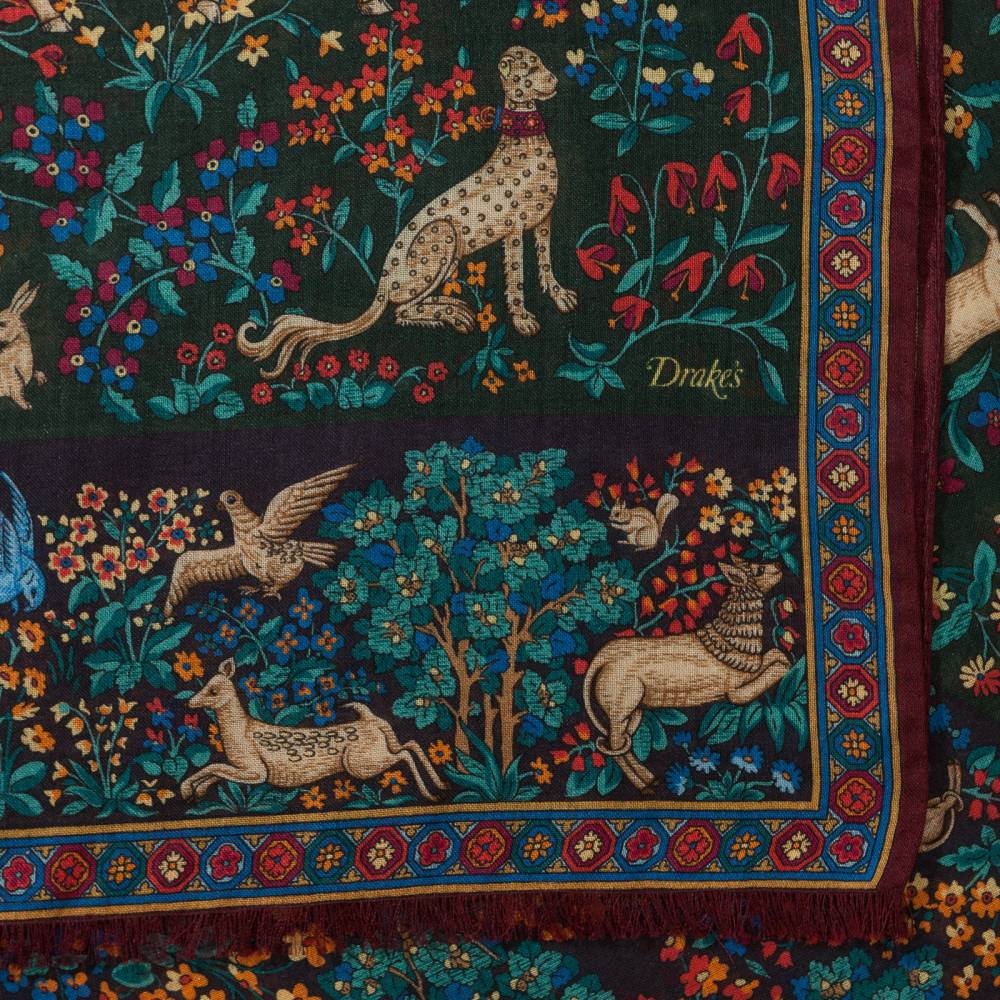 Элегантный мужской шарф в бордовой цветовой гамме с красочными принтами в могольском стиле с мифическими персонажами леса. Рисунок взят из собственных архивов компании Drake’s. Шарф выполнен из лёгкой итальянской ткани в состав которой входят шерсть и шёлк. Лёгкий и приятный на ощупь, этот шарф не только согреет в прохладную погоду, но и добавит изысканный акцент практически в любой не слишком формальный образ. Размер шарфа позволит удобно повязывать его всевозможными узлами. Сделан в Италии.