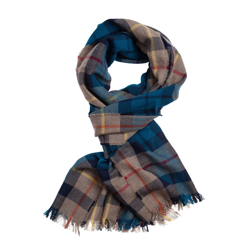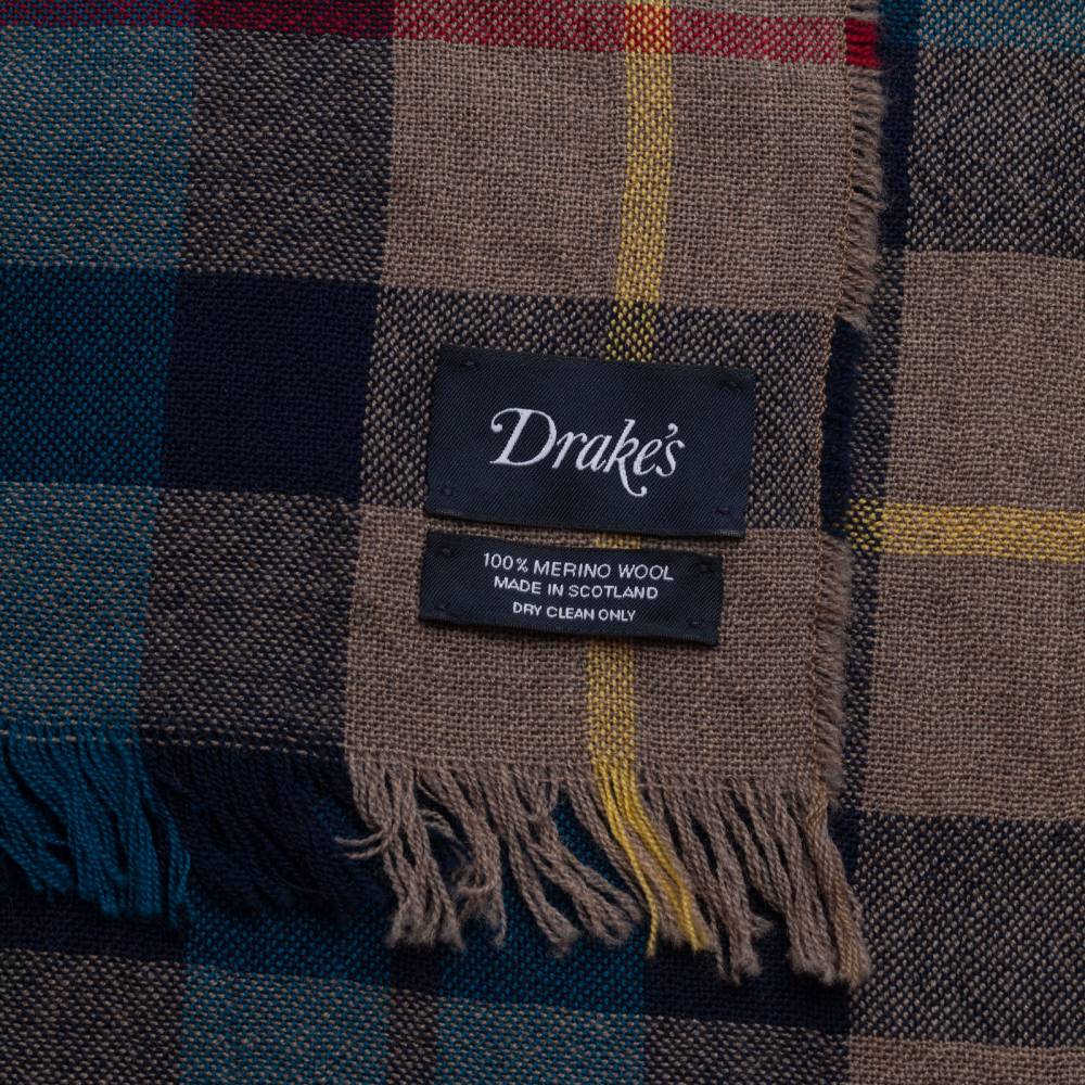 Тёплый мужской шарф английского бренда Drake’s бежевого цвета с клетчатым узором в синих тонах. Полностью выполнен из тонкой приятной на ощупь мериносовой шерсти. Несмотря на лёгкость и тонкость пряжи, шарф будет согревать в холода за счёт своего размера. Его можно повязать множеством различных способов и складывать в несколько слоёв. Простой, но в то же время стильный и универсальный мужской аксессуар для холодной погоды. Подойдёт как к формальному гардеробу, так и стилю кэжуал. Сделано в Шотландии.