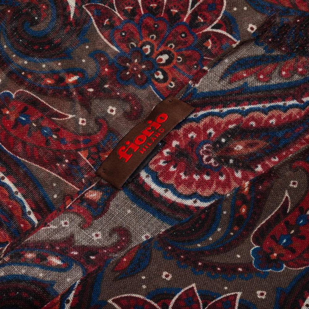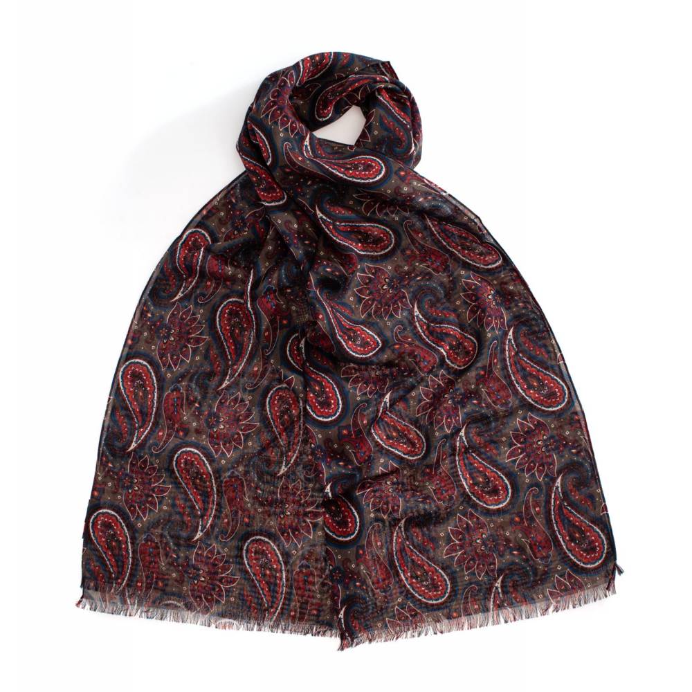 Лёгкий мужской шарф Fiorio, сотканный из высококачественной шерстяной пряжи. Приятный на ощупь, мягкий и практичный аксессуар не только согреет в прохладную погоду, но подойдёт практически к любому классическому образу, добавив ненавязчивый акцент. Полотно украшено крупными яркими узорами пейсли. Размер шарфа позволит удобно повязывать его всевозможными узлами. К аксессуару прилагается фирменный подарочный конверт.